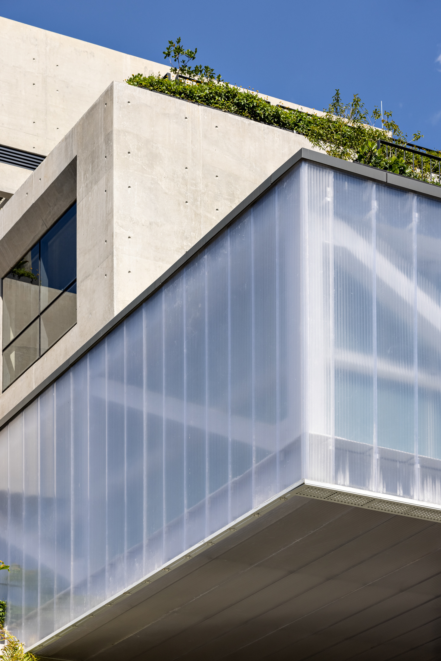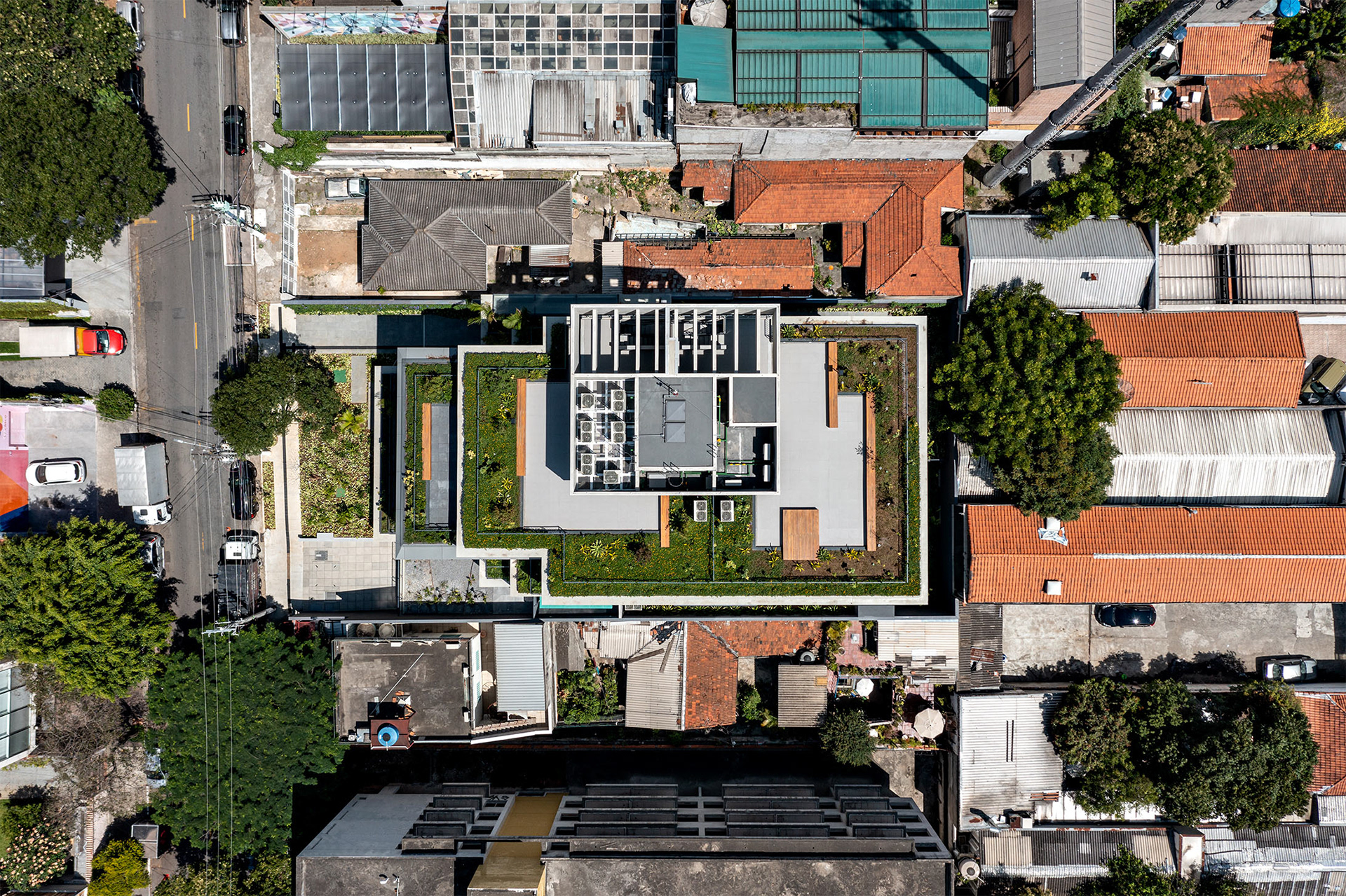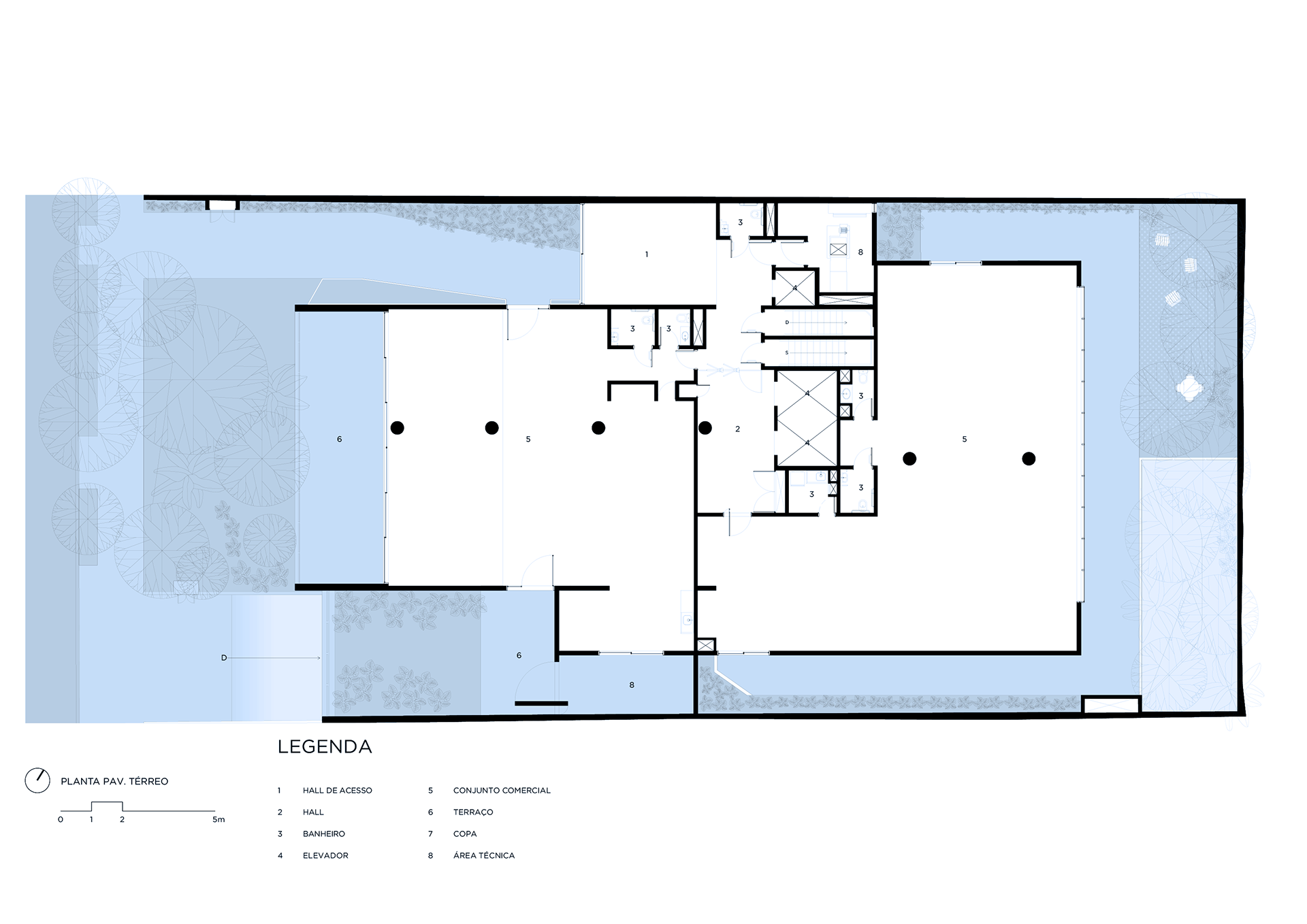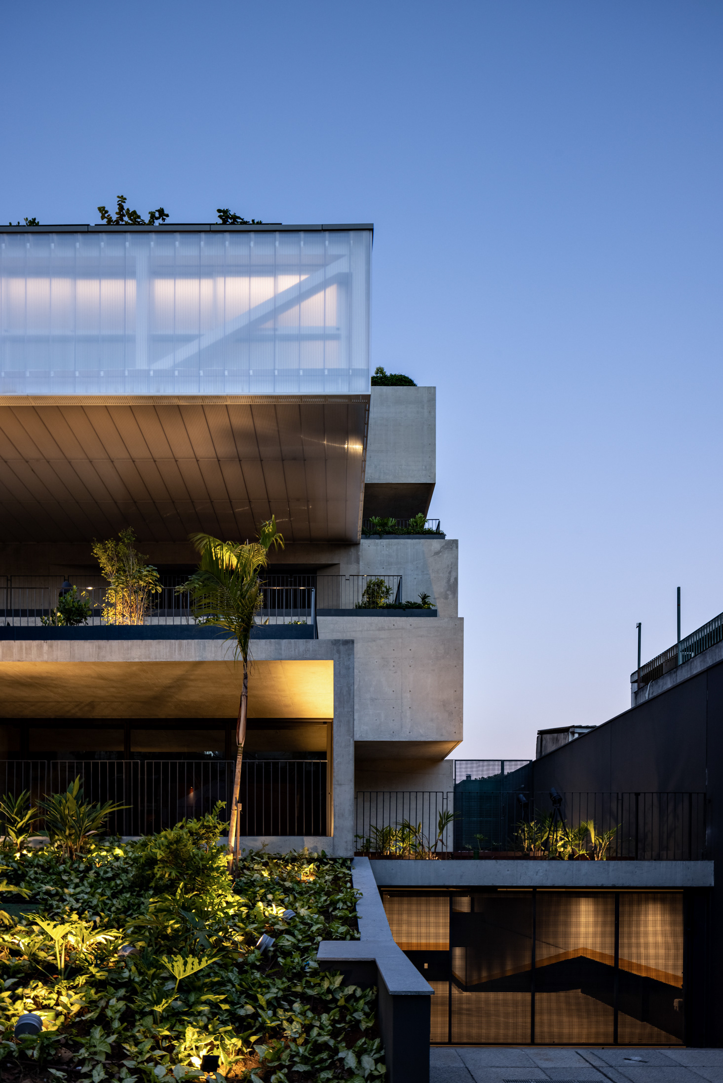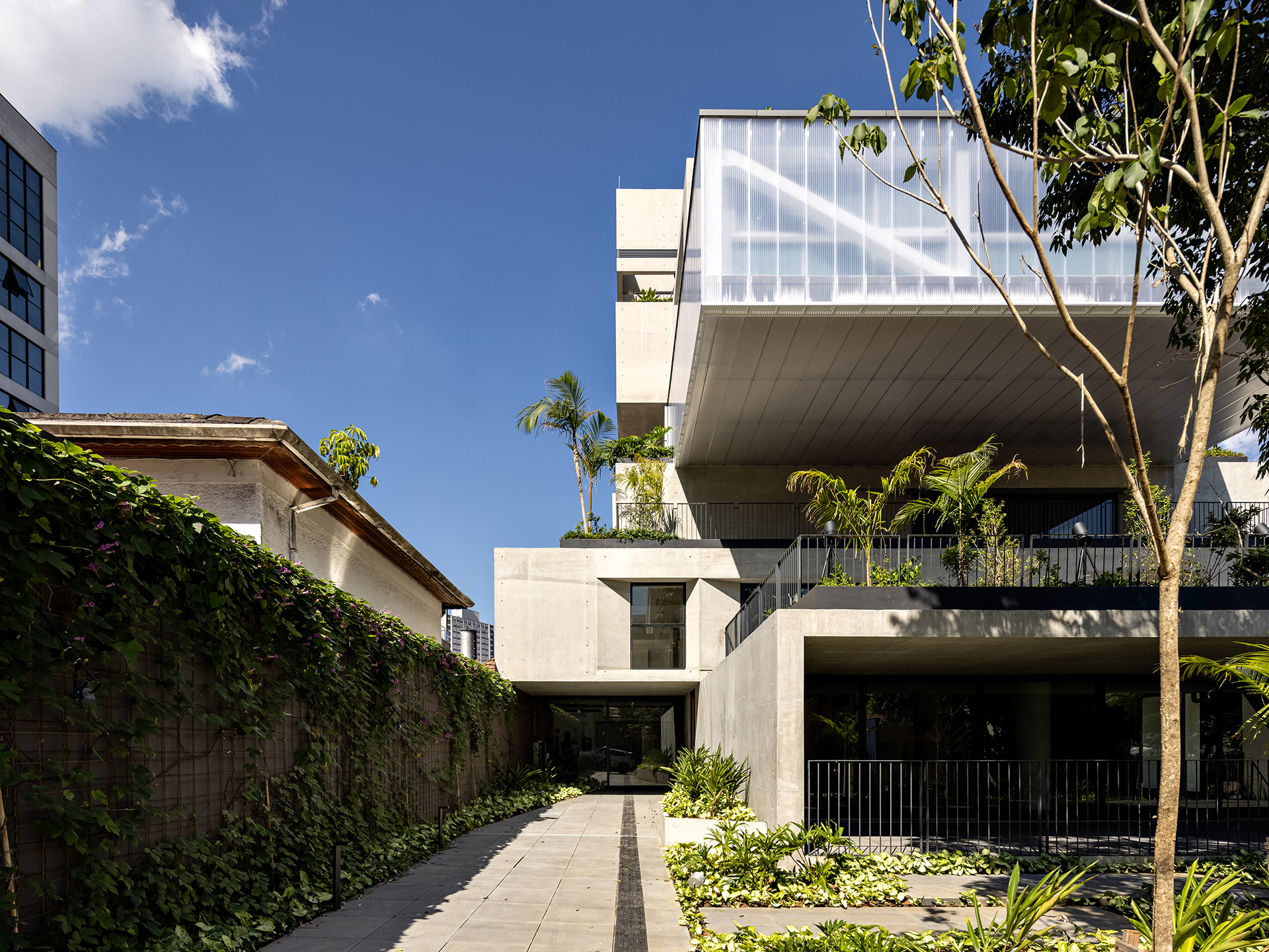 The building’s volumetric design was conceived using rectangles with either single or double heights, projecting outward as balconies, calculated according to regulations floor by floor. Above these balconies, extensive planters with large trees, designed by Rodrigo Oliveira, aim to integrate landscaping at various levels of the building while enhancing the greenery on Cardeal Arcoverde, which is quite sparse. The same balcony volumes, nearly zeroed out, are combined with window panels that either open like casement windows or slide open, contributing to the building’s overall appearance. On the ground floor, wide setbacks create necessary pedestrian space at this important corner, which currently suffers from minimal sidewalks.