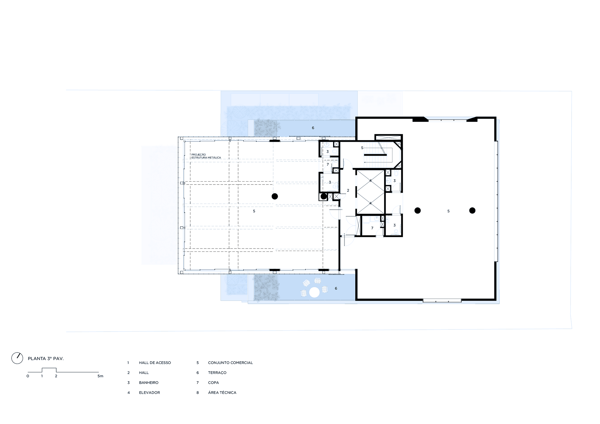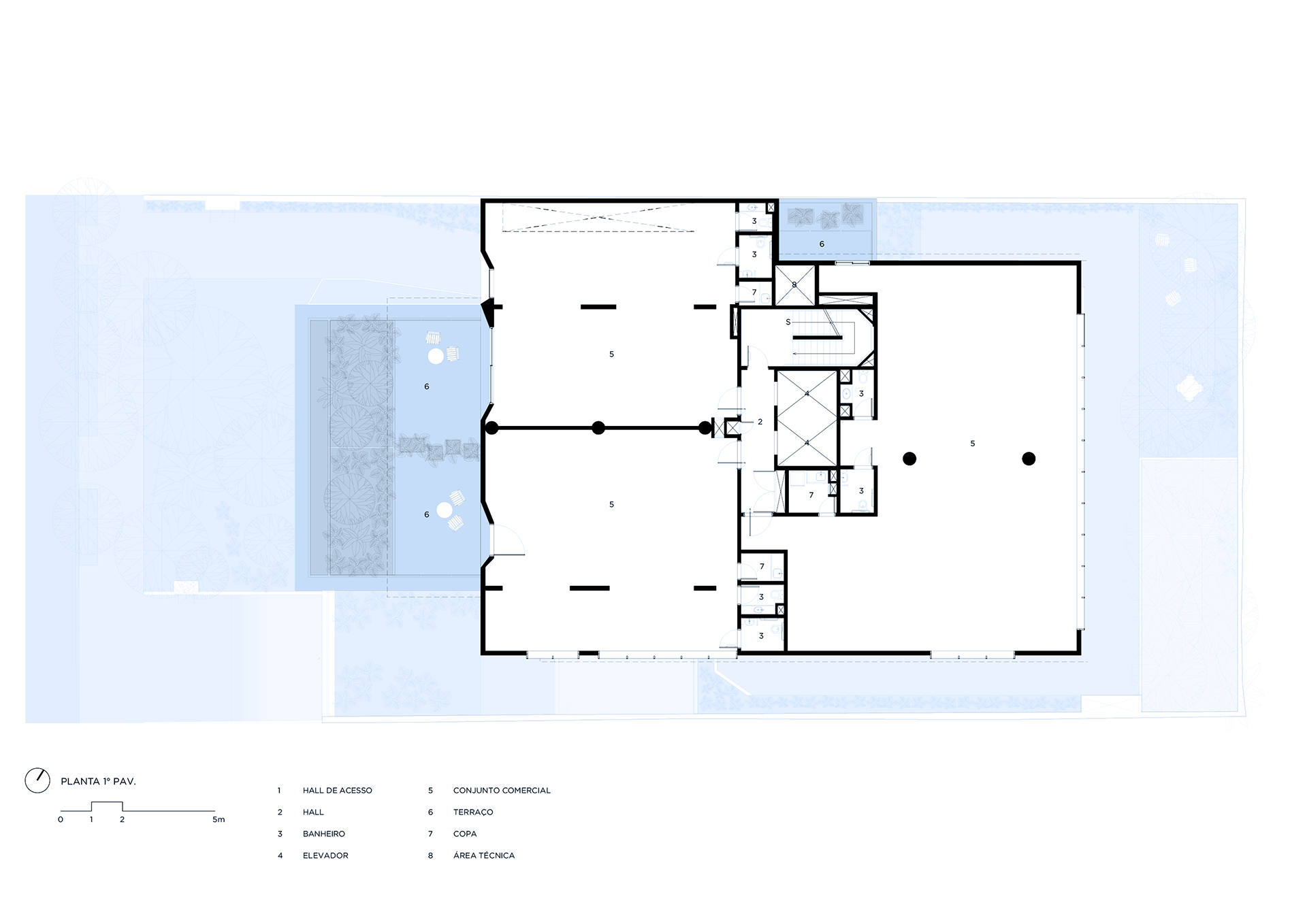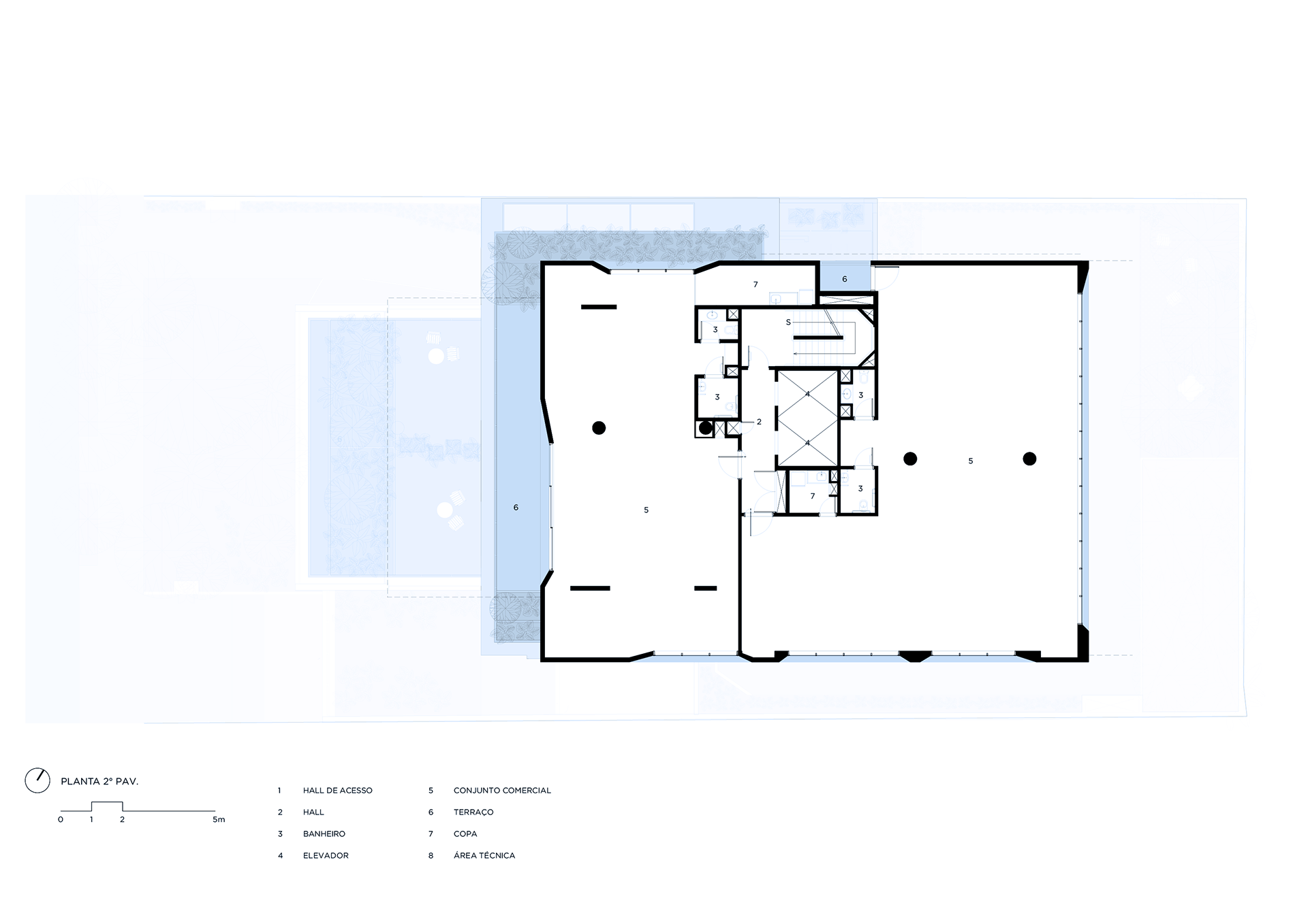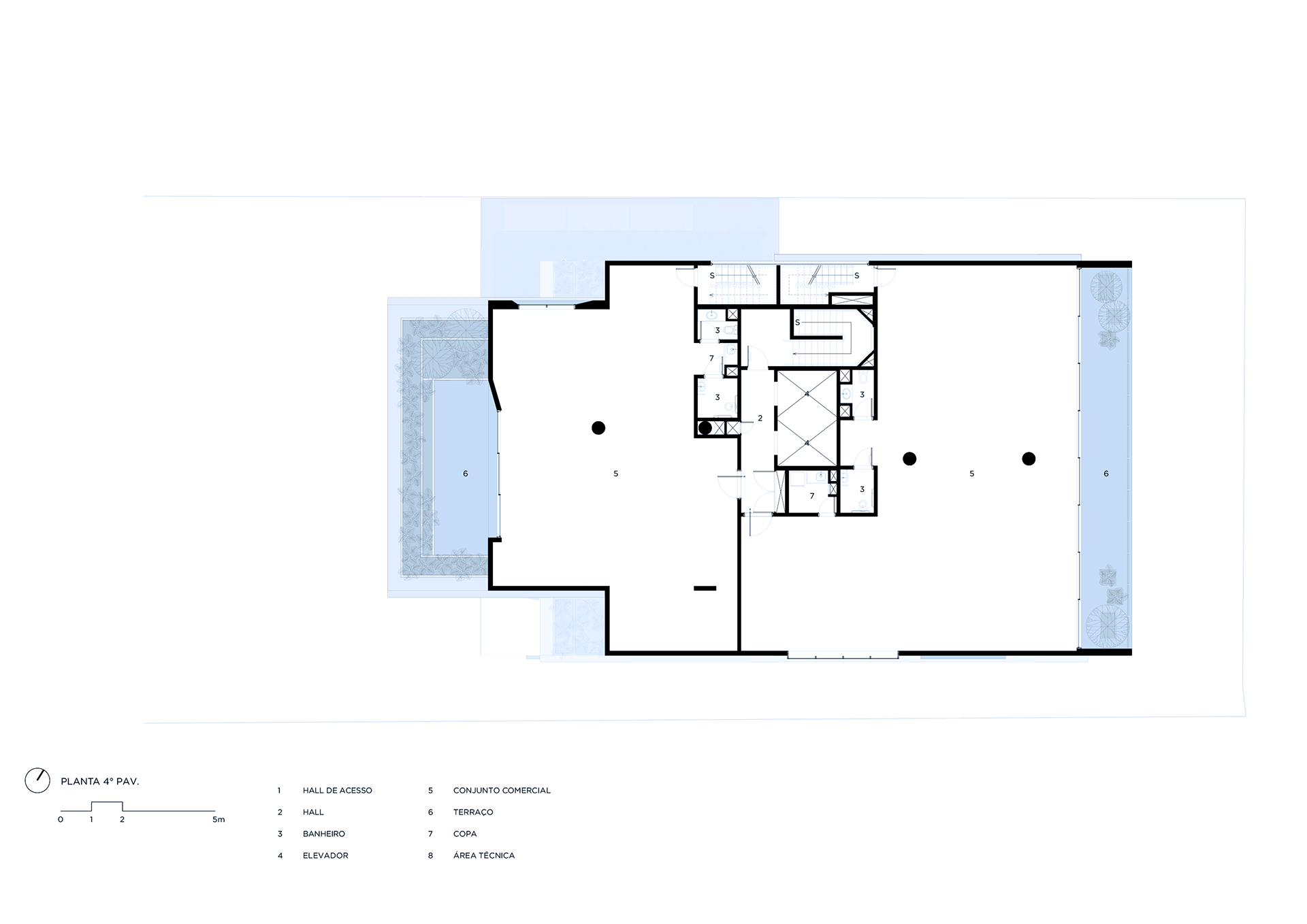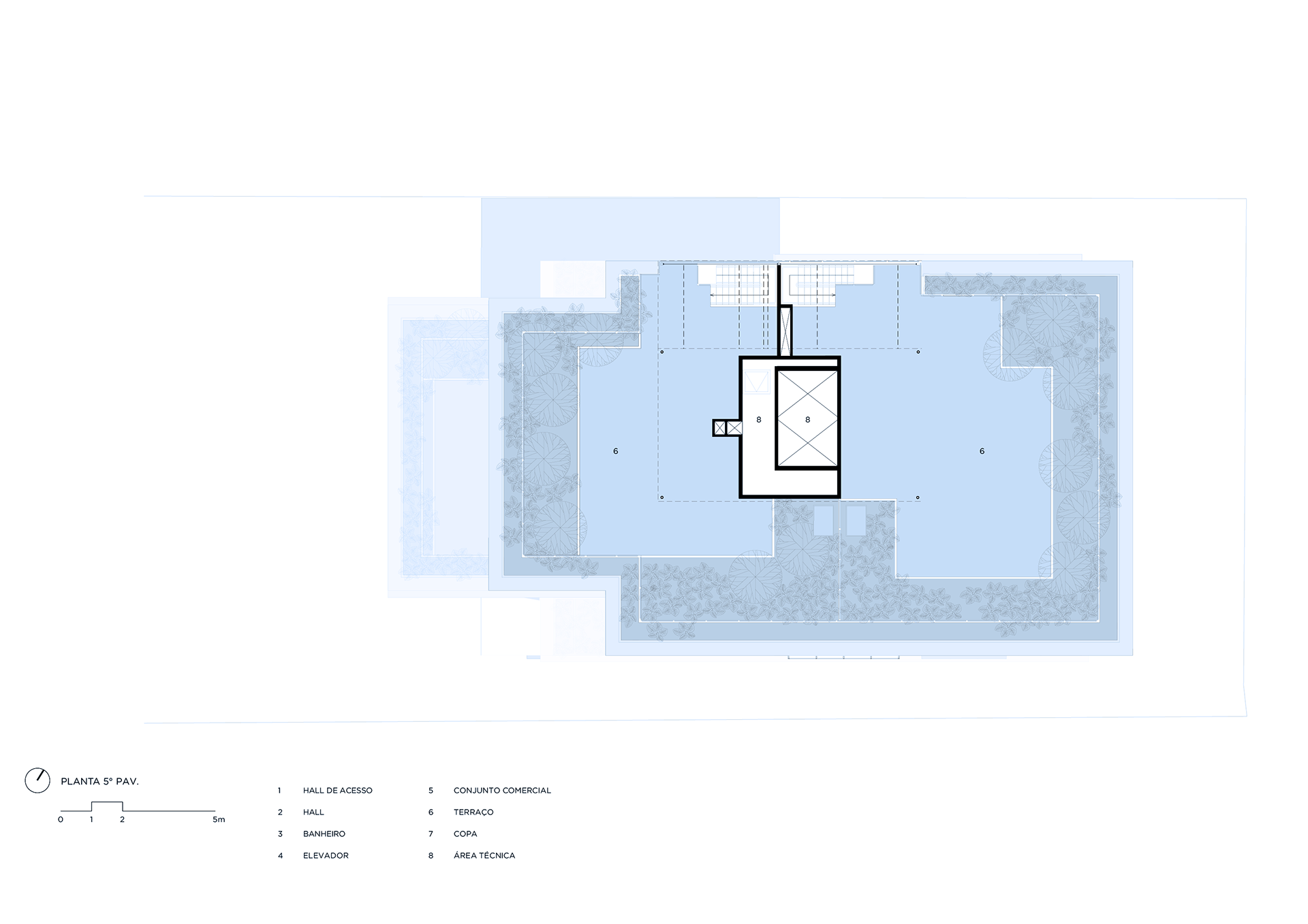 The building’s volumetric design was conceived using rectangles with either single or double heights, projecting outward as balconies, calculated according to regulations floor by floor. Above these balconies, extensive planters with large trees, designed by Rodrigo Oliveira, aim to integrate landscaping at various levels of the building while enhancing the greenery on Cardeal Arcoverde, which is quite sparse. The same balcony volumes, nearly zeroed out, are combined with window panels that either open like casement windows or slide open, contributing to the building’s overall appearance. On the ground floor, wide setbacks create necessary pedestrian space at this important corner, which currently suffers from minimal sidewalks.