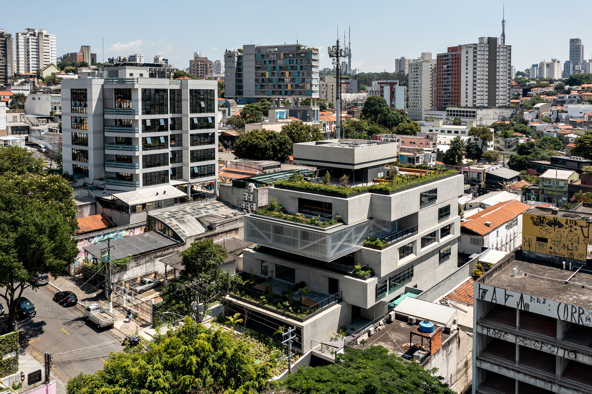 The design aimed to create corporate spaces that differ from the usual, incorporating duplex or triplex units with high ceilings and mezzanines that could be adapted to future users’ needs. The developer, Idea Zarvos, wanted to apply concepts used in the Corujas building, also designed by us, within the context of a high-rise tower featuring abundant natural light, cross-ventilation, usable balconies, and greenery.