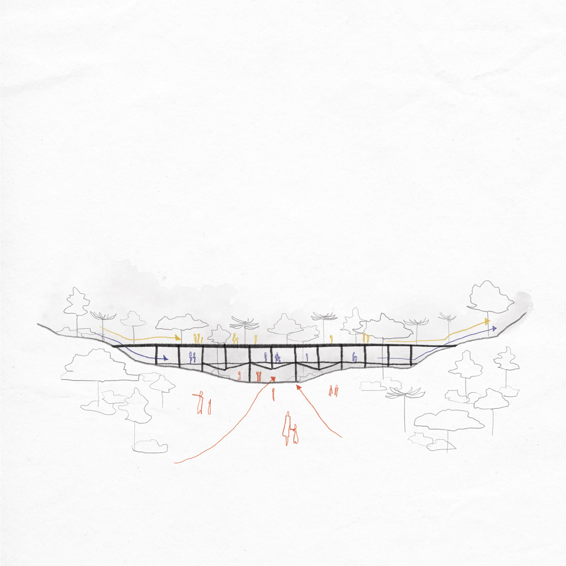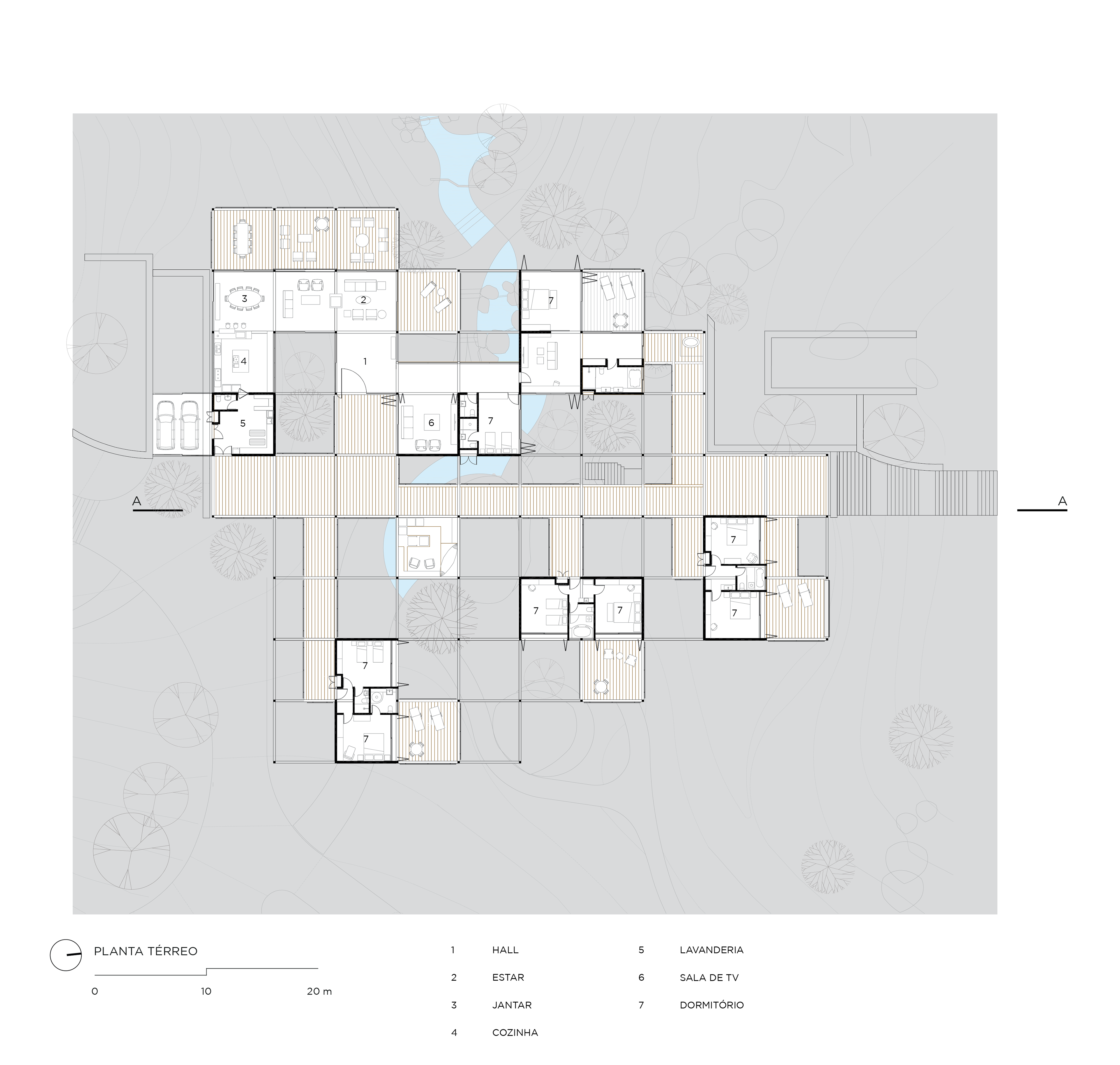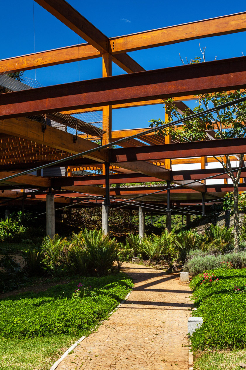 A structural grid in wood, with 5.5x5.5x3m modules, suspended above this nucleus for accesses, connects the existing paths and creates new ones. Thus, one may cross the bridge structure in three different ways: from above (the roof garden, which is a projection of the plot), from beneath (crossing a garden with water mirror and natural stones) and going via the middle of the house (crossing an external covered area). This grid has modules, some of which are taken up by closed environments; other ones are totally empty, allowing that the trees from the garden below cross the structure.