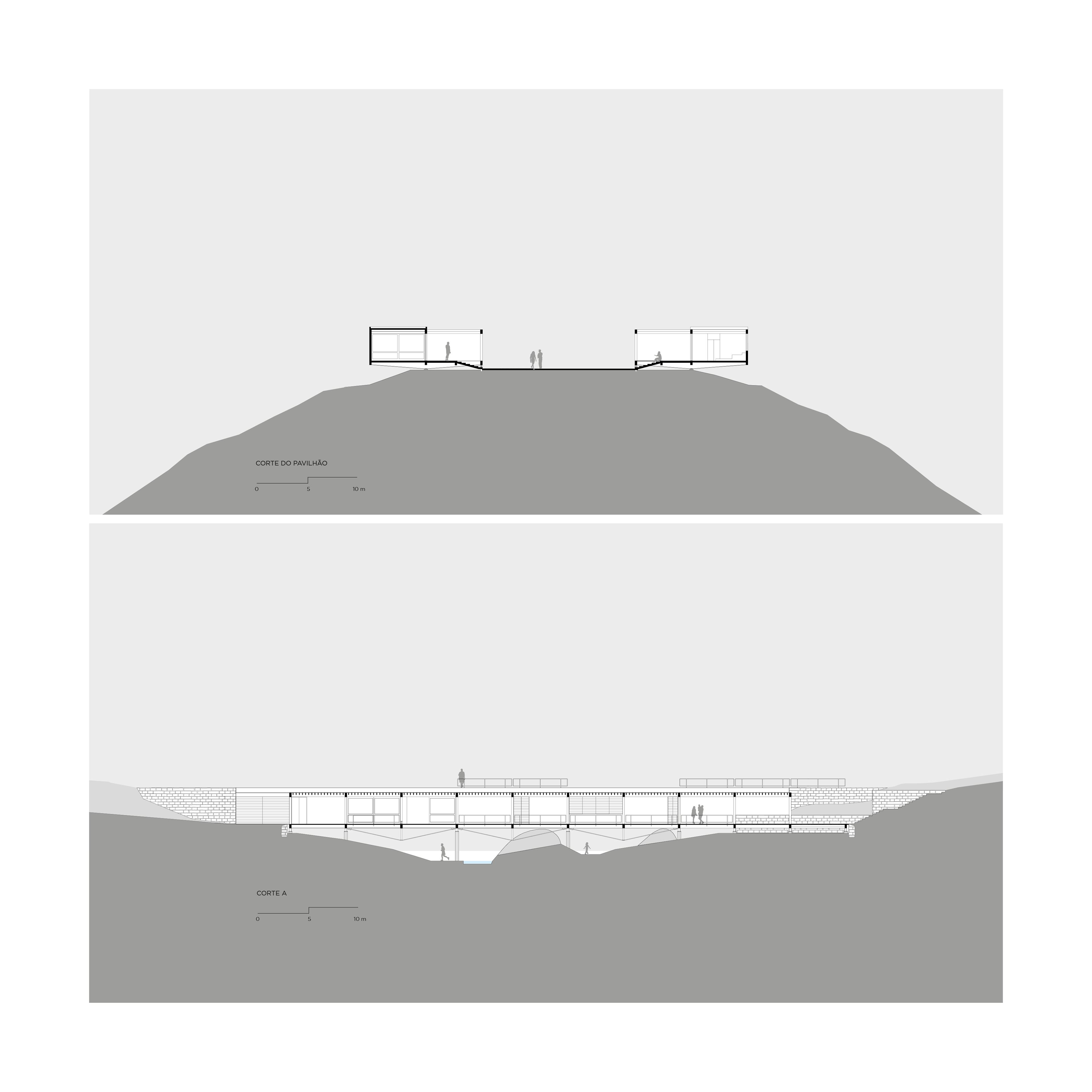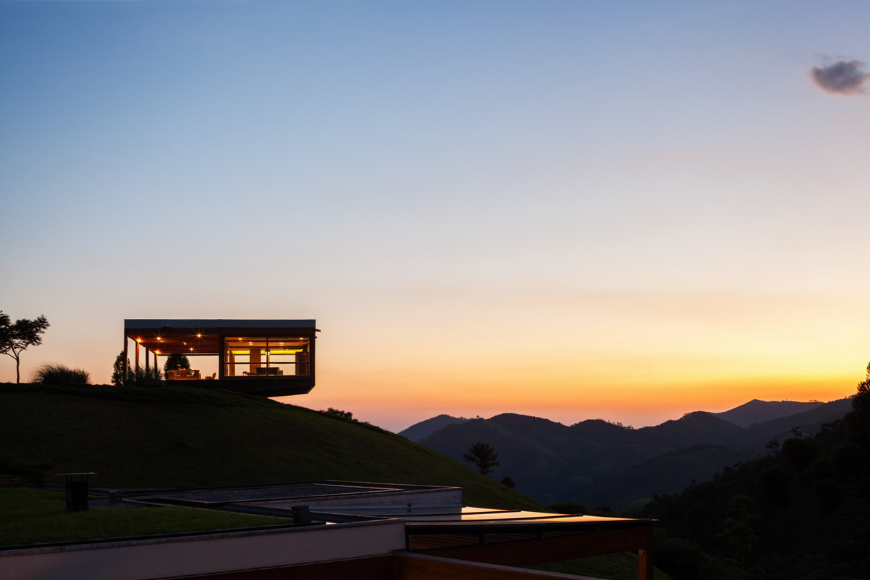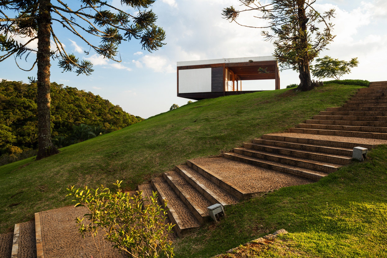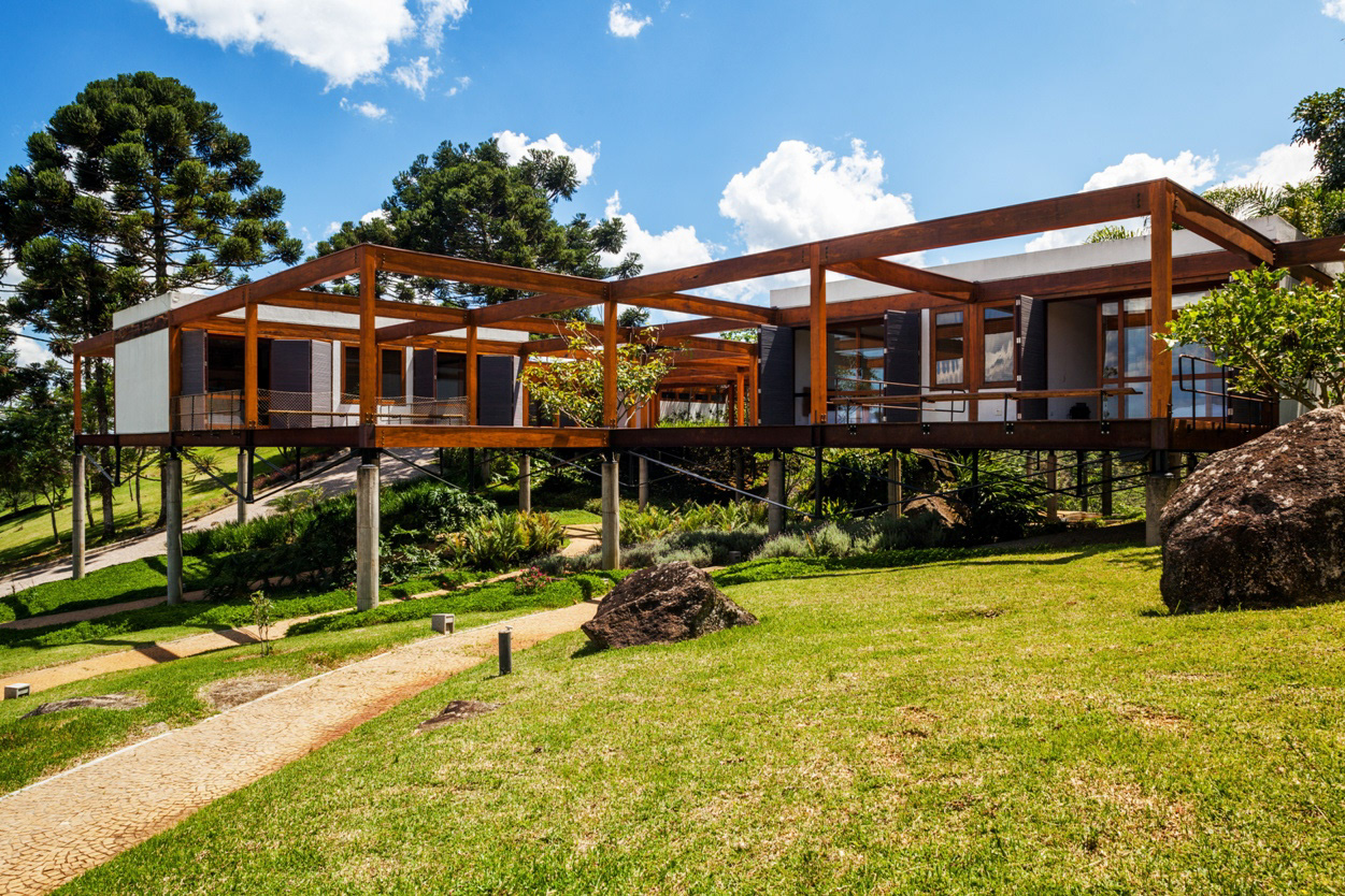 On the top of the highest hill, from where one has the most generous view of the mountainous horizon, lies the leisure pavilion, divided up in two blocks, with the same modulation of the main residence. The pavilion is supported by metallic beams in cor-ten steel, in a wing shape, enabling 100% of the balances in the free span, on the hills’ borders. The leisure pavilion and the residence block, with the same structural grid showing antagonistic situations of land occupation – whether in the valley or on the hill, the module establishes a clear dialog with the topography. Another 3 service pavilions with garage, housekeeper’s house, accommodations for the maids, dressing rooms, warehouses, etc. are pavilion-like constructions, with the same 5.5 X 5.5 meter module, albeit in a stone structure. Large parallel panels made out of stone anchored on the ground support the slabs. While the wooden constructions are light and ethereal, these blocks are evidence of their different function through the clear support of the large panels on the ground.