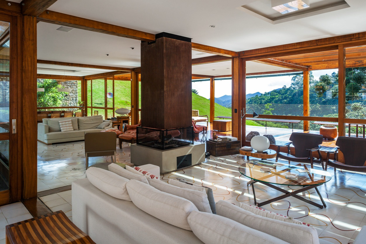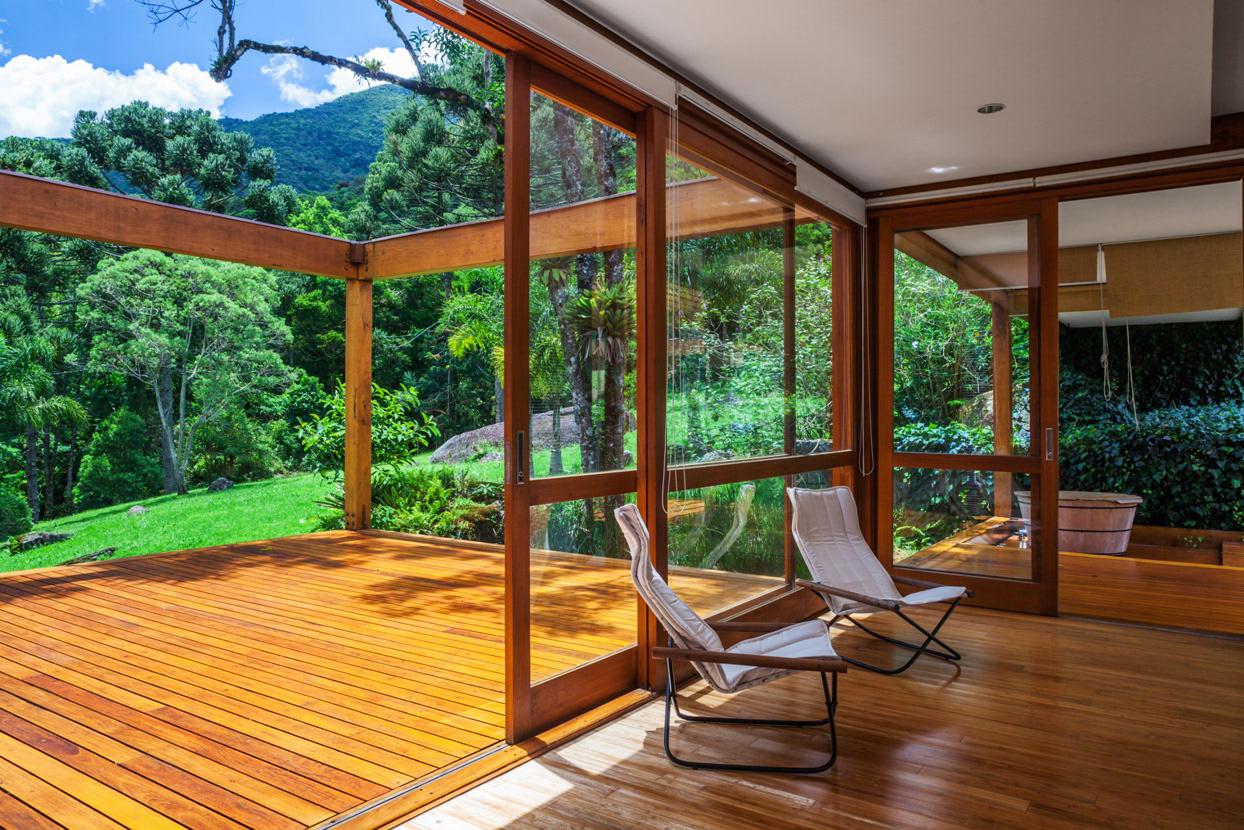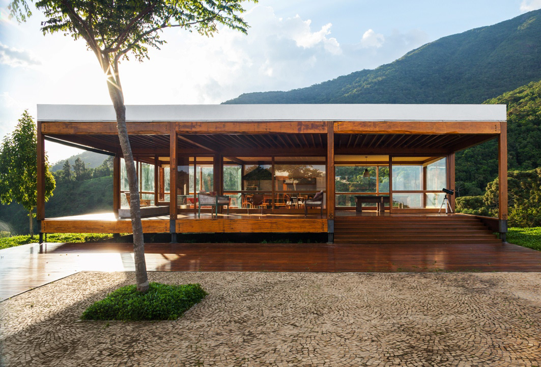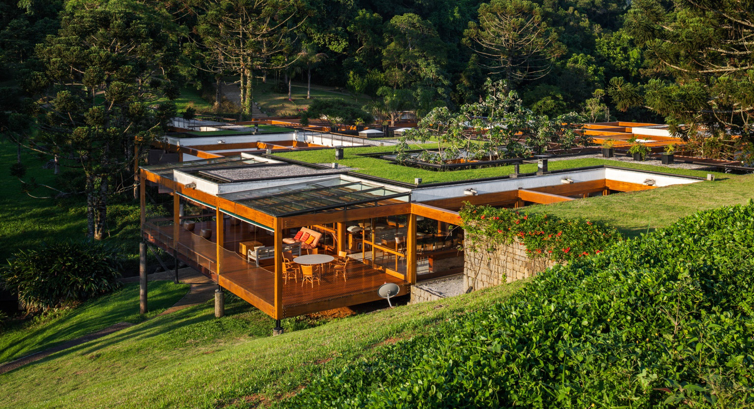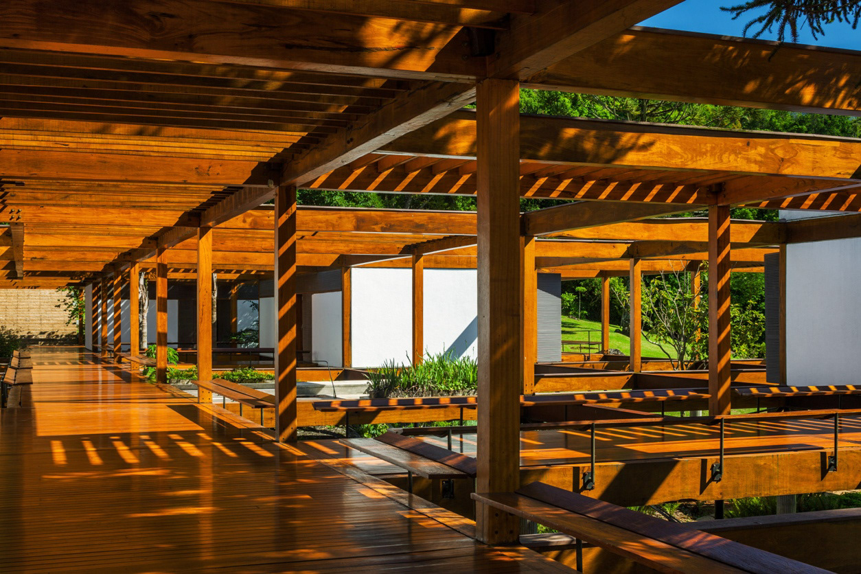 On the top of the highest hill, from where one has the most generous view of the mountainous horizon, lies the leisure pavilion, divided up in two blocks, with the same modulation of the main residence. The pavilion is supported by metallic beams in cor-ten steel, in a wing shape, enabling 100% of the balances in the free span, on the hills’ borders. The leisure pavilion and the residence block, with the same structural grid showing antagonistic situations of land occupation – whether in the valley or on the hill, the module establishes a clear dialog with the topography. Another 3 service pavilions with garage, housekeeper’s house, accommodations for the maids, dressing rooms, warehouses, etc. are pavilion-like constructions, with the same 5.5 X 5.5 meter module, albeit in a stone structure. Large parallel panels made out of stone anchored on the ground support the slabs. While the wooden constructions are light and ethereal, these blocks are evidence of their different function through the clear support of the large panels on the ground.
