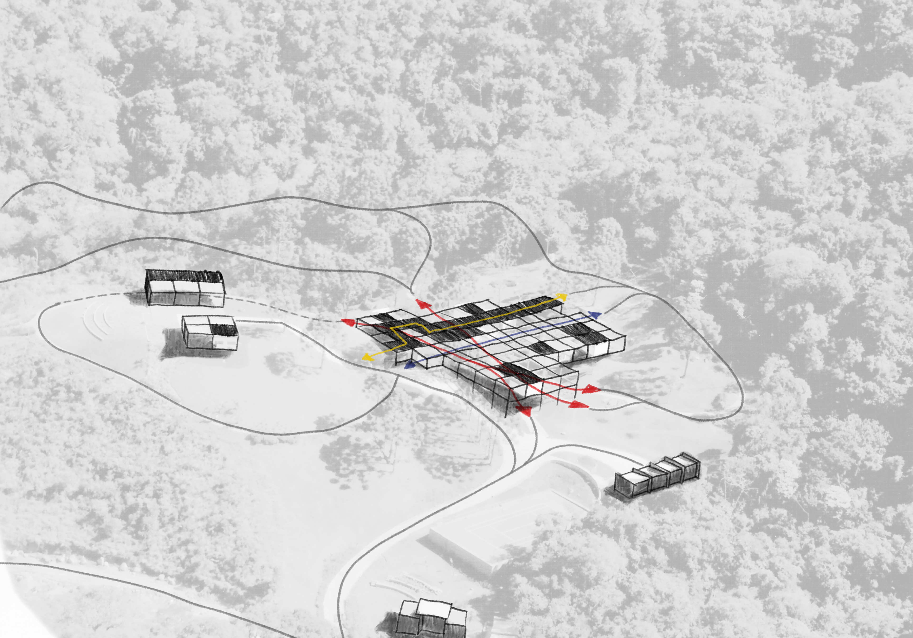 Three levels of landscape intervention have been defined. The idea is to rebuild the margins of the forest and create a transition between the open field and the closed forest by using native species, compatible with the region. At the same time, in the remainder of the open area, the park is taken up by paths with resting areas in the areas where the best views can be observed. Finally, at the sites close to the buildings there is a garden prior to the architecture work. At the top floor, which is a continuation of the plot, there is a linear water mirror that avoids the use of body protector and relates to the large water mirror located in the lower garden, around which the largest stone at the site