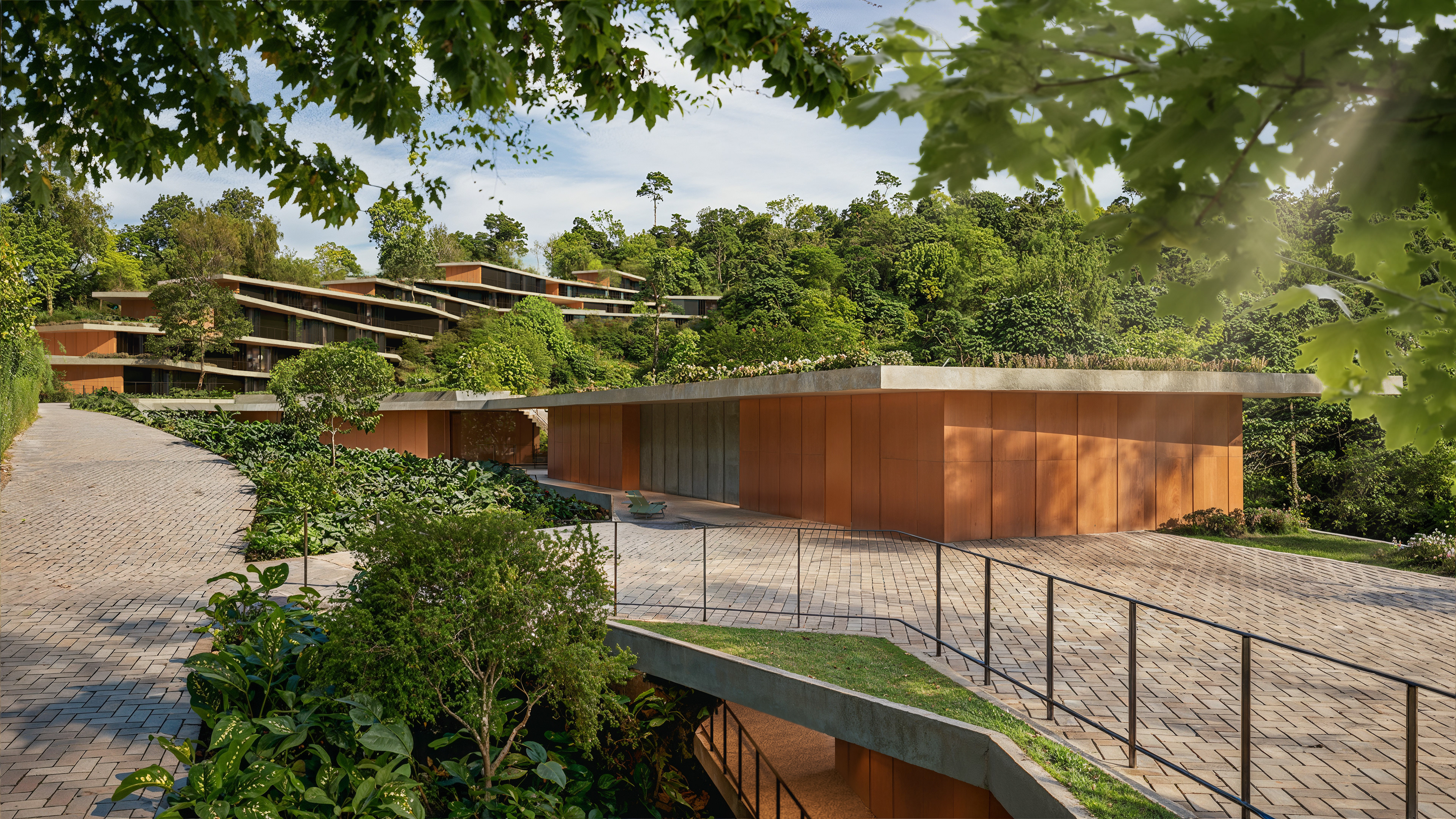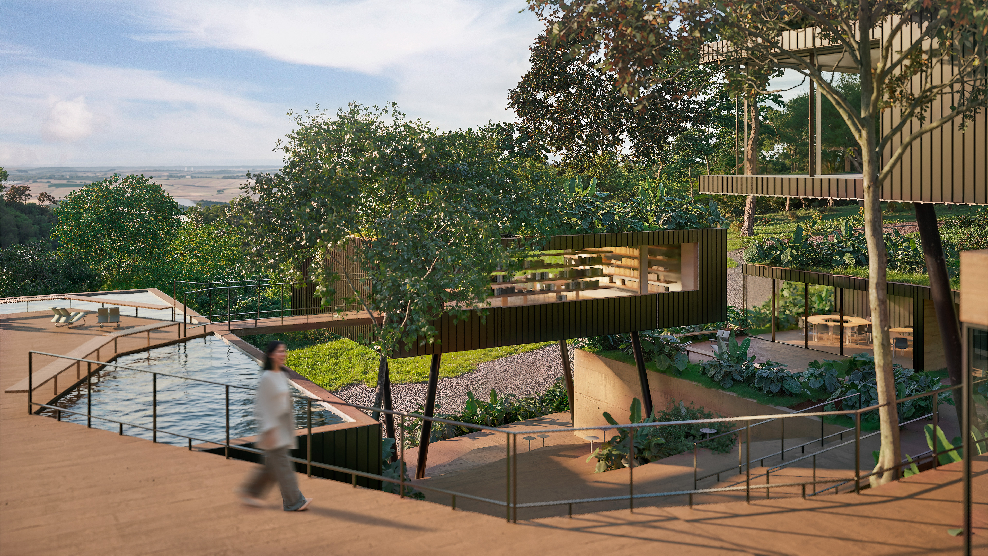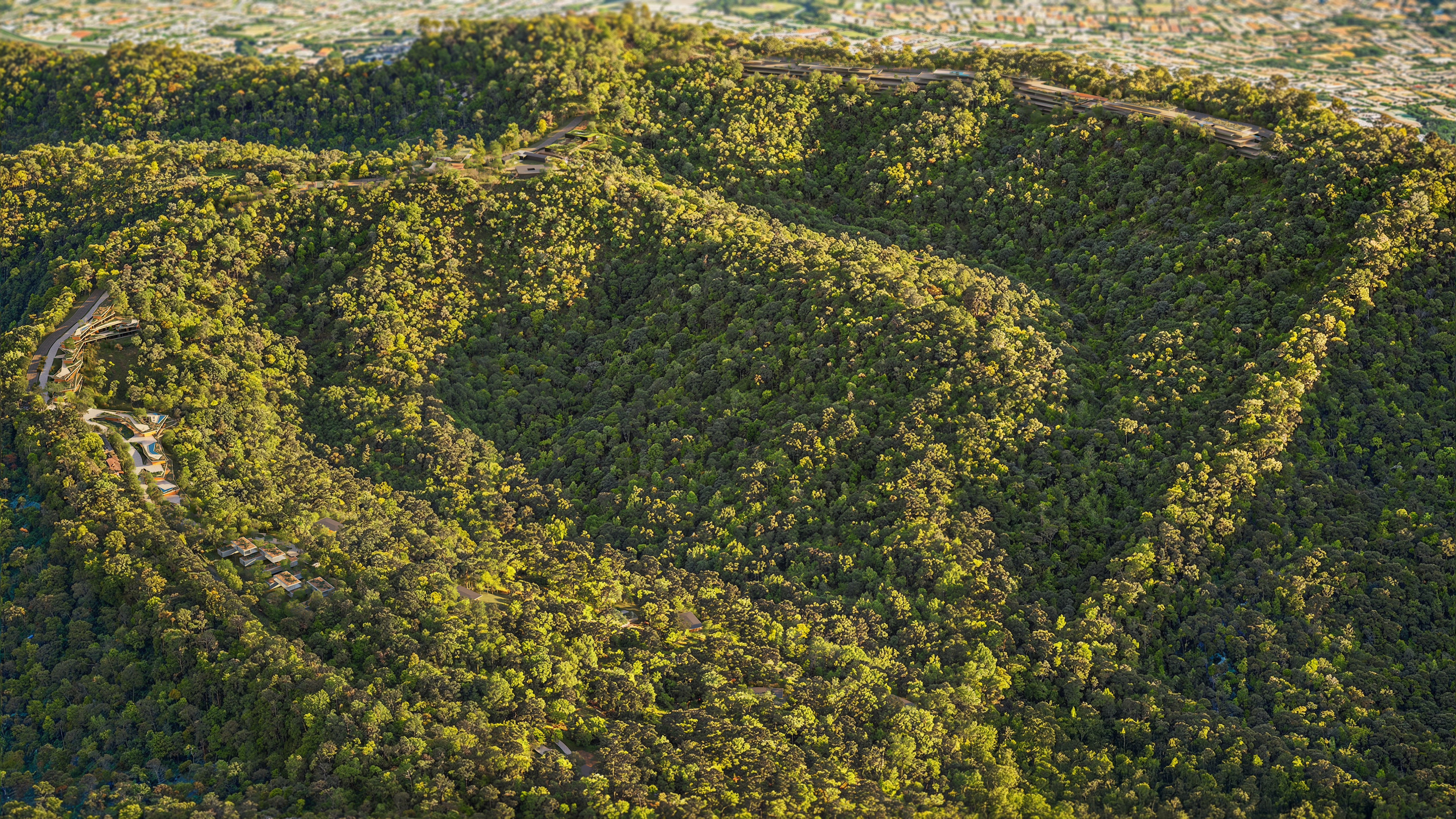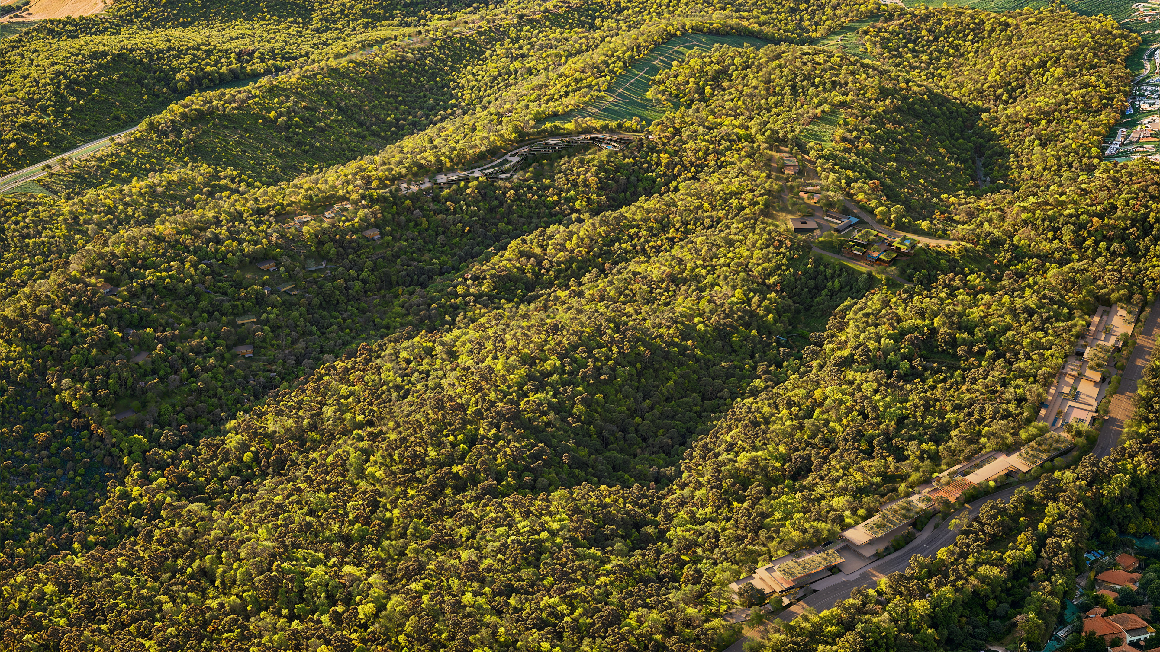 Located along the edges of the site, the architectural ensemble was designed to minimize environmental impact and allow for the regeneration of native vegetation. This strategy ensures integration with the surrounding urban context and functional access to neighboring cities, without compromising the preservation area. Circulation between buildings occurs along external pathways, reducing pressure on internal ecosystems.