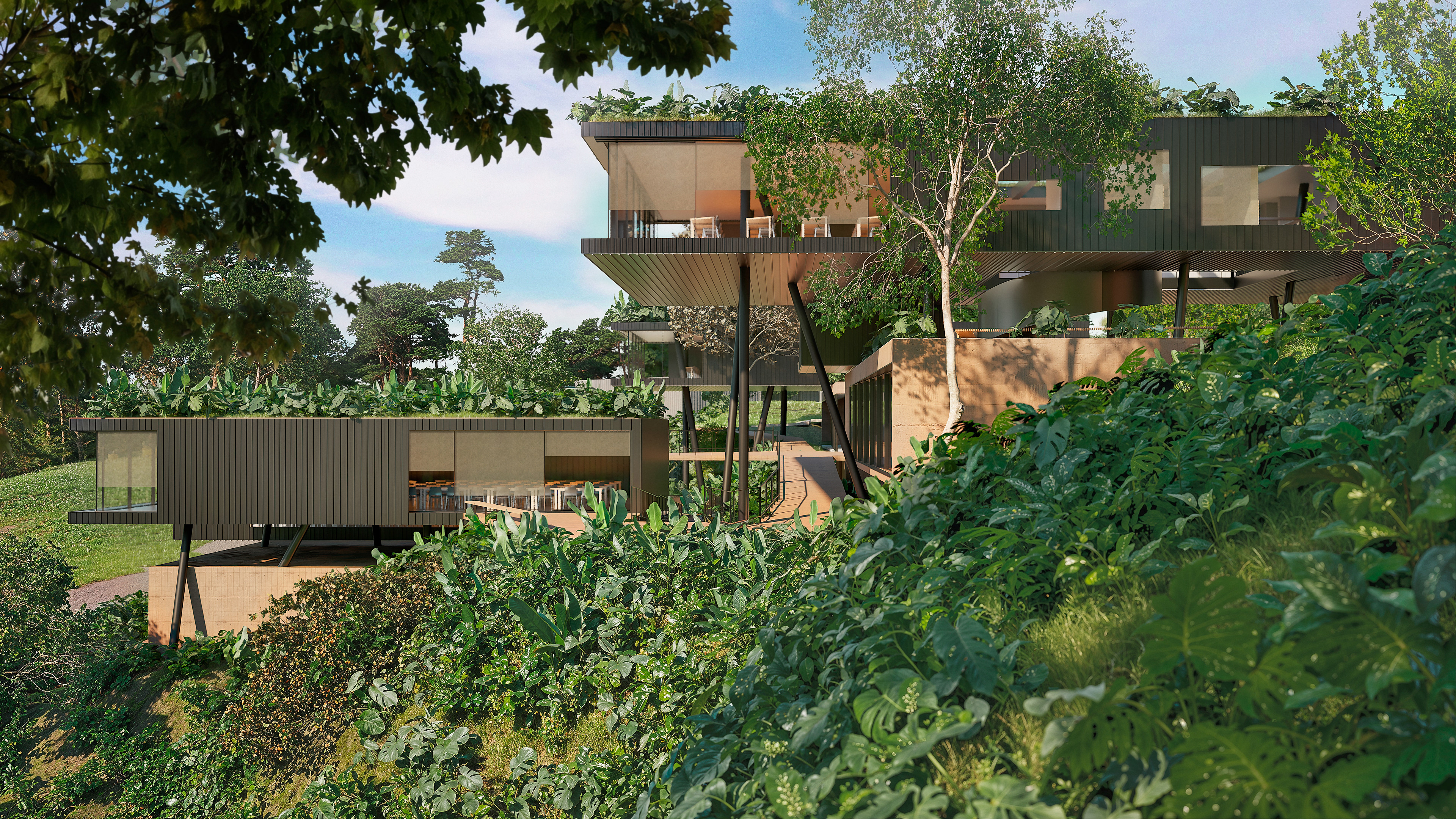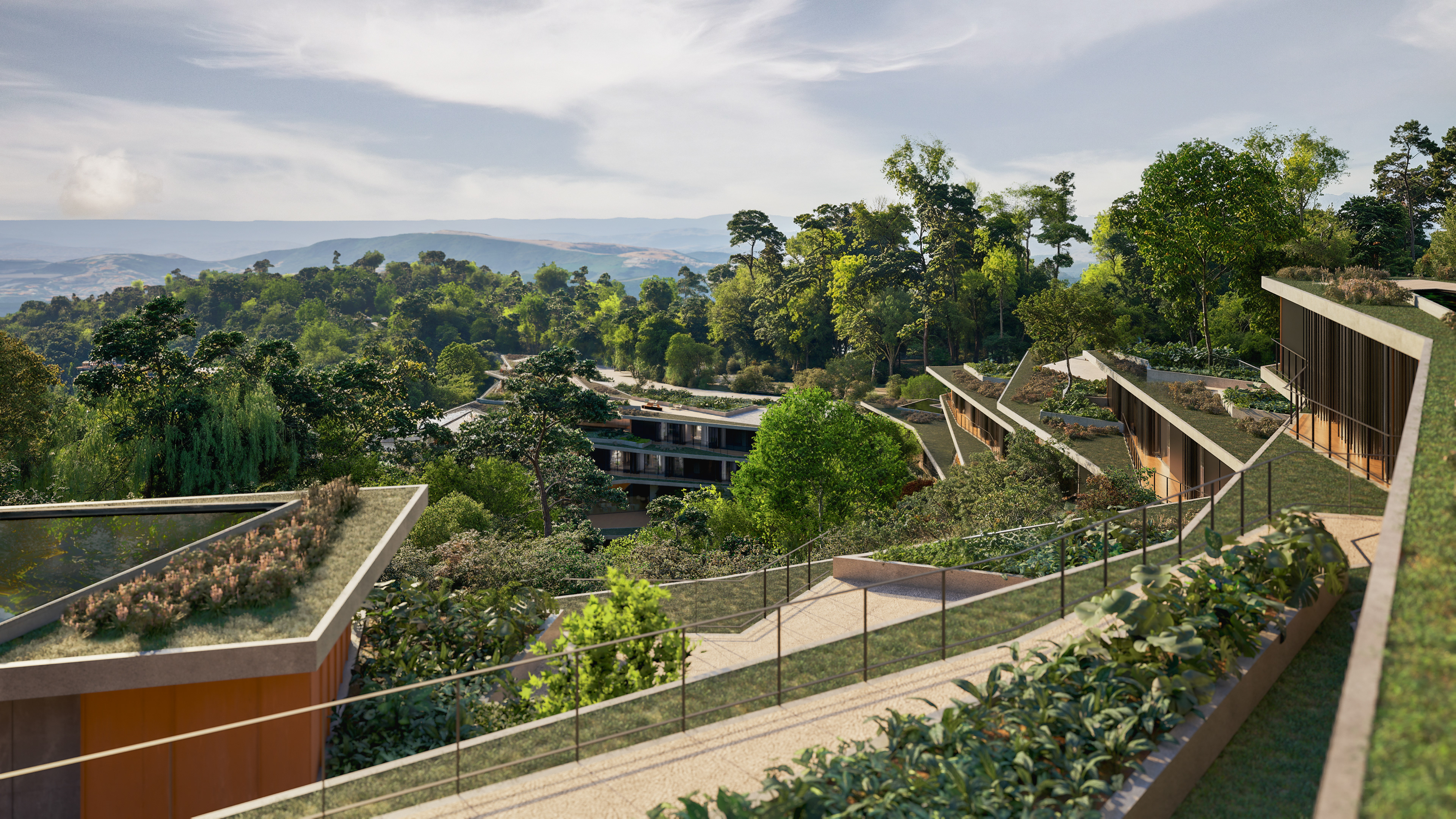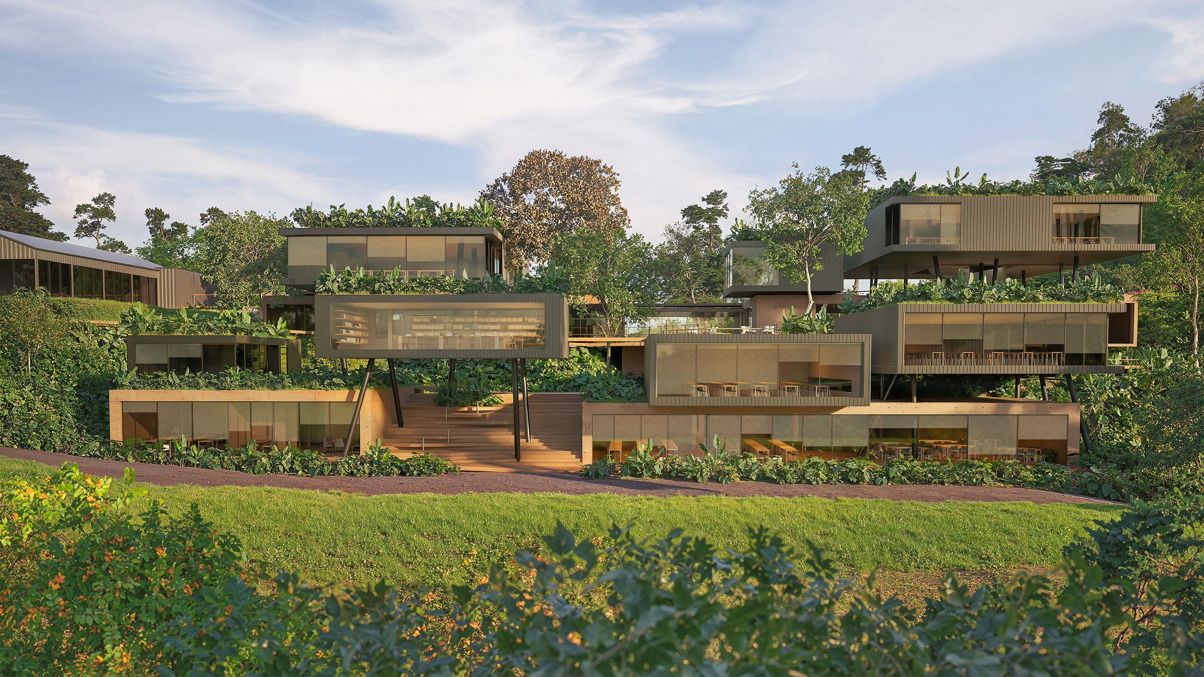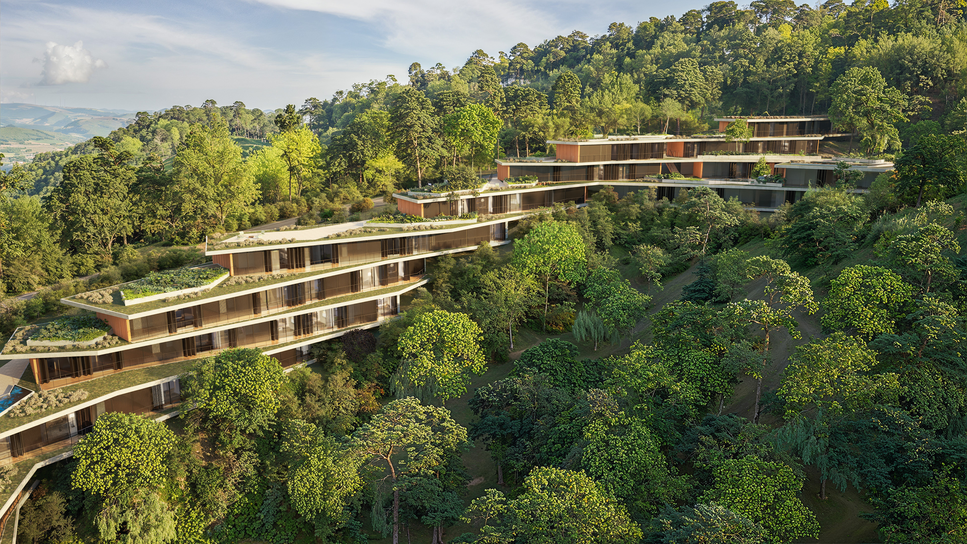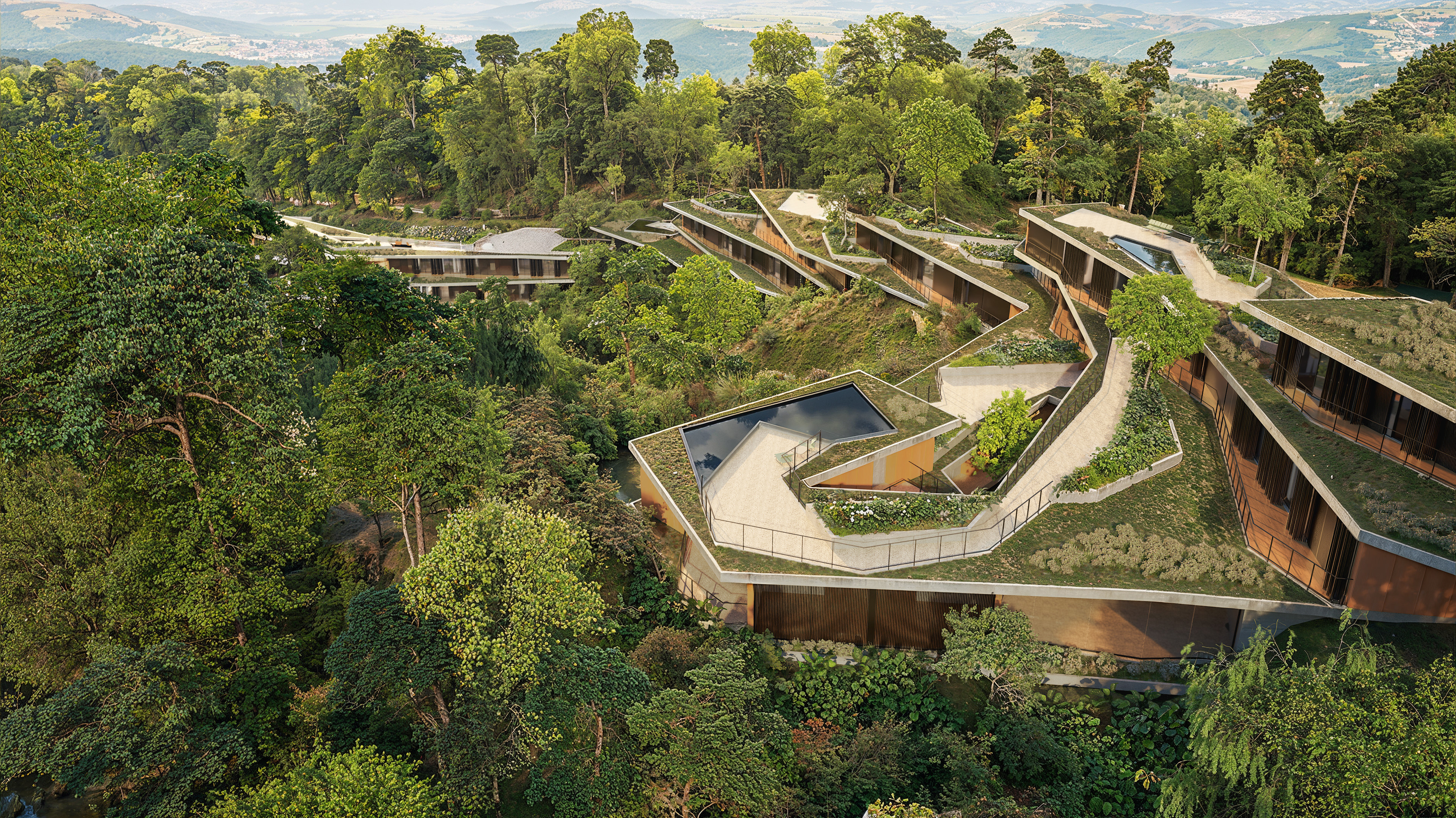 The buildings were designed in harmony with the site’s topography, adopting sustainable solutions throughout. The volumes are arranged horizontally, making use of existing clearings and avoiding complex vertical constructions. Terraces, overhangs, and open areas ensure thermal comfort, strong integration with the landscape, and spaces for social interaction. The residential units, strategically distributed, maintain a close relationship with the surrounding forest, creating an immersive experience for students, researchers, and entrepreneurs.