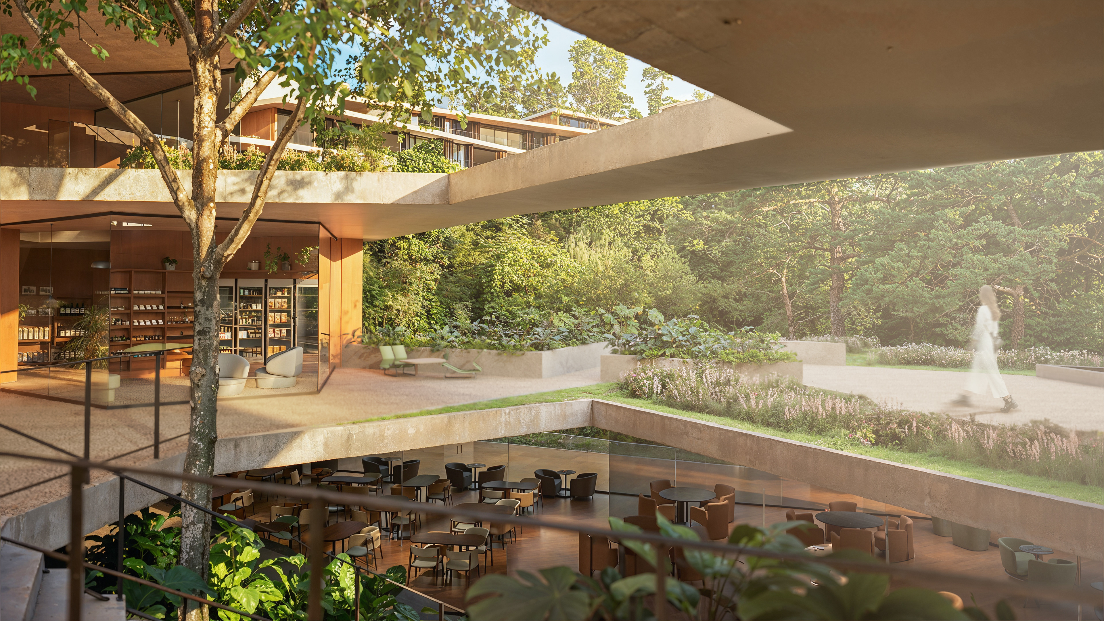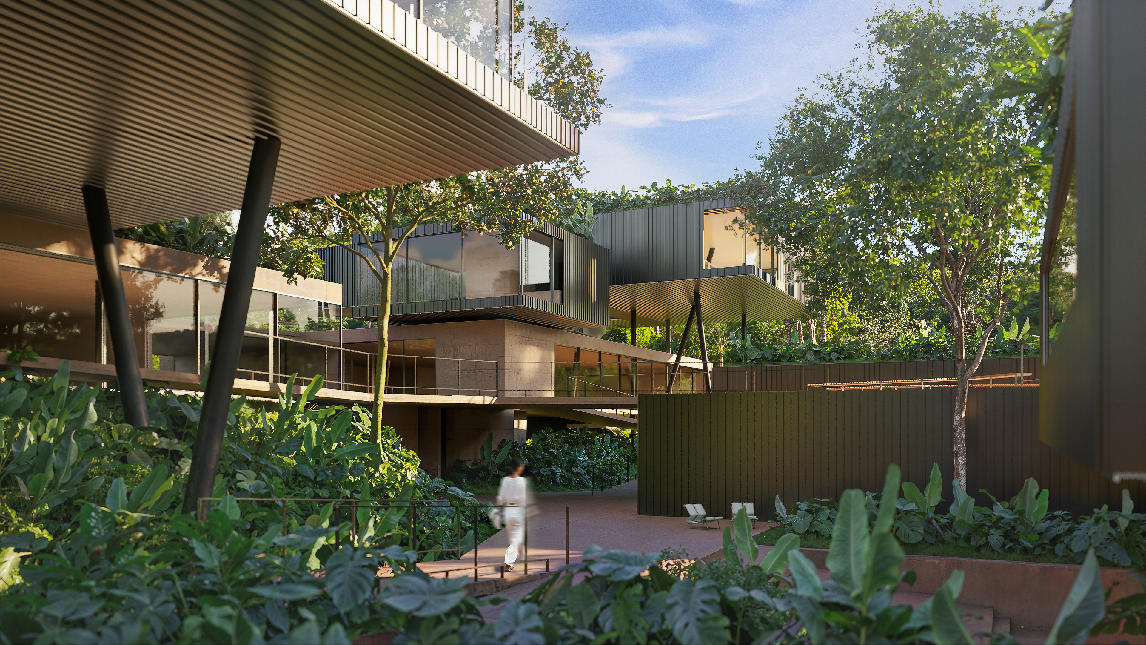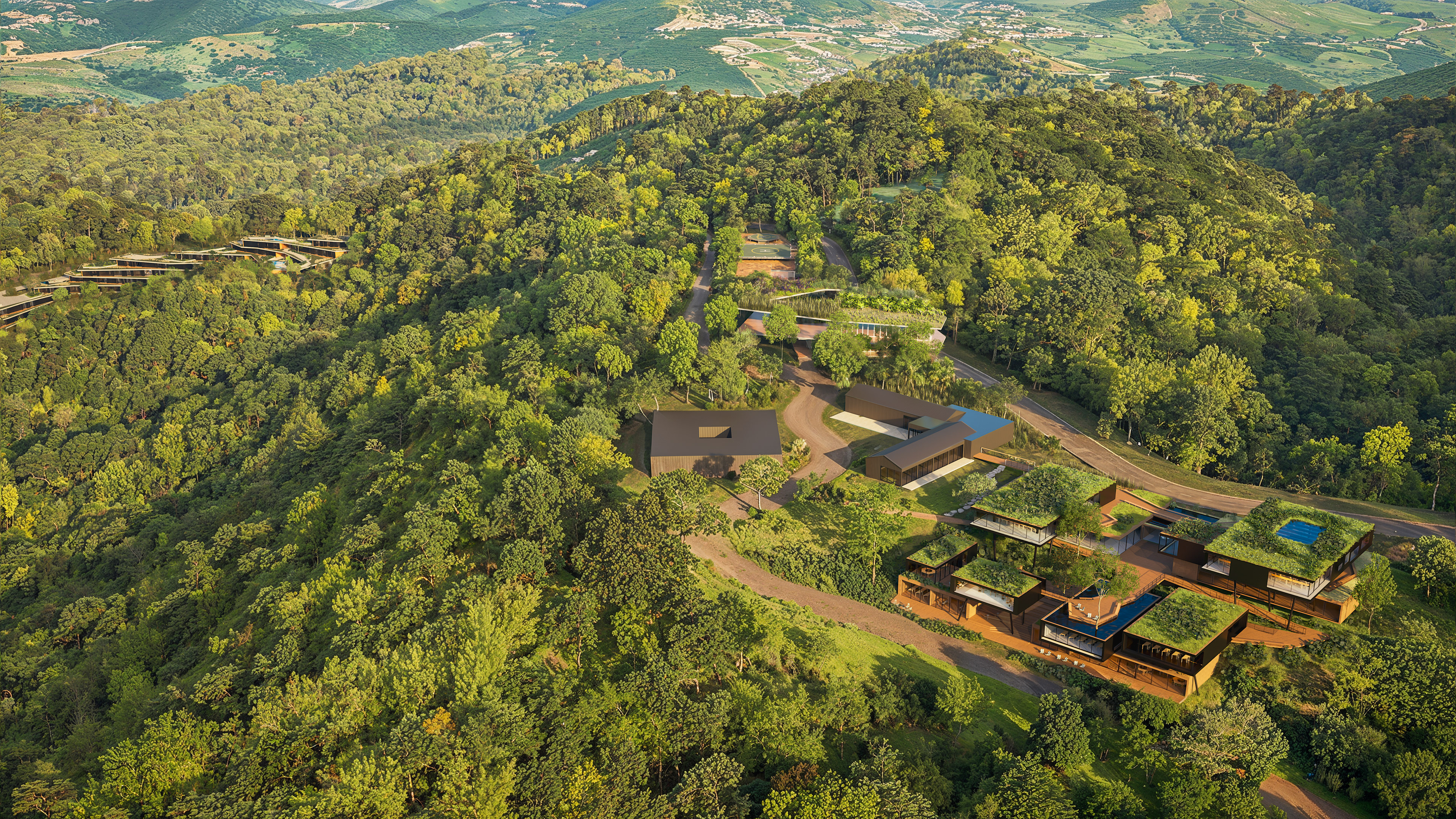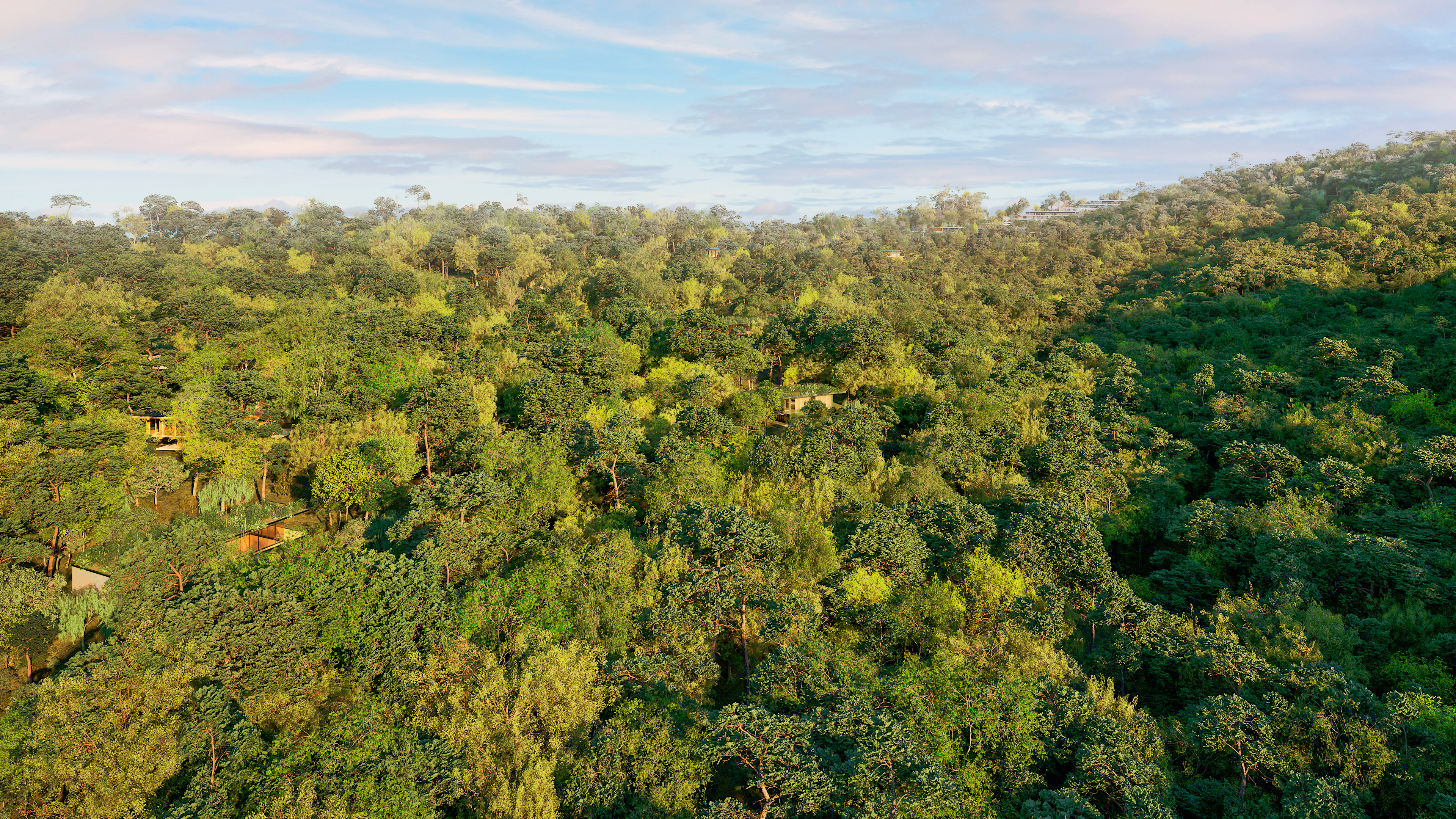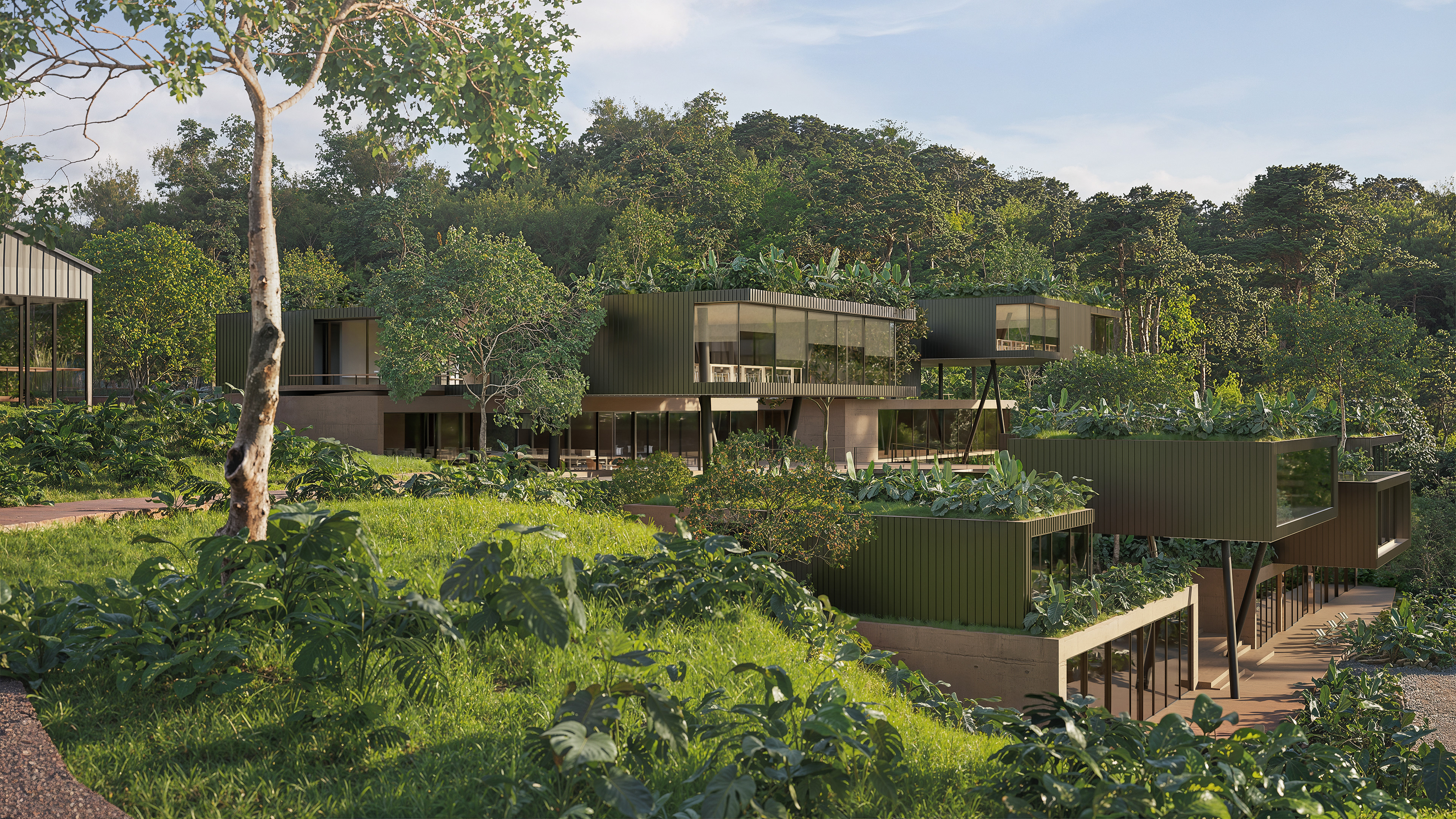 The buildings were designed in harmony with the site’s topography, adopting sustainable solutions throughout. The volumes are arranged horizontally, making use of existing clearings and avoiding complex vertical constructions. Terraces, overhangs, and open areas ensure thermal comfort, strong integration with the landscape, and spaces for social interaction. The residential units, strategically distributed, maintain a close relationship with the surrounding forest, creating an immersive experience for students, researchers, and entrepreneurs.