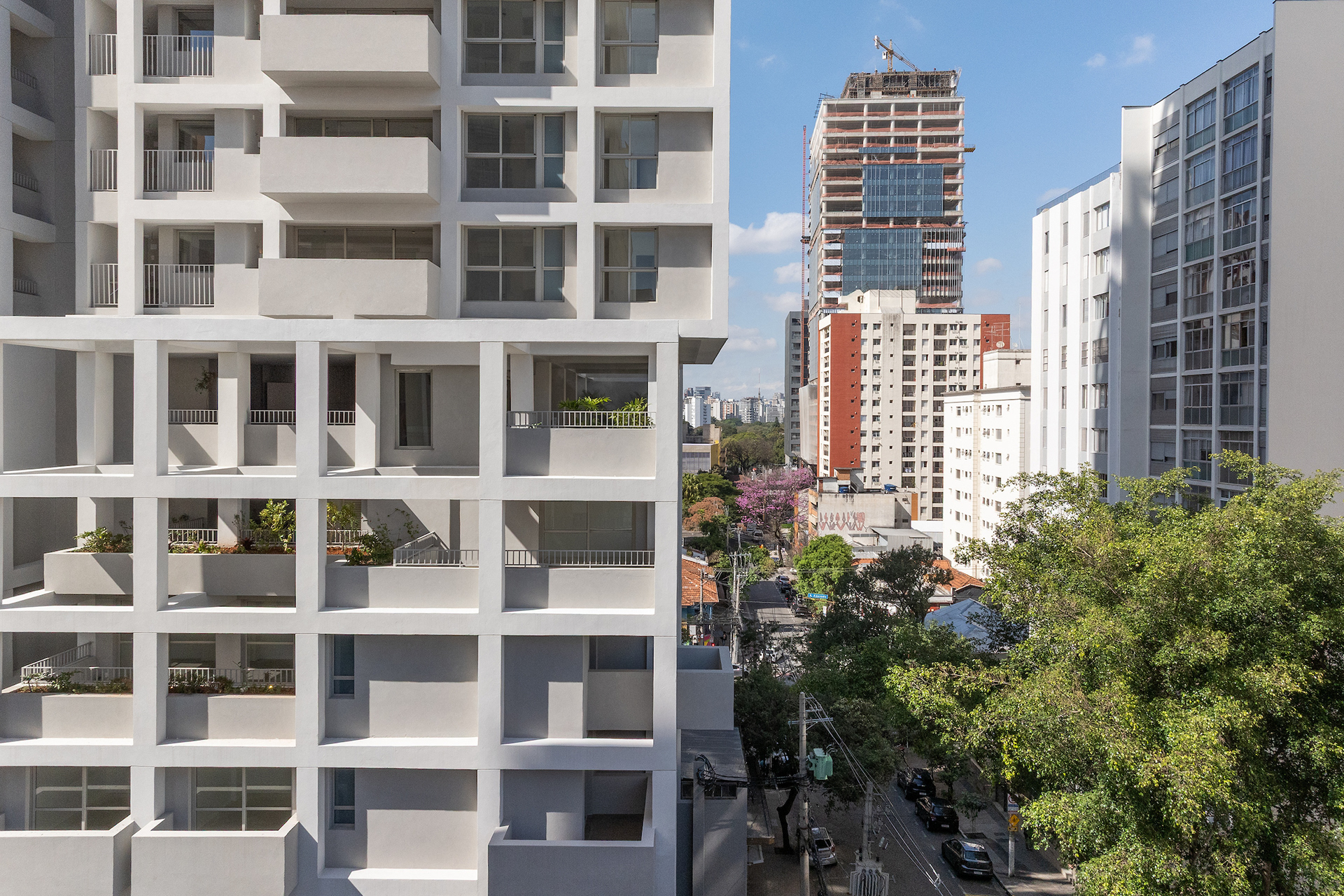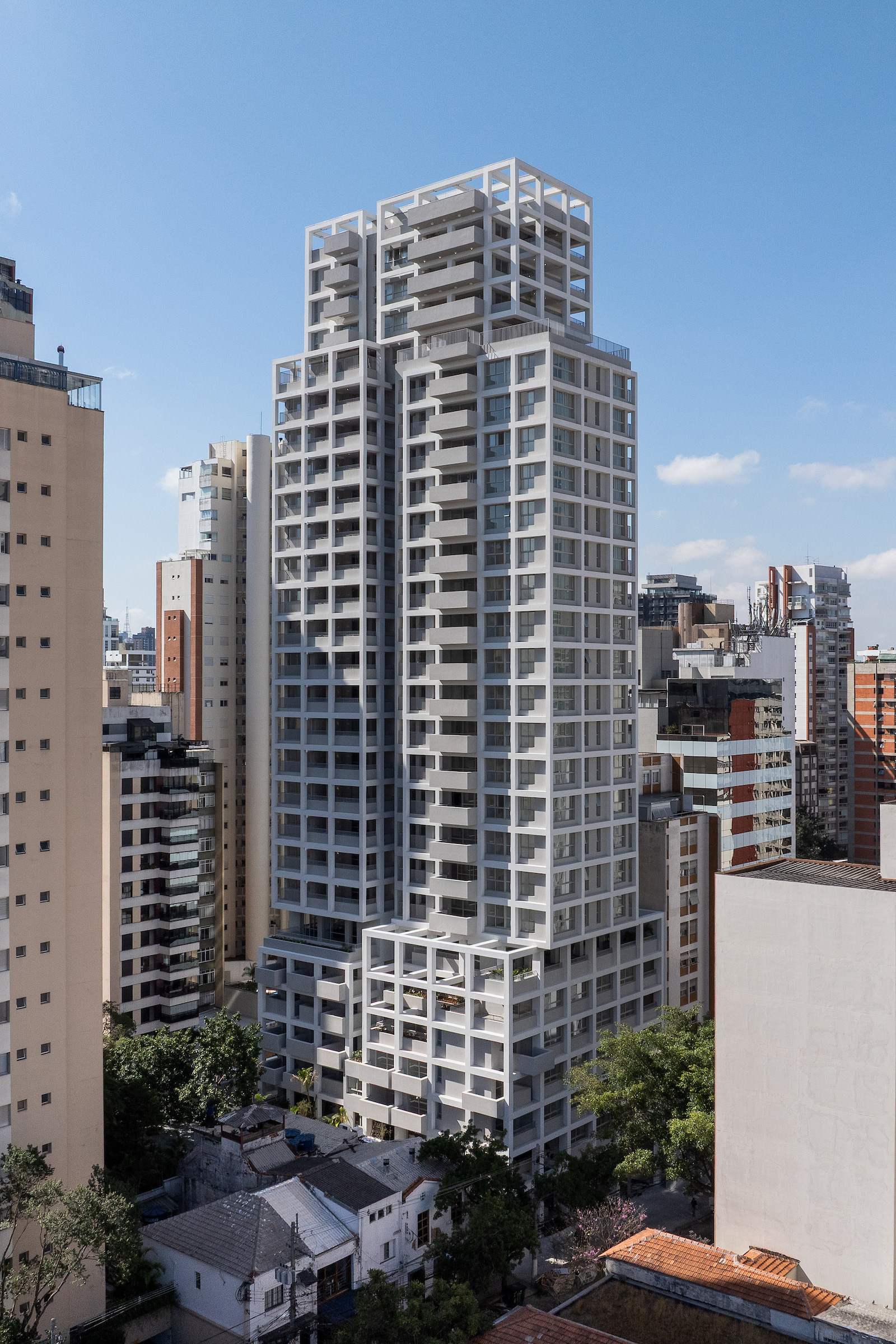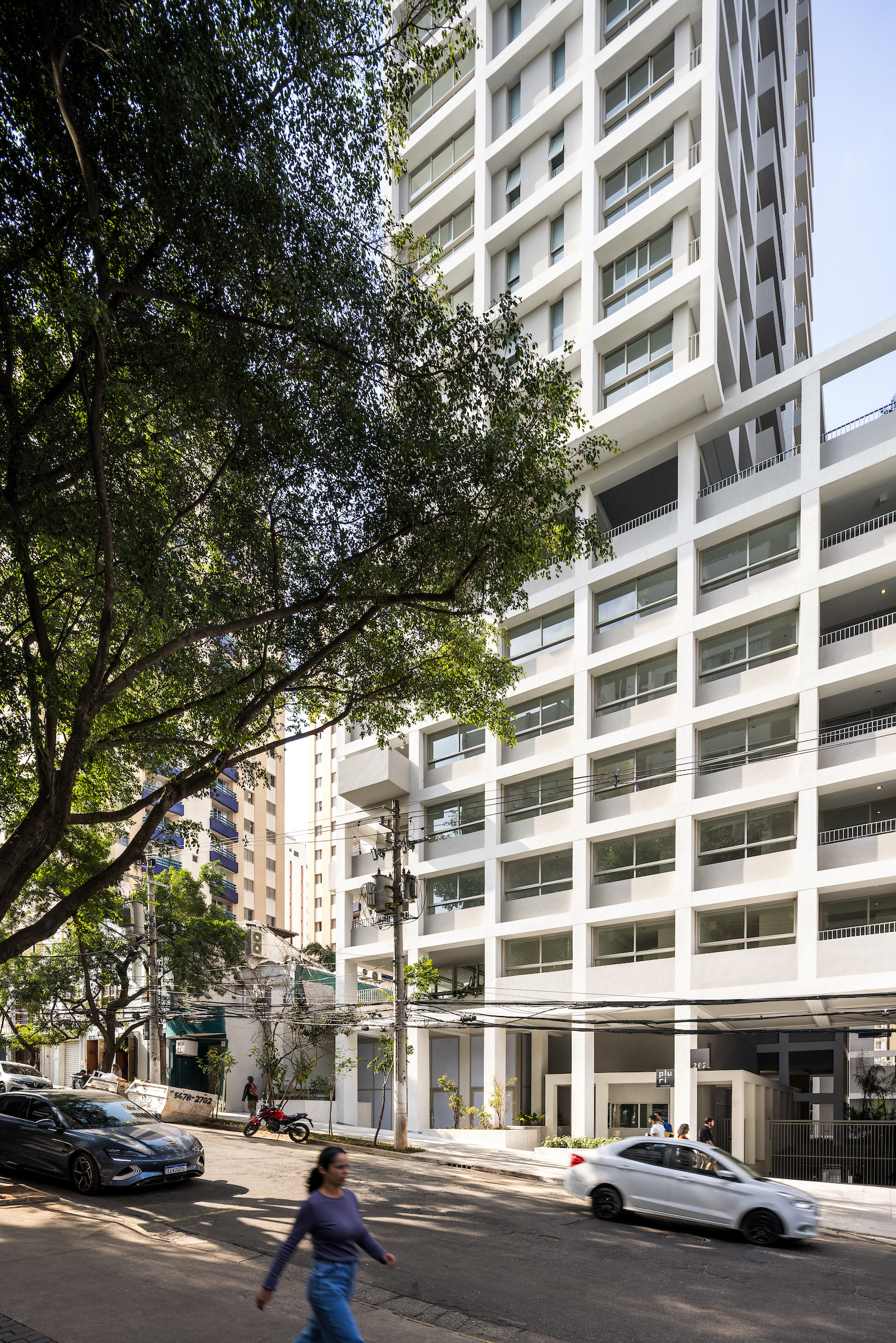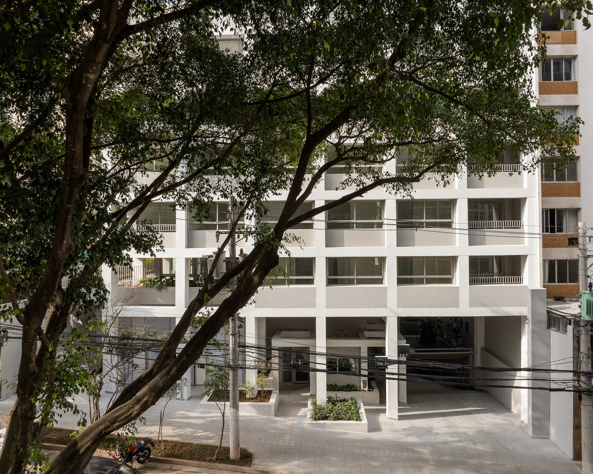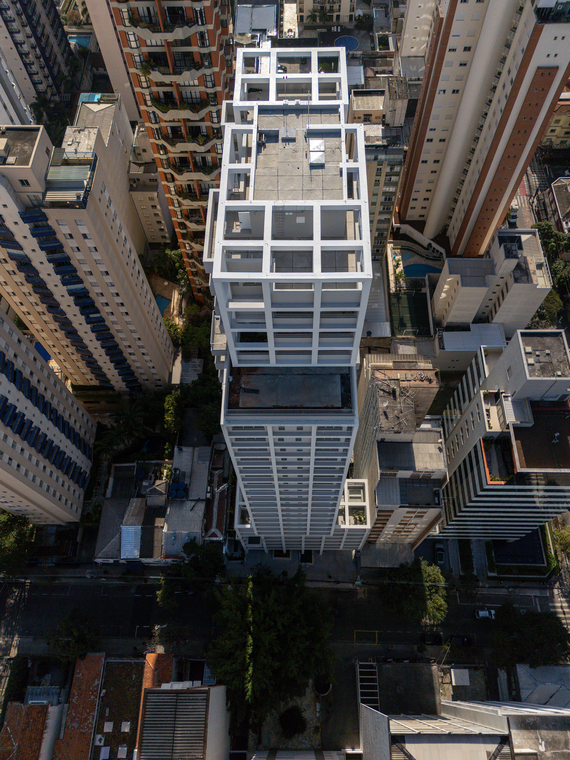 The choice of light, neutral colors—such as white and gray—reinforces the role of light and shadow in articulating the grid and the volumes. These tones also emphasize the presence of vegetation wherever possible, especially where the grid creates transitional outdoor spaces, with planters that are simultaneously within the structure and exposed to the elements. The purity of white, combined with the rigor of the structure, results in a direct, synthetic, and clear urban object, free of excess. In an urban landscape as complex as São Paulo’s, it is sometimes important to speak softly—to whisper.