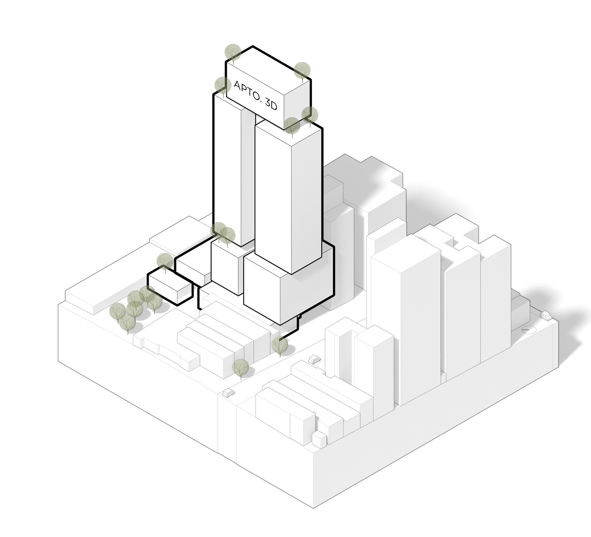 The front façade undertakes the challenging task of accommodating a retail store, access to rental apartments, access to residential units, and the garage ramp. Like the other entrances, the store is sheltered by the volume of the smaller units, forming a small covered plaza that expands the public realm and creates space for the building to adapt to the street’s slope. This first block above the ground floor is composed of studios—approximately 30 m² apartments intended for short- and long-term stays. Its geometry, independent from the other volumes, highlights the separation of typologies, as occurs throughout the rest of the tower.