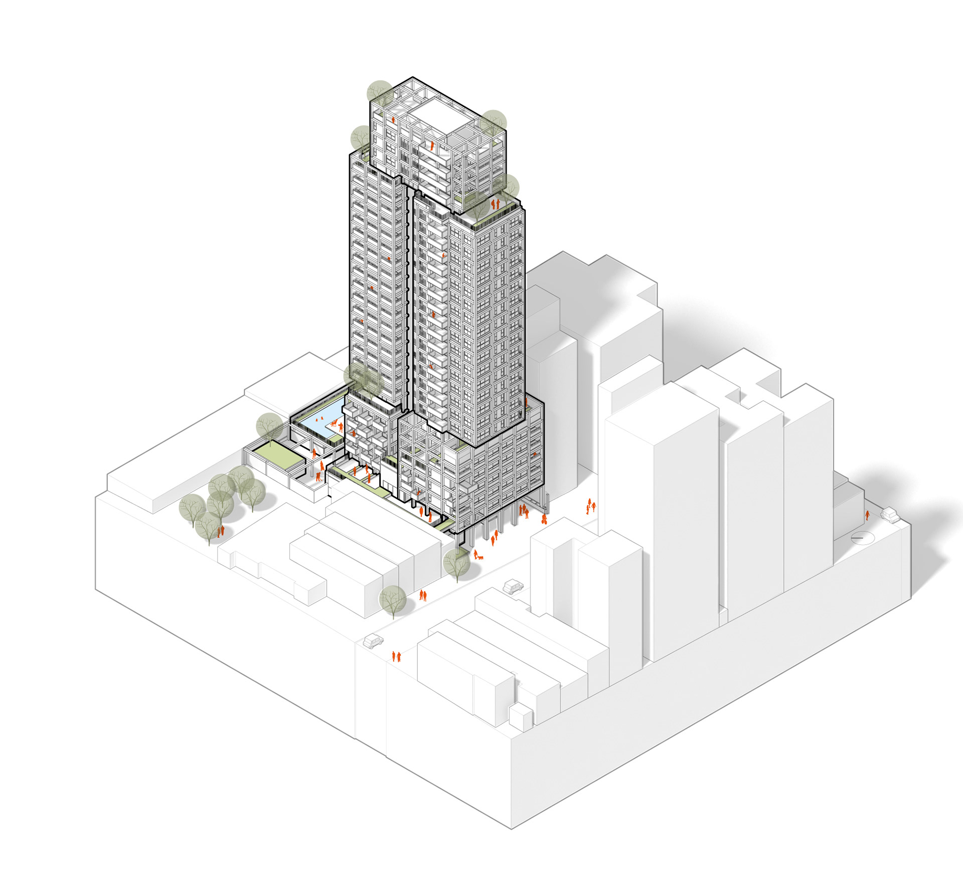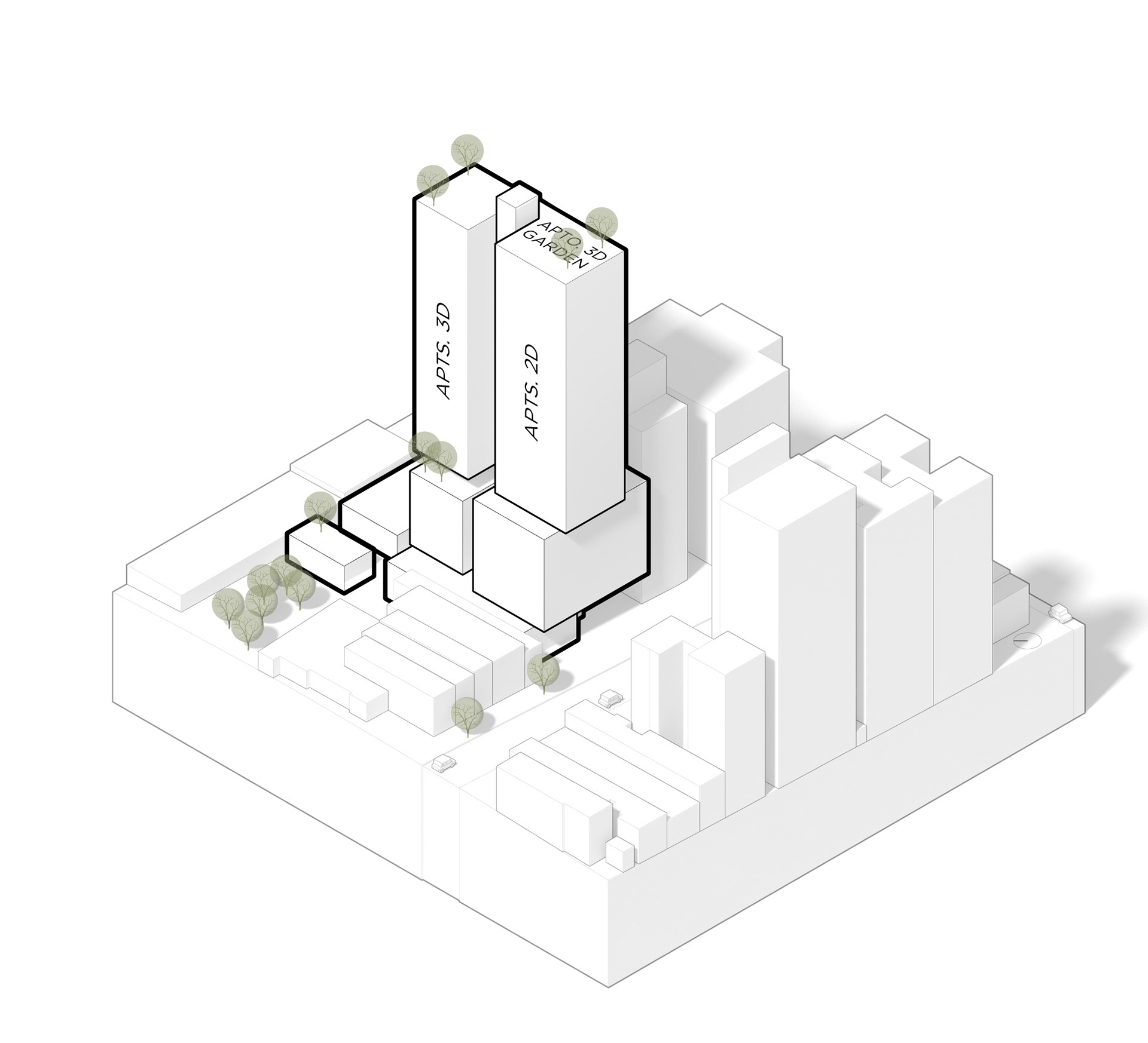 On the upper floors, a large volume houses two-bedroom apartments, flanked by another containing three-bedroom units. Above these, a limited number of special units—some with larger terraces, others with more generous layouts—form an additional block.