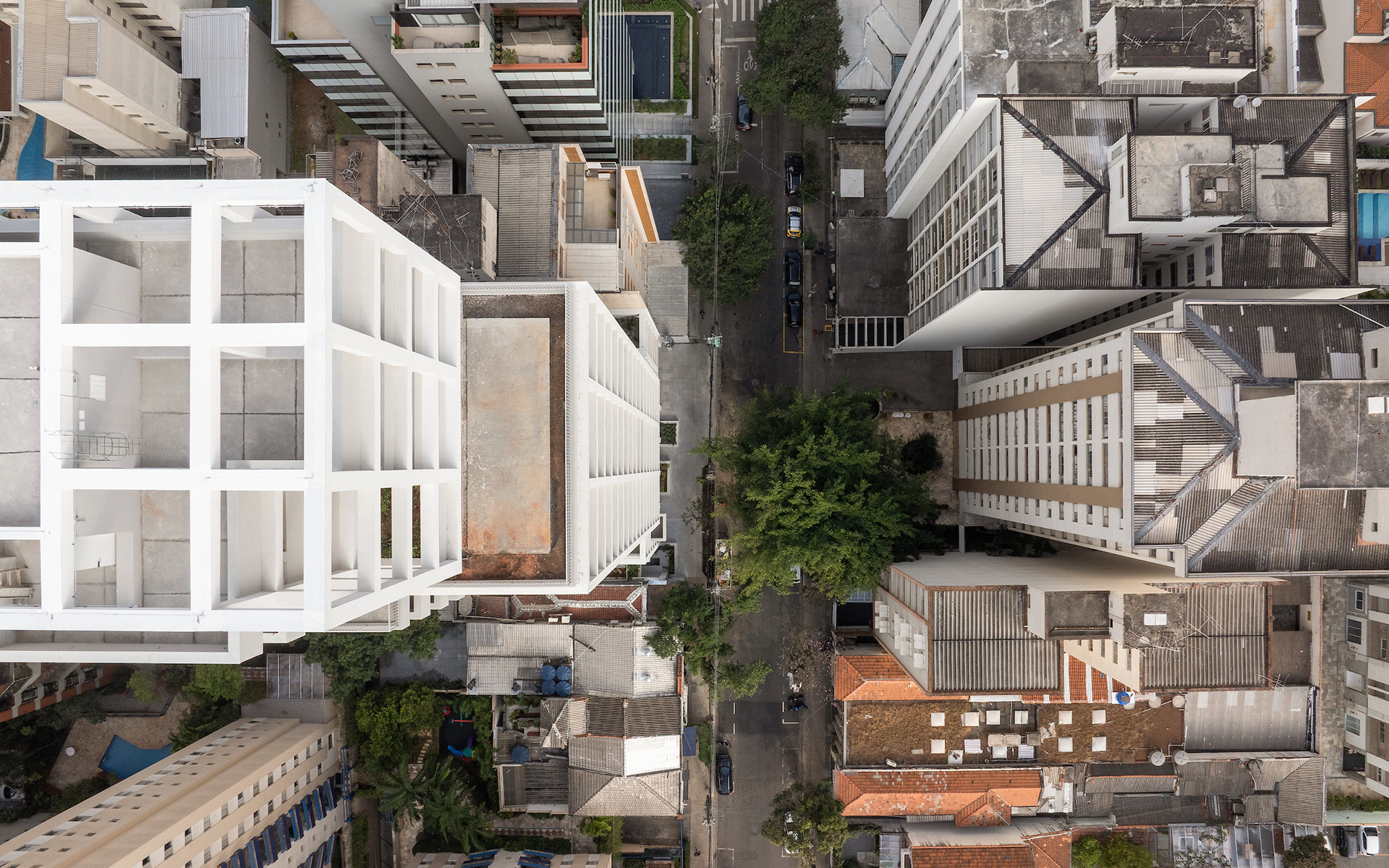 The overlapping and juxtaposition of different uses and typologies guides the design concept of this building in the Pinheiros neighborhood of São Paulo.