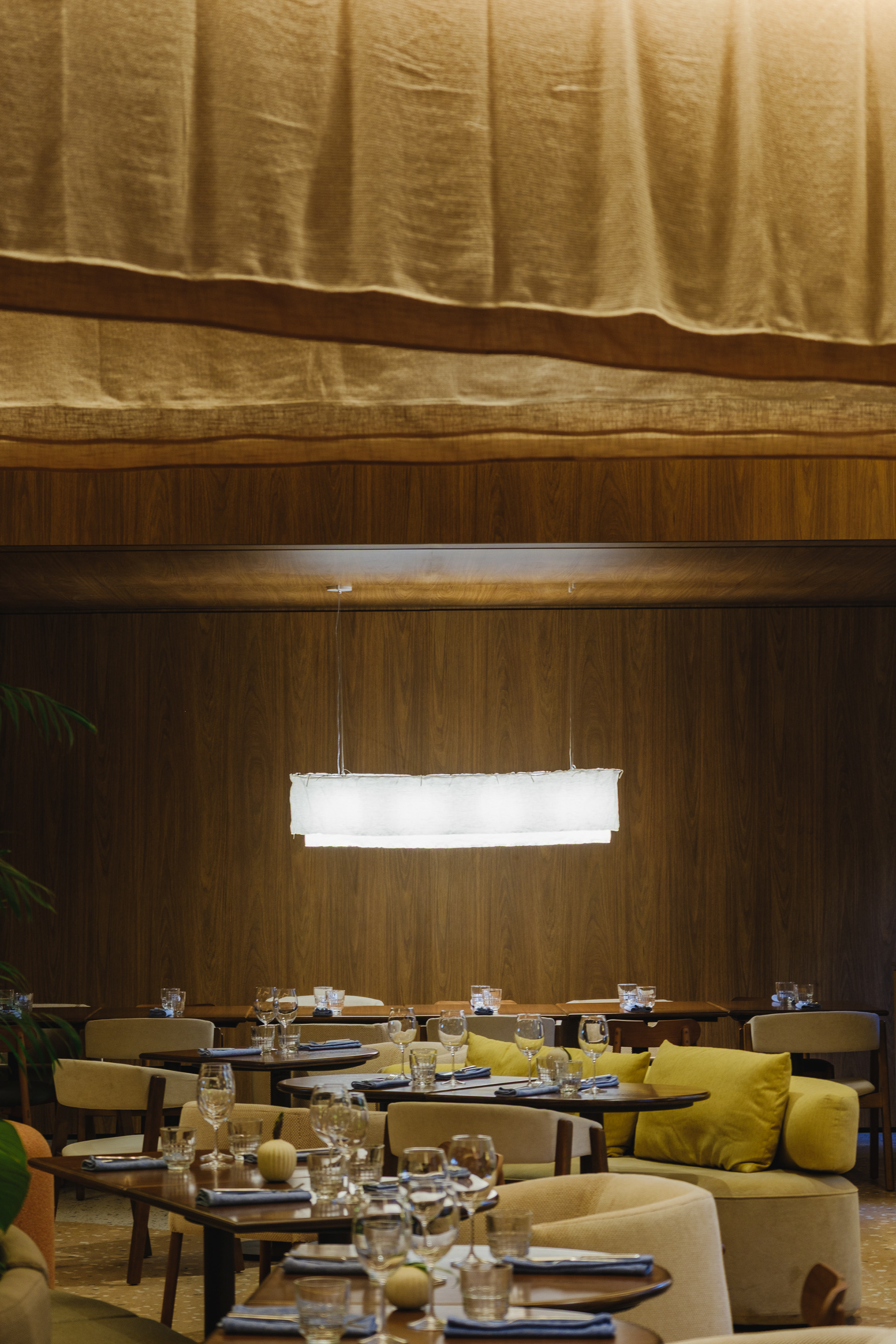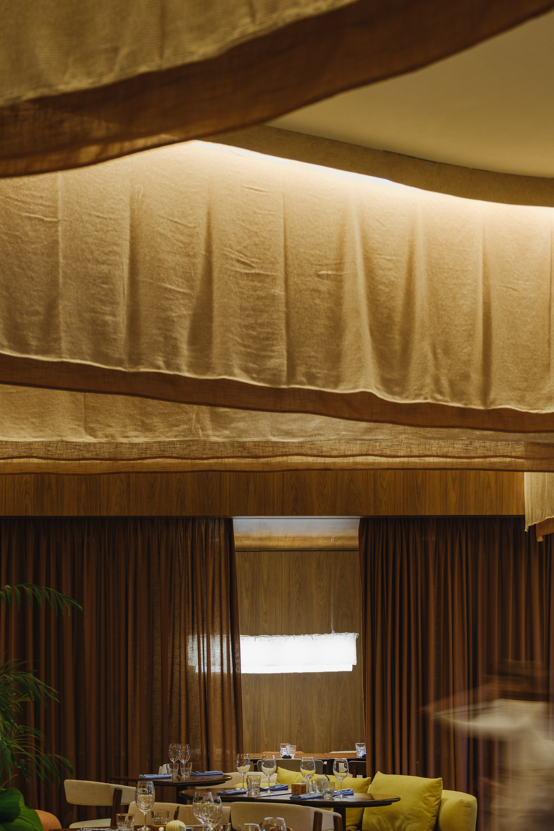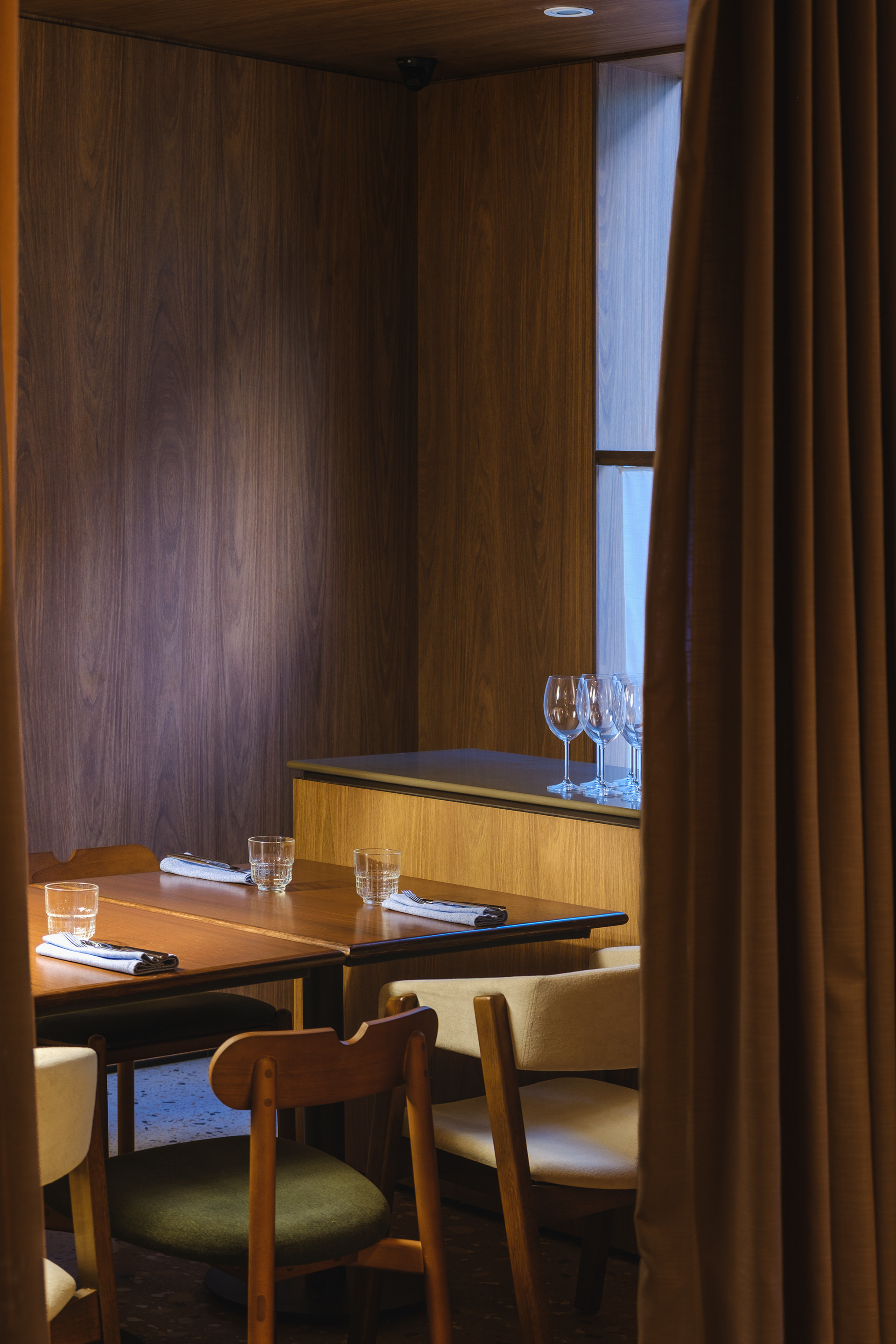 A private dining room was also created, separated from the main dining area by curtains, allowing it to function either independently or integrated with the rest of the space as needed.
