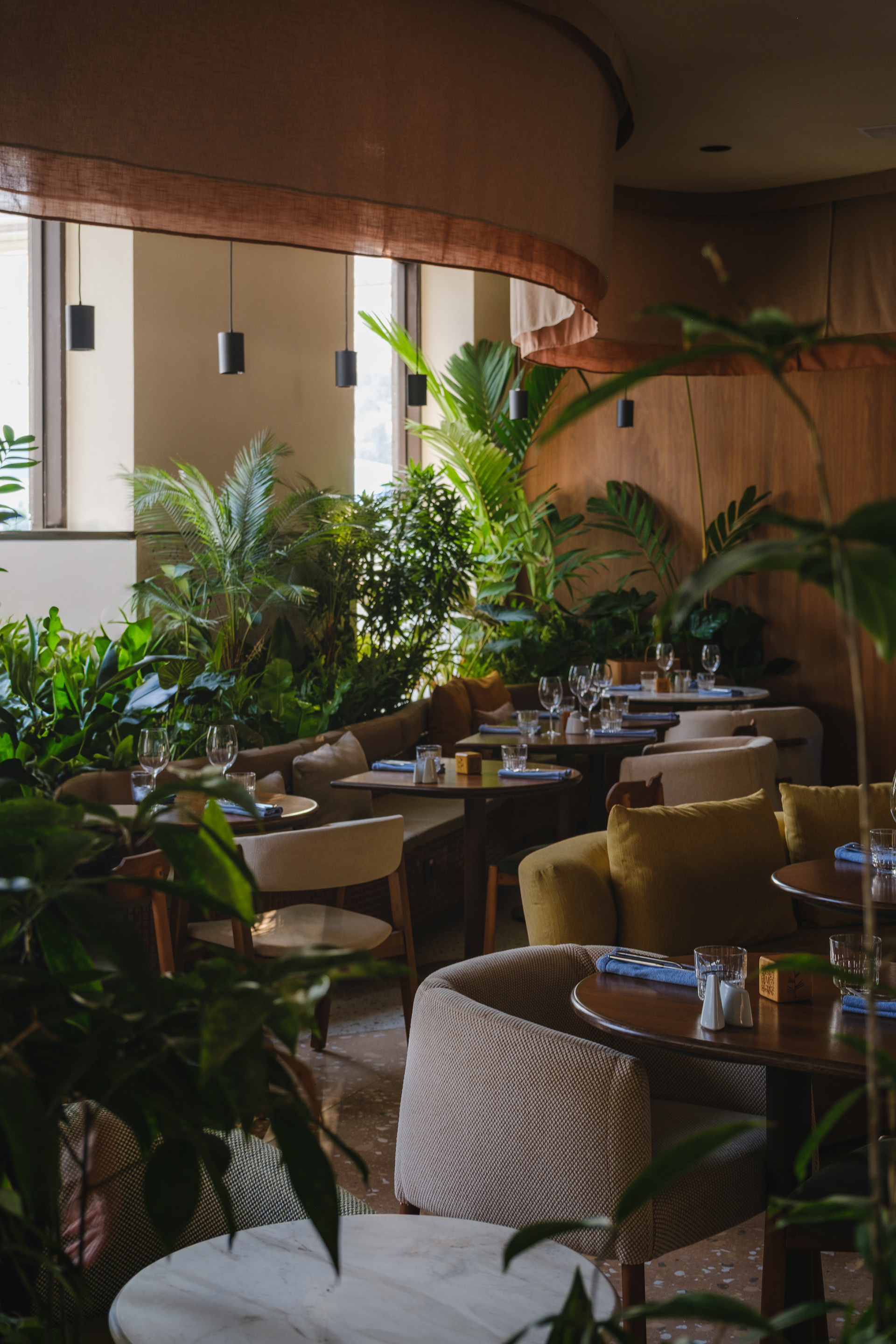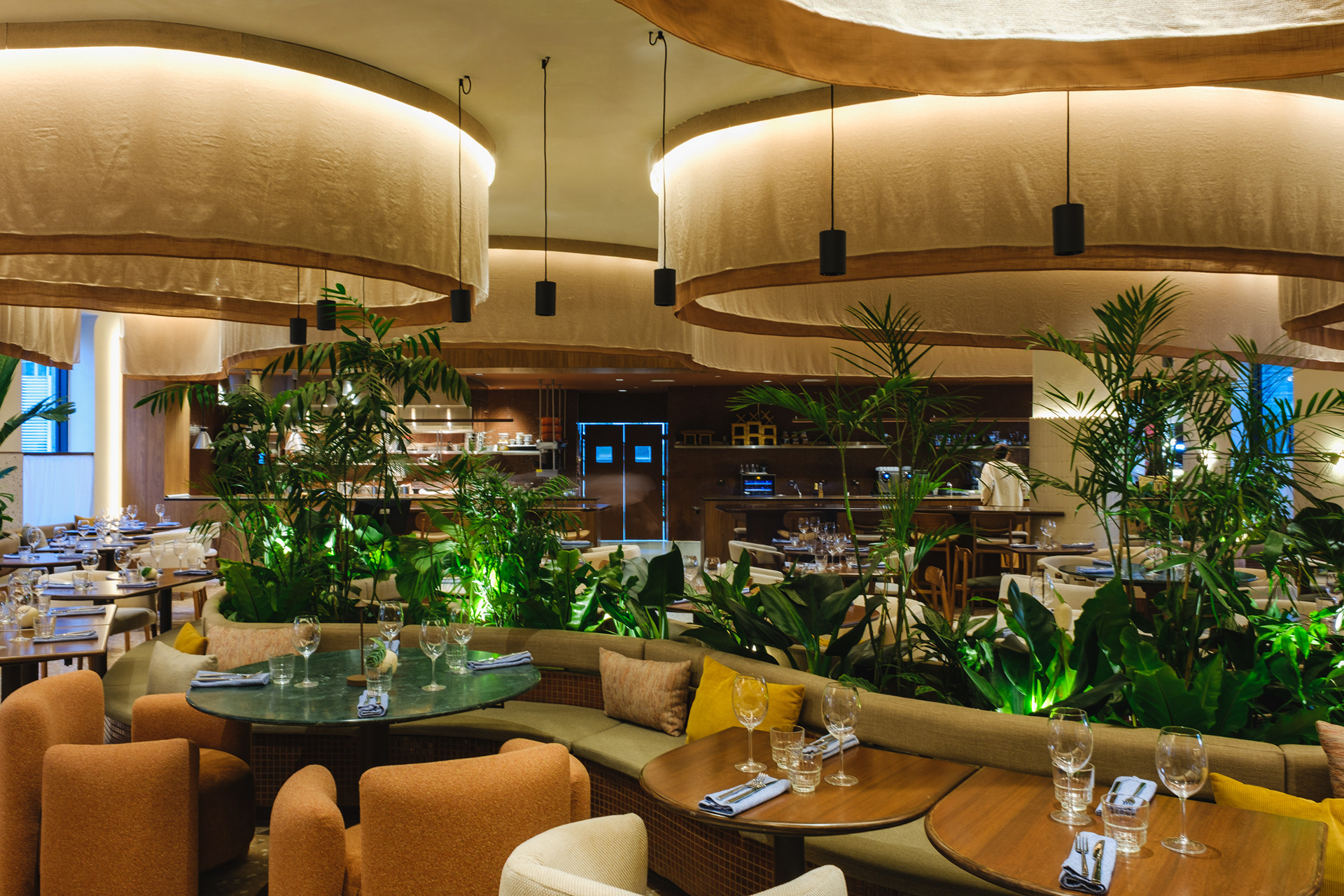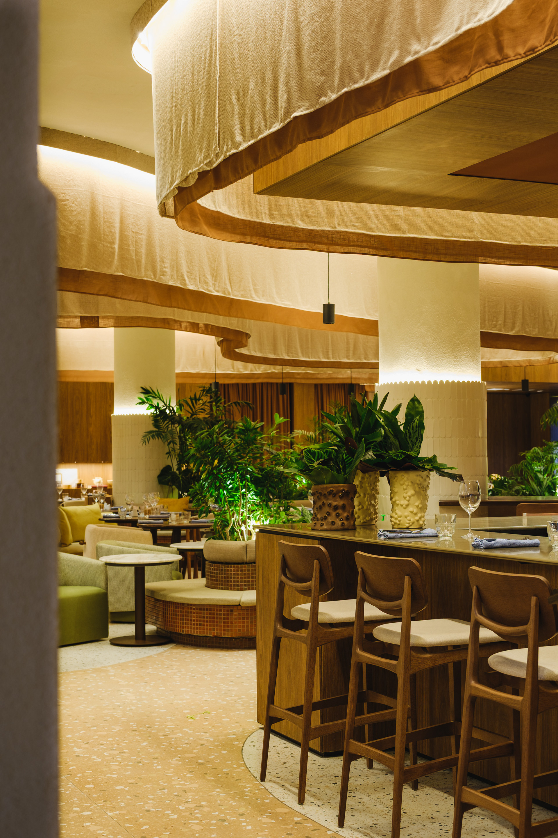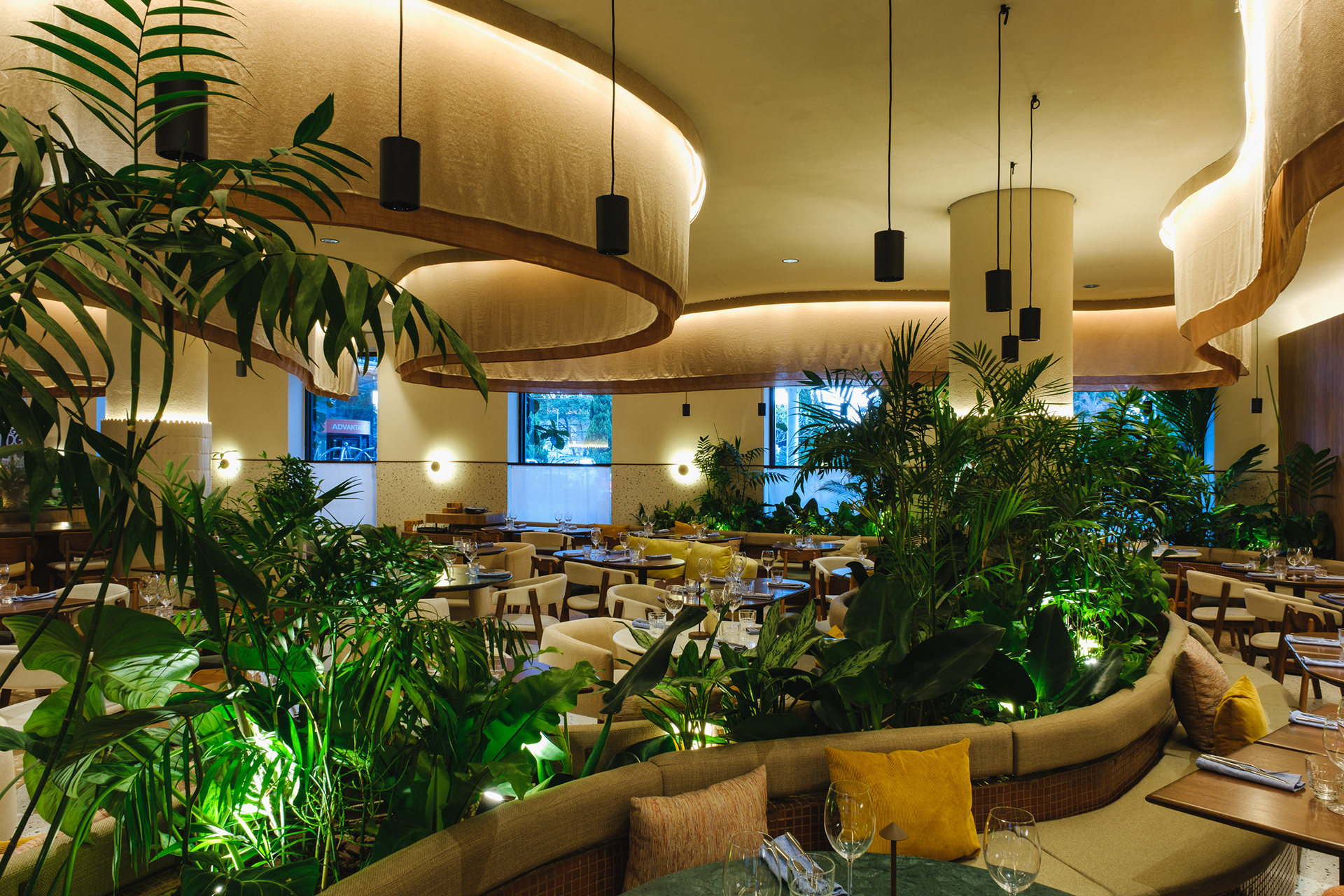 Vegetation is abundant throughout the restaurant, with a dedicated irrigation and lighting system to ensure proper maintenance of the greenery even in a space with limited natural light.