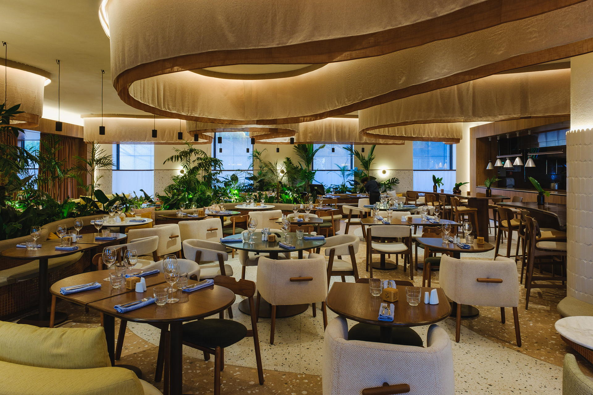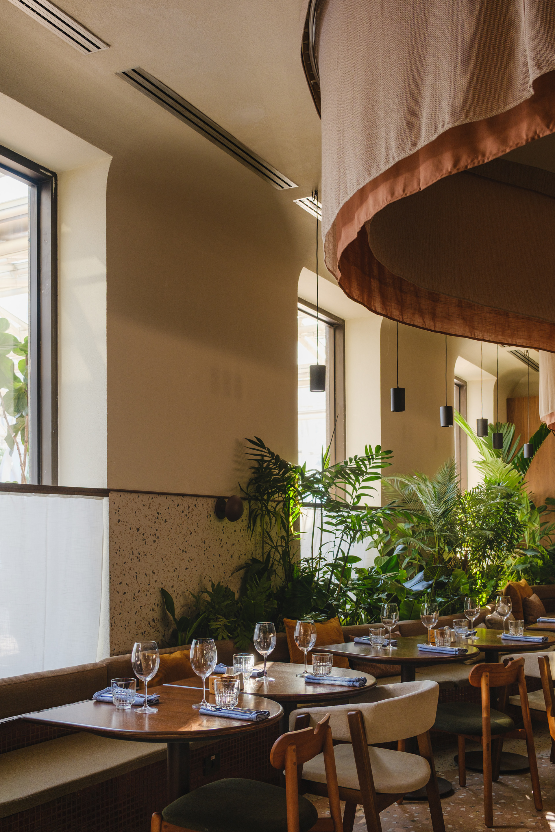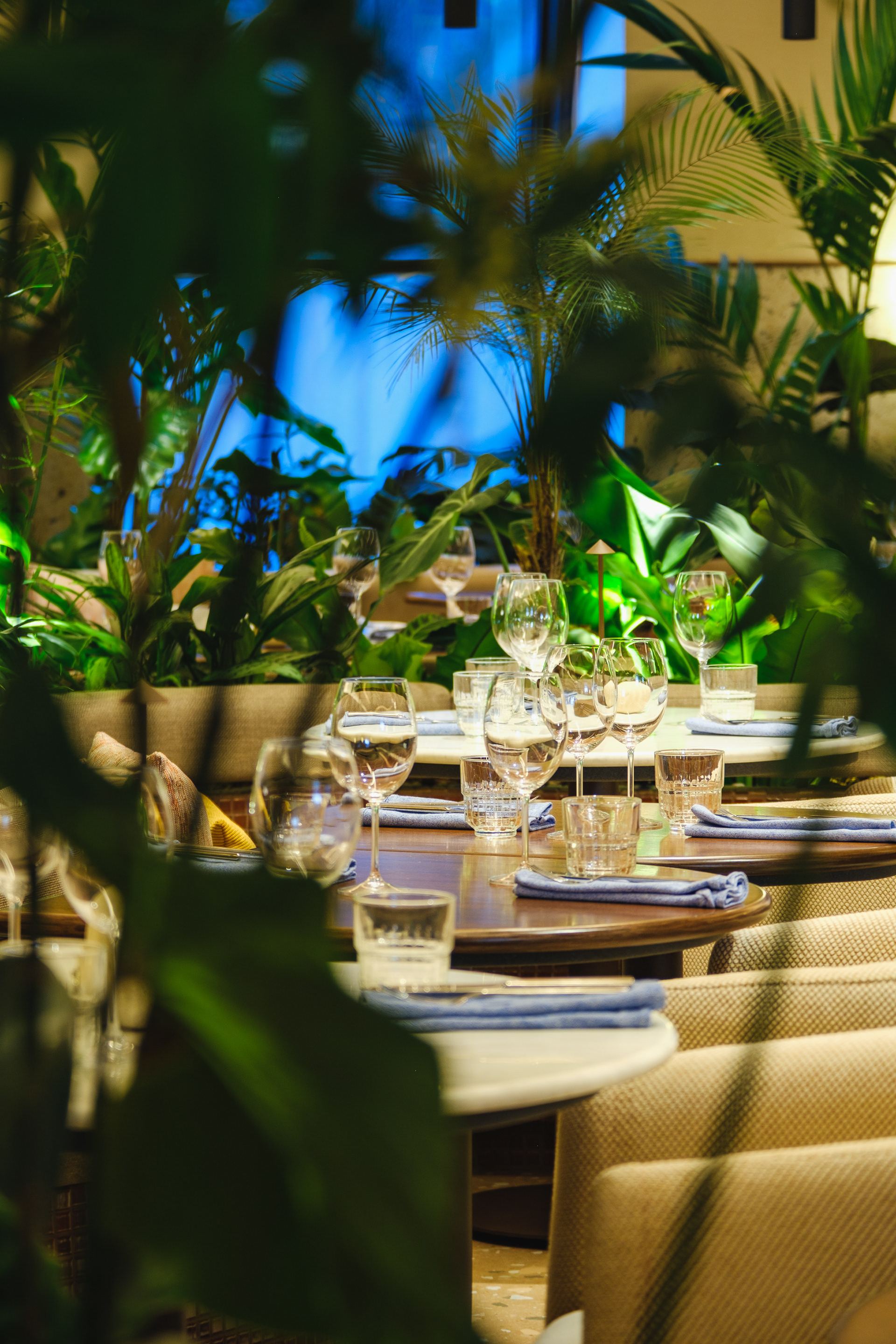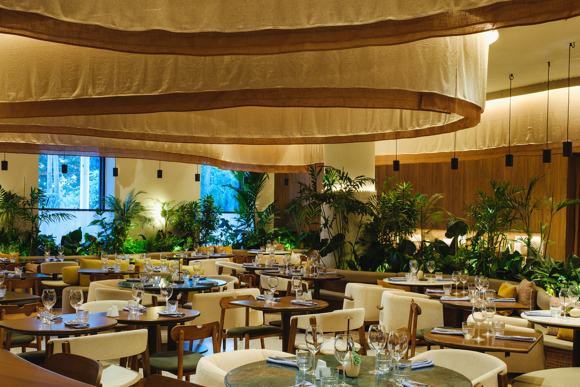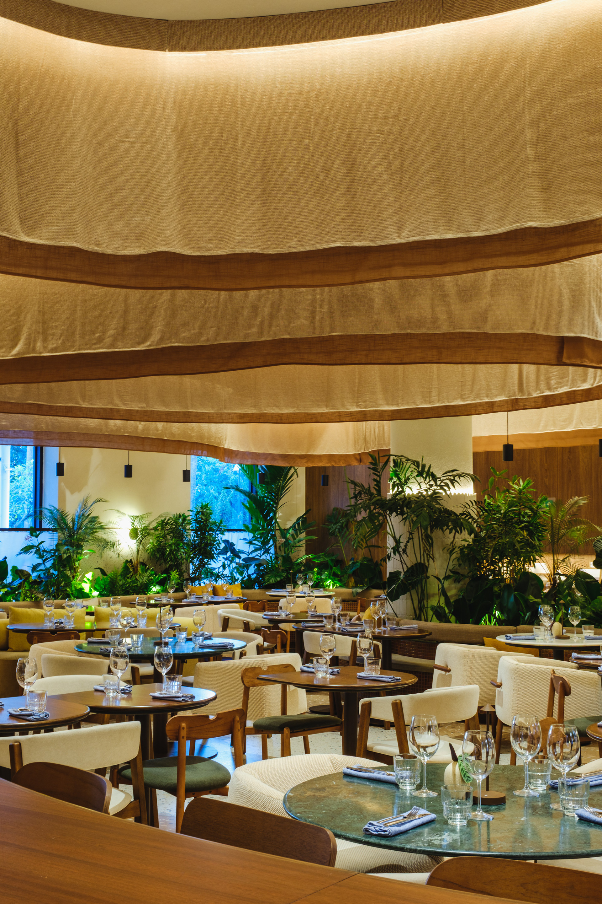 Vegetation is abundant throughout the restaurant, with a dedicated irrigation and lighting system to ensure proper maintenance of the greenery even in a space with limited natural light.