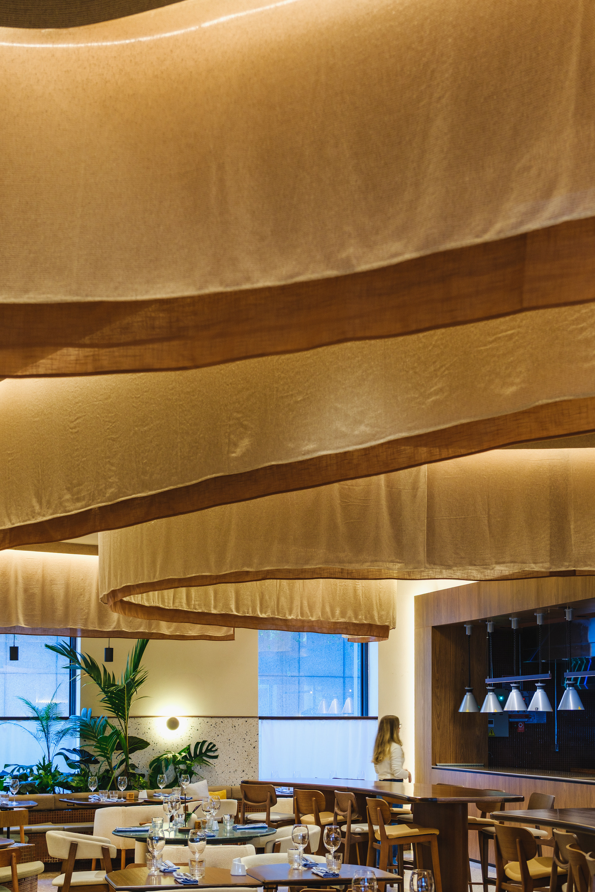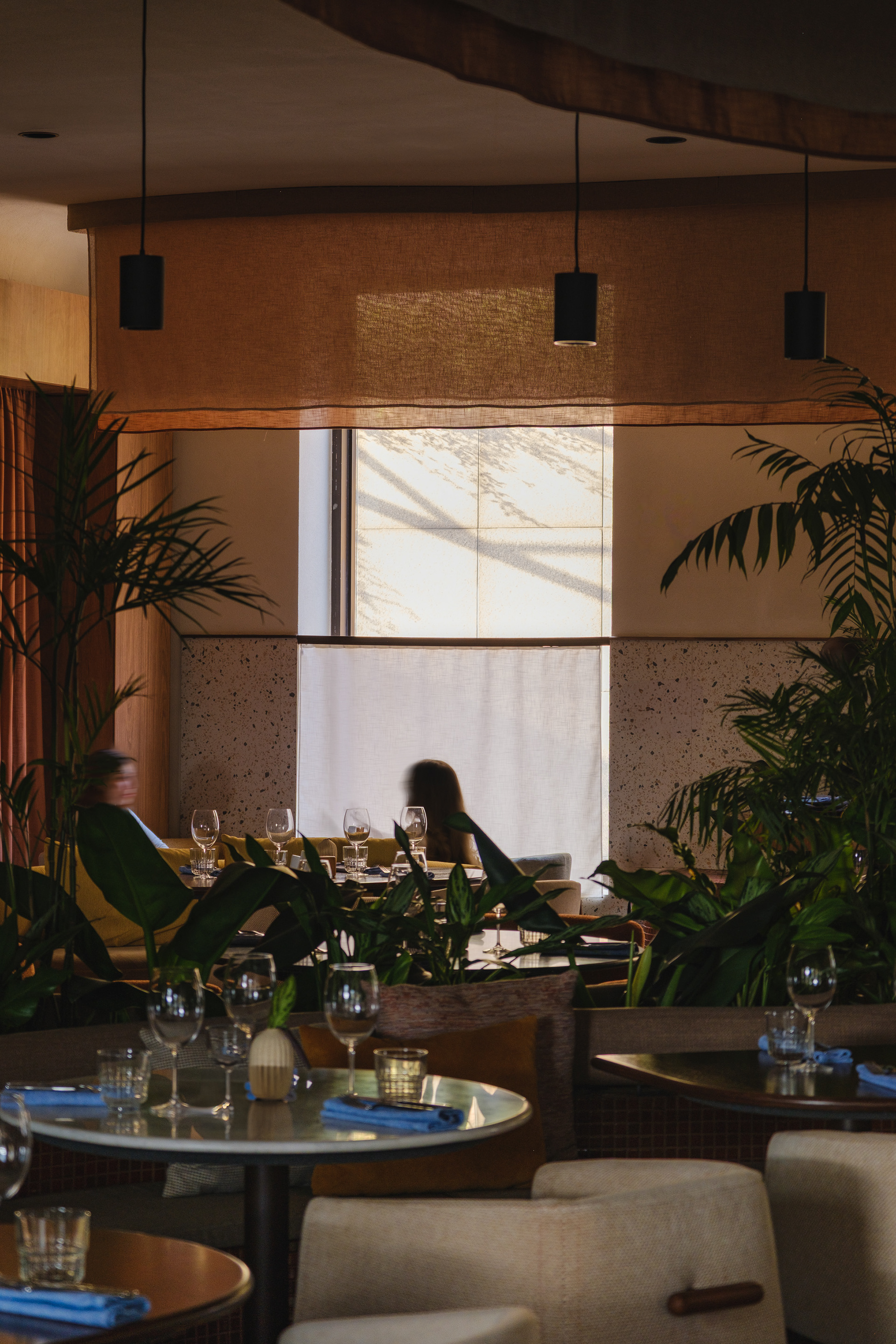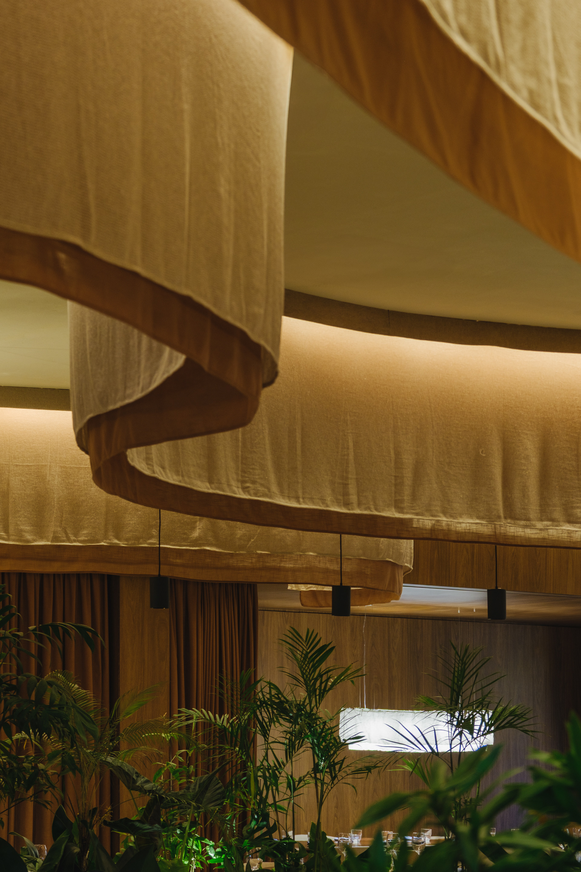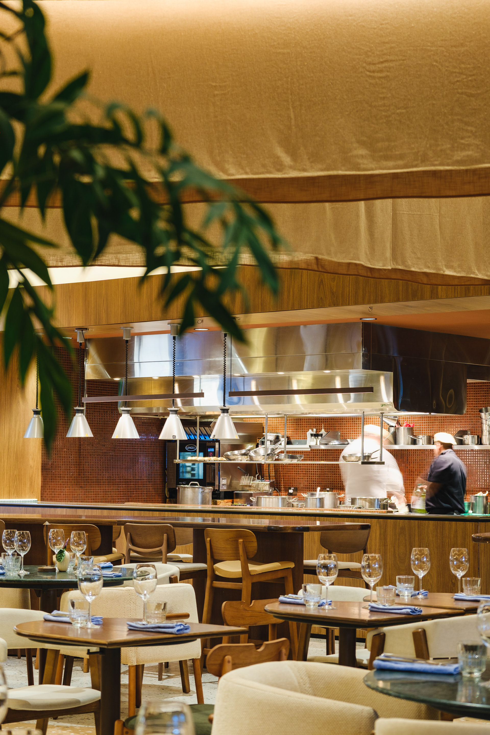 Vegetation is abundant throughout the restaurant, with a dedicated irrigation and lighting system to ensure proper maintenance of the greenery even in a space with limited natural light.