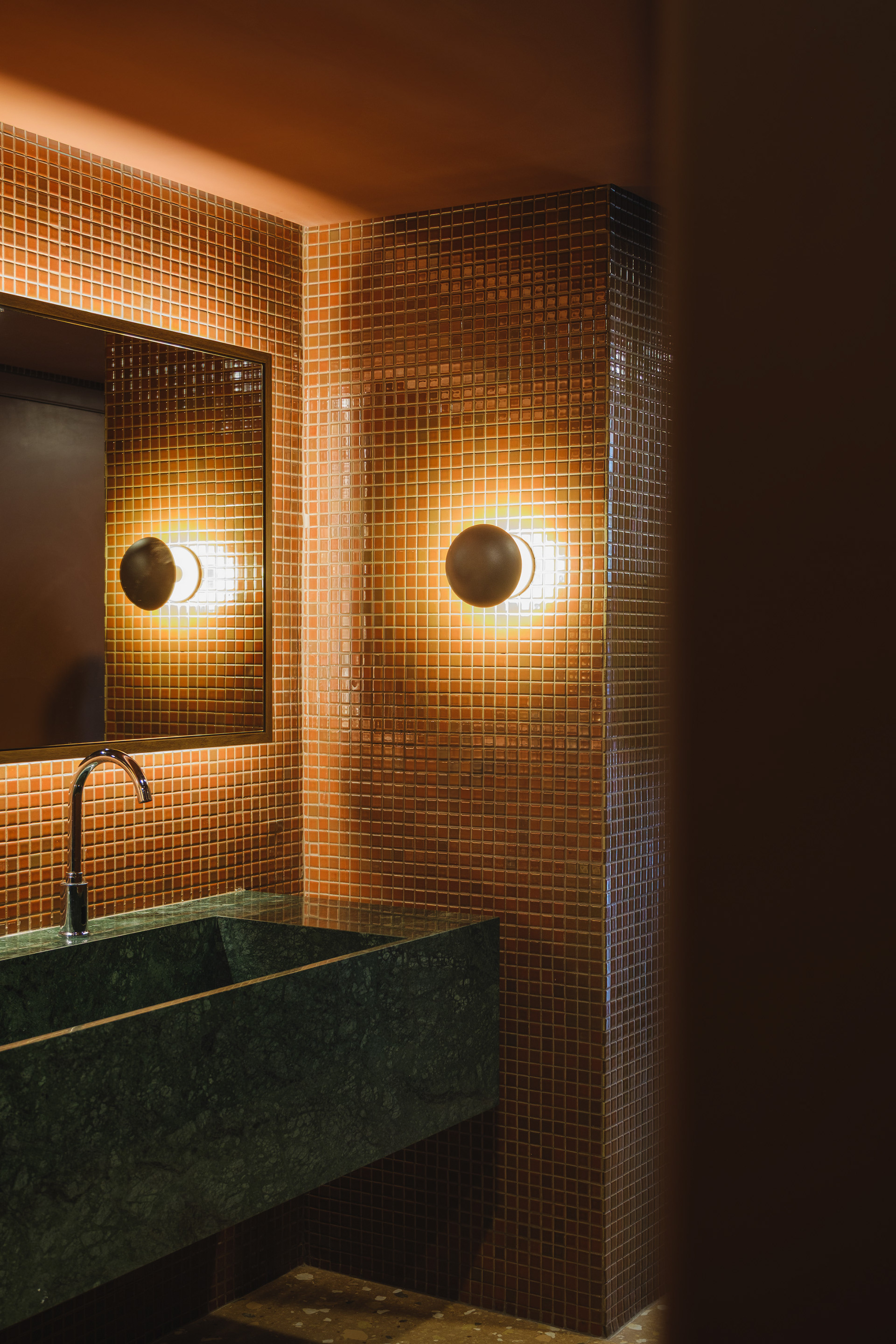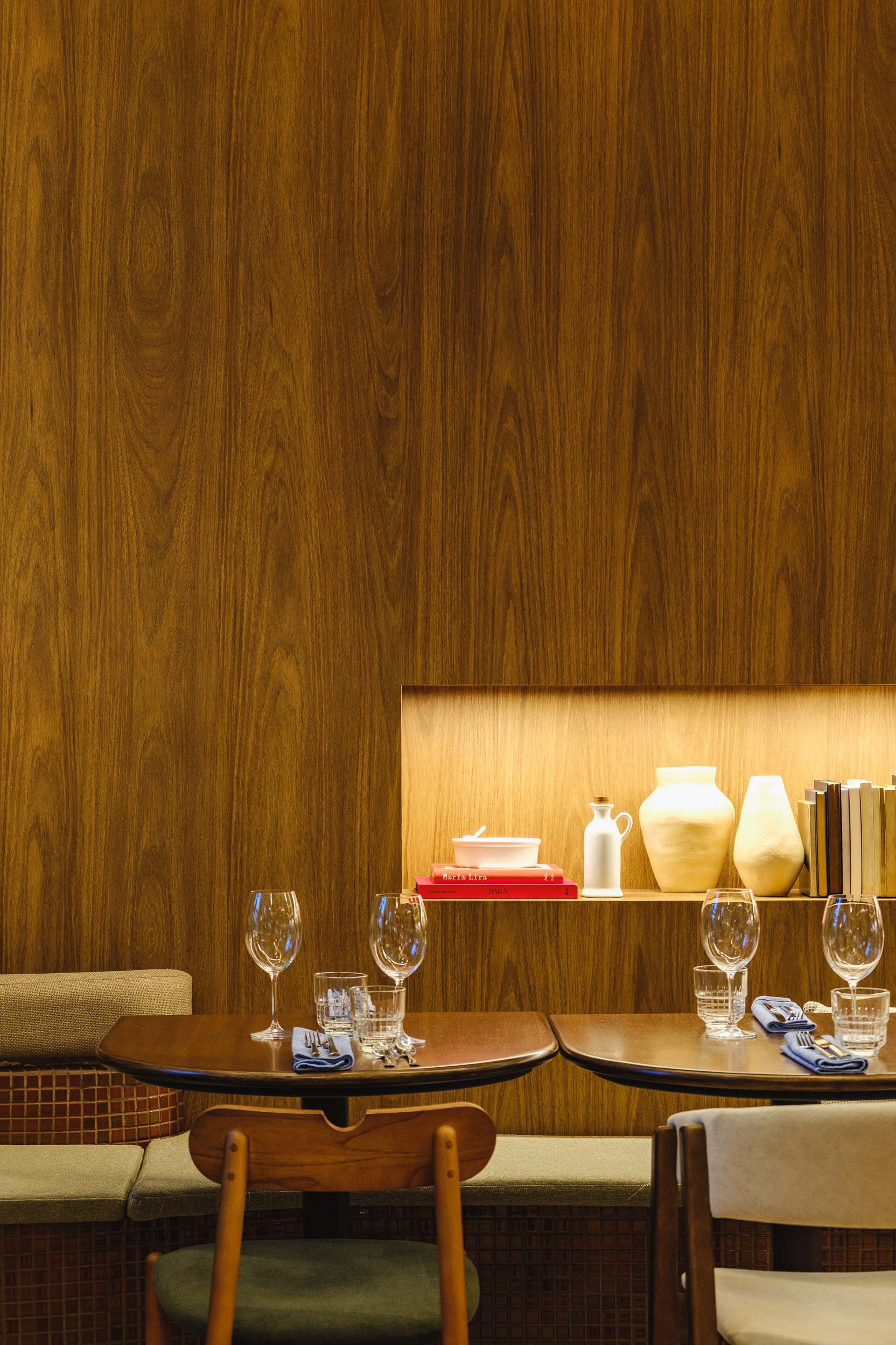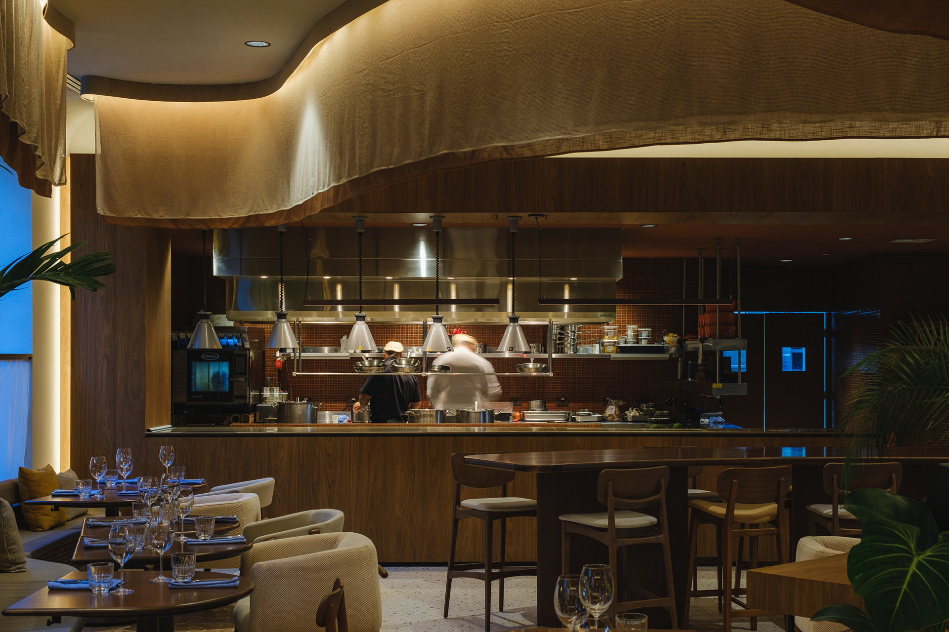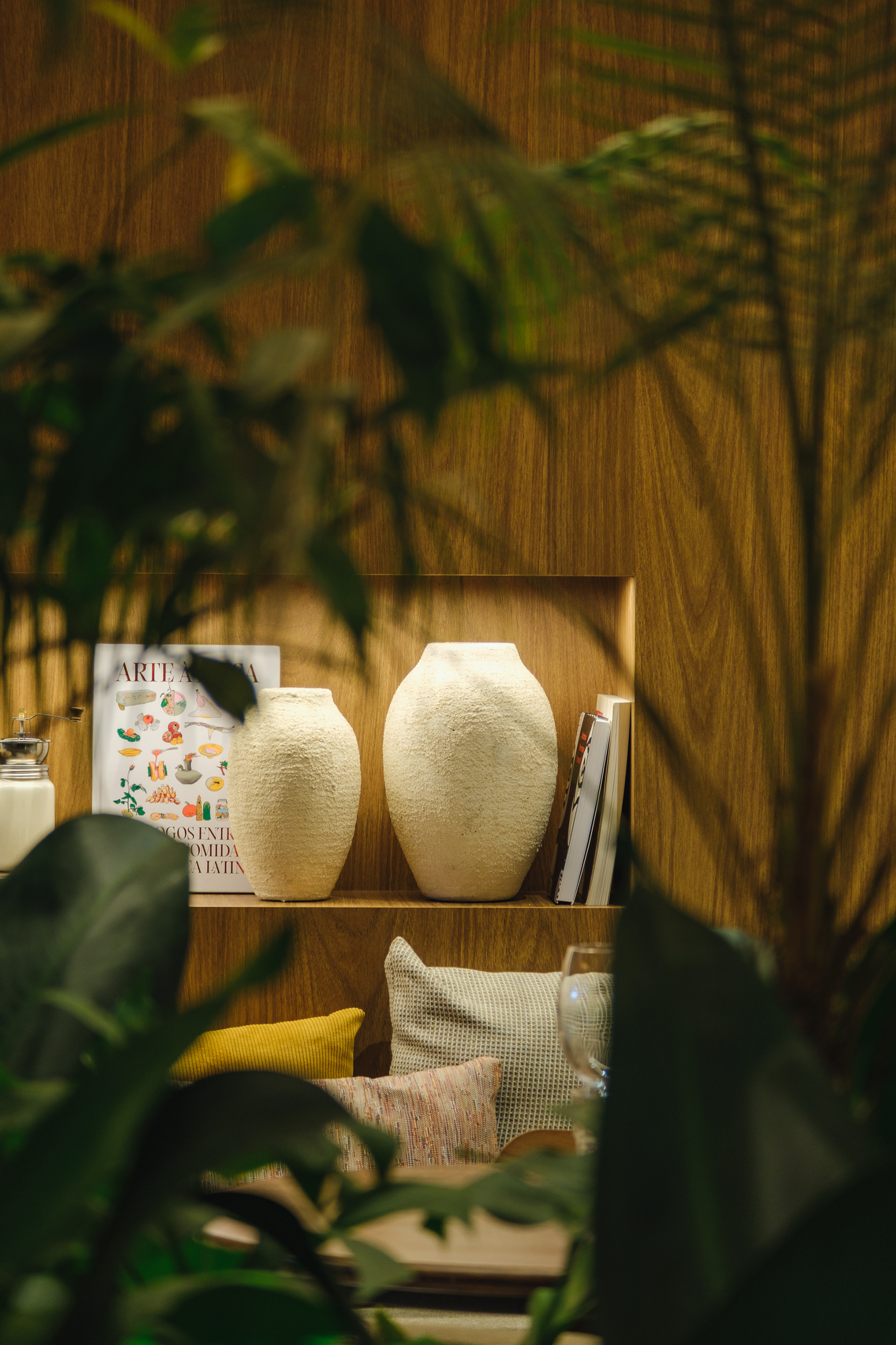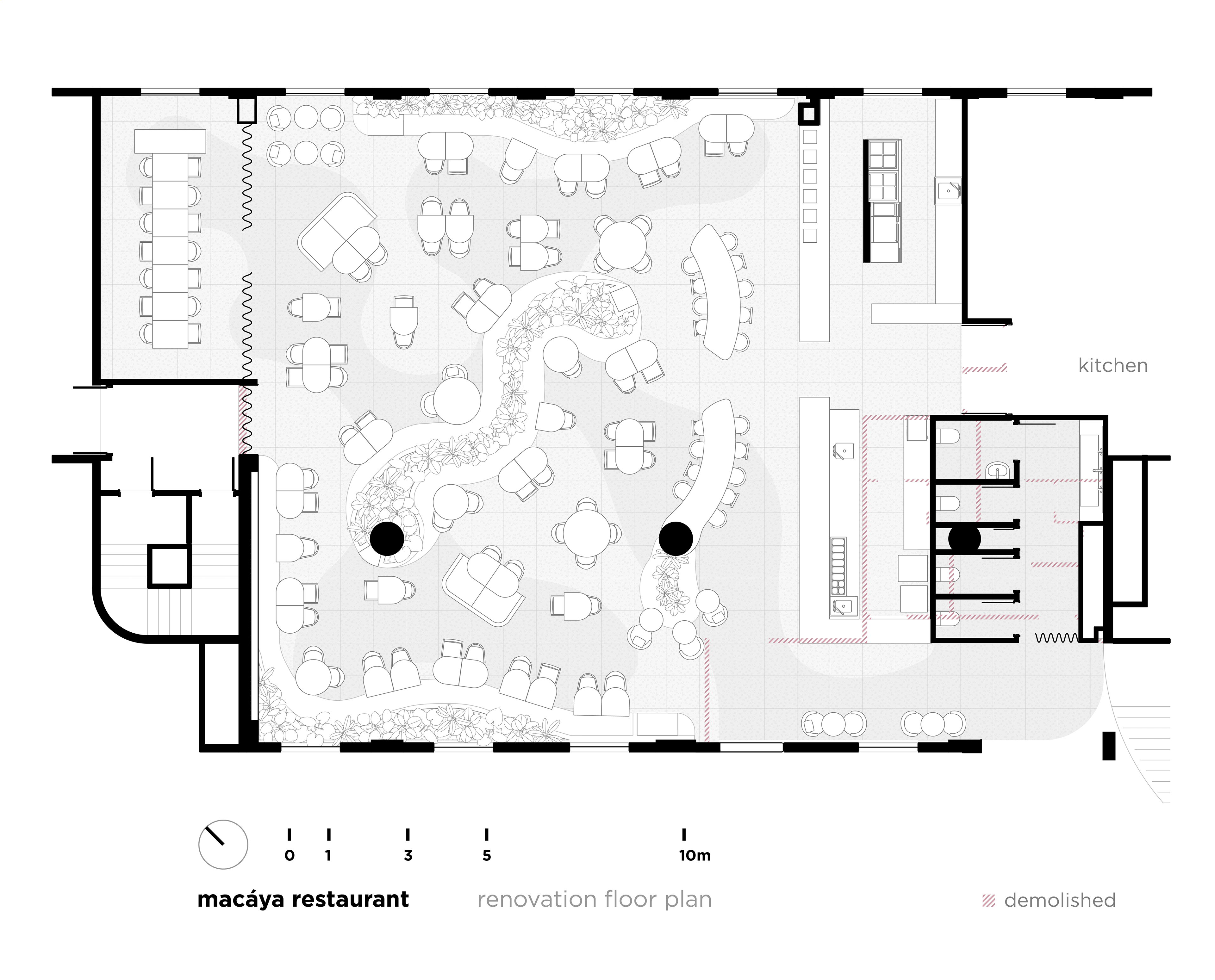 Vegetation is abundant throughout the restaurant, with a dedicated irrigation and lighting system to ensure proper maintenance of the greenery even in a space with limited natural light.