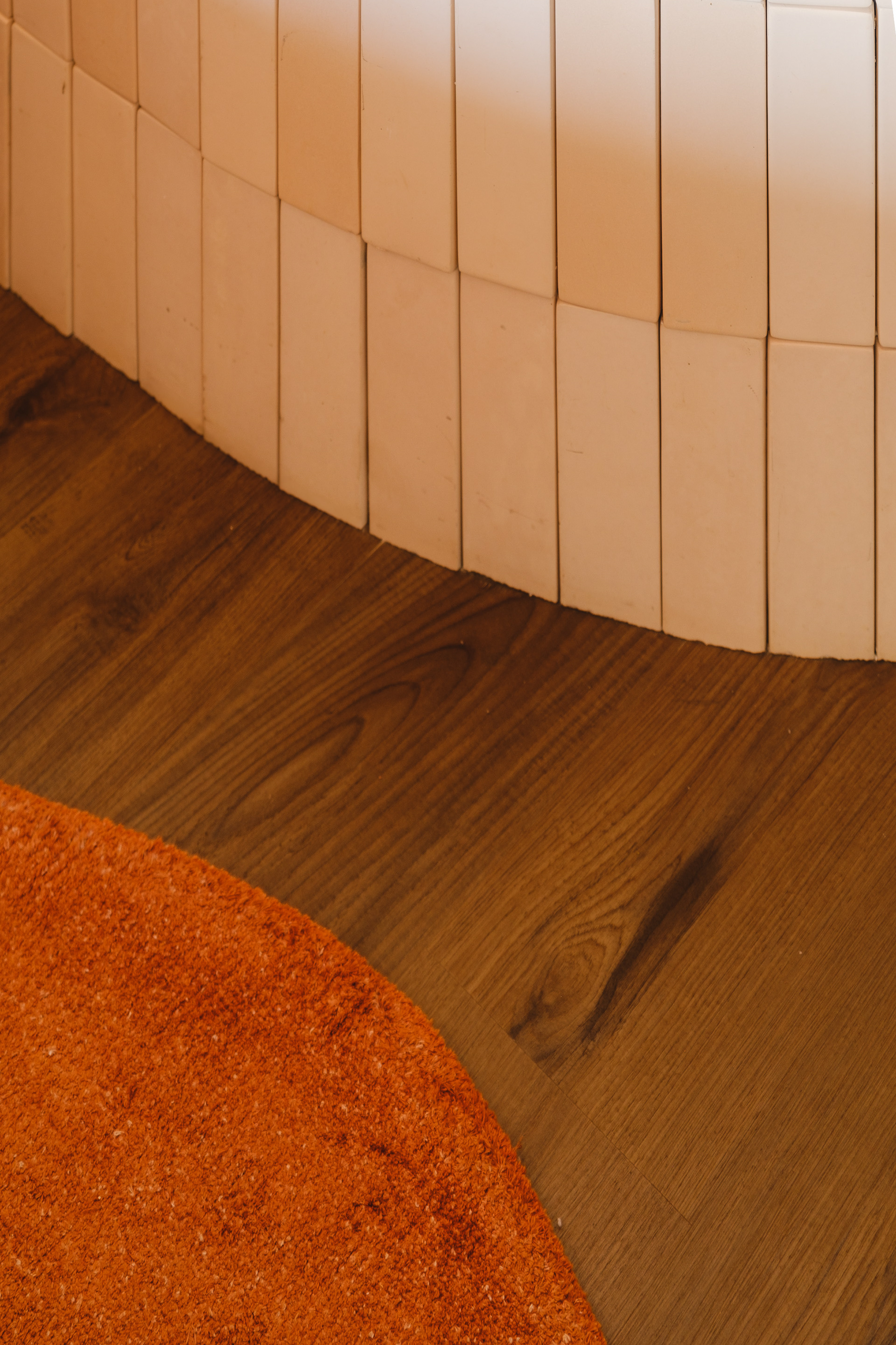 The main wall of the room was clad with ceramic pieces in natural tones, forming a curved panel with indirect lighting. The fabric headboard detaches slightly from this curved surface, creating a light composition. The flooring is wood-look vinyl, and the rug, with an organic two-tone design, complements the environment, enhancing the fluidity of the forms and the sense of coziness.