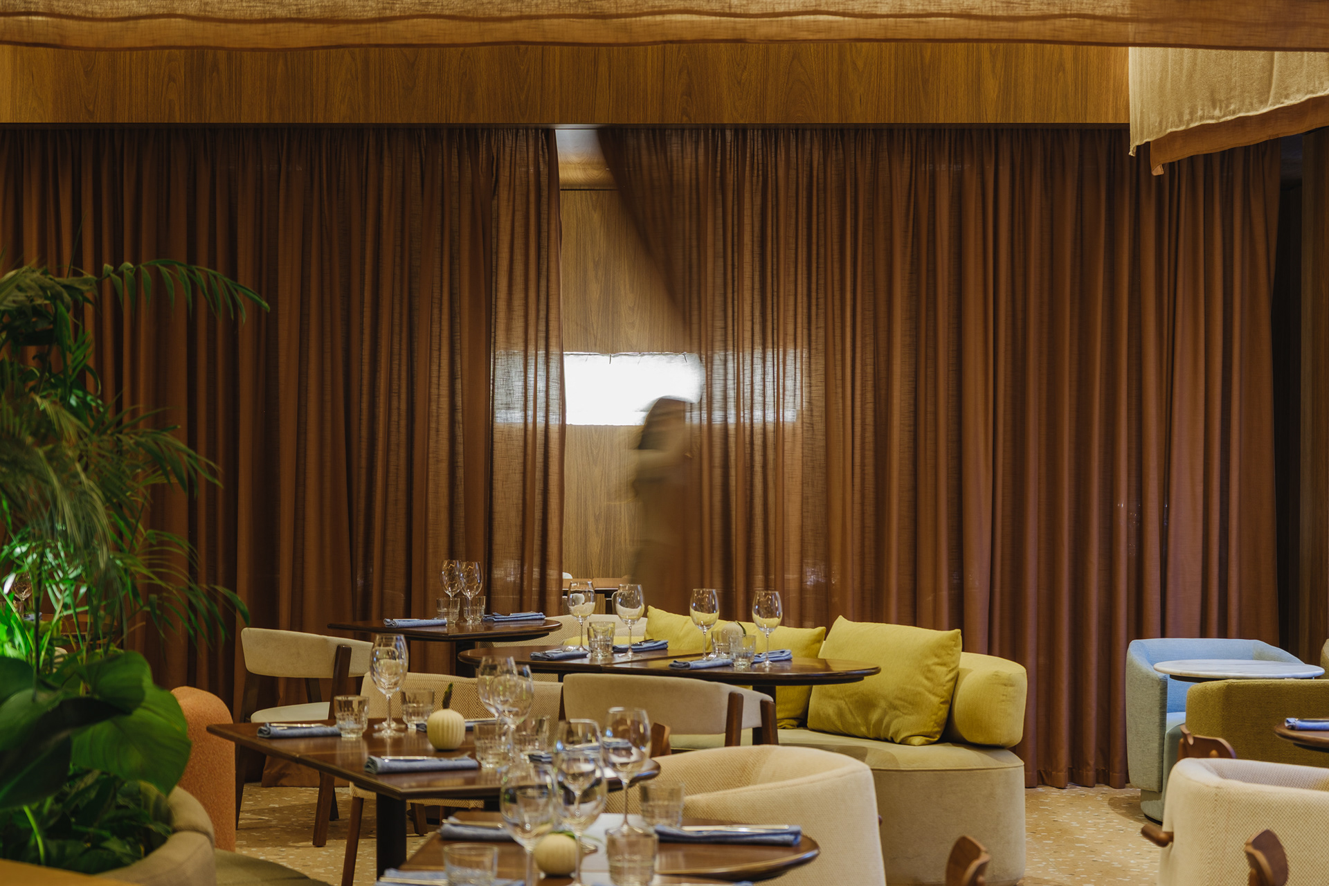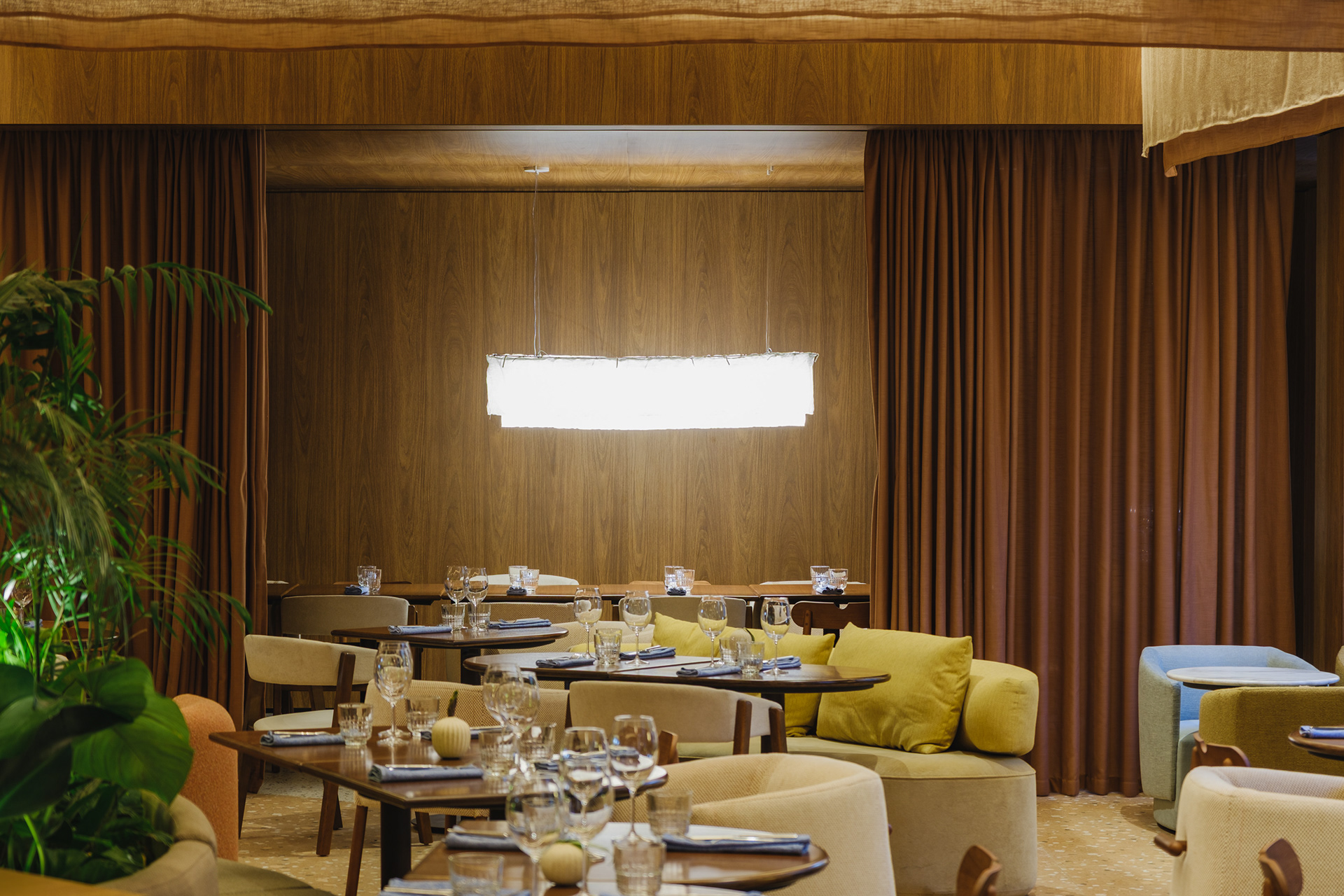 The restaurant underwent a complete renovation to expand its functionality, becoming an all-day venue serving breakfast, lunch, dinner, and events. It was necessary to increase seating capacity while maintaining proportion in relation to the number of rooms in the hotel.