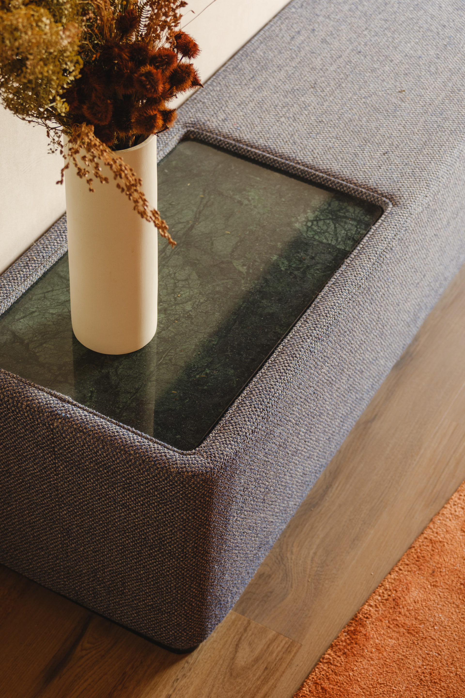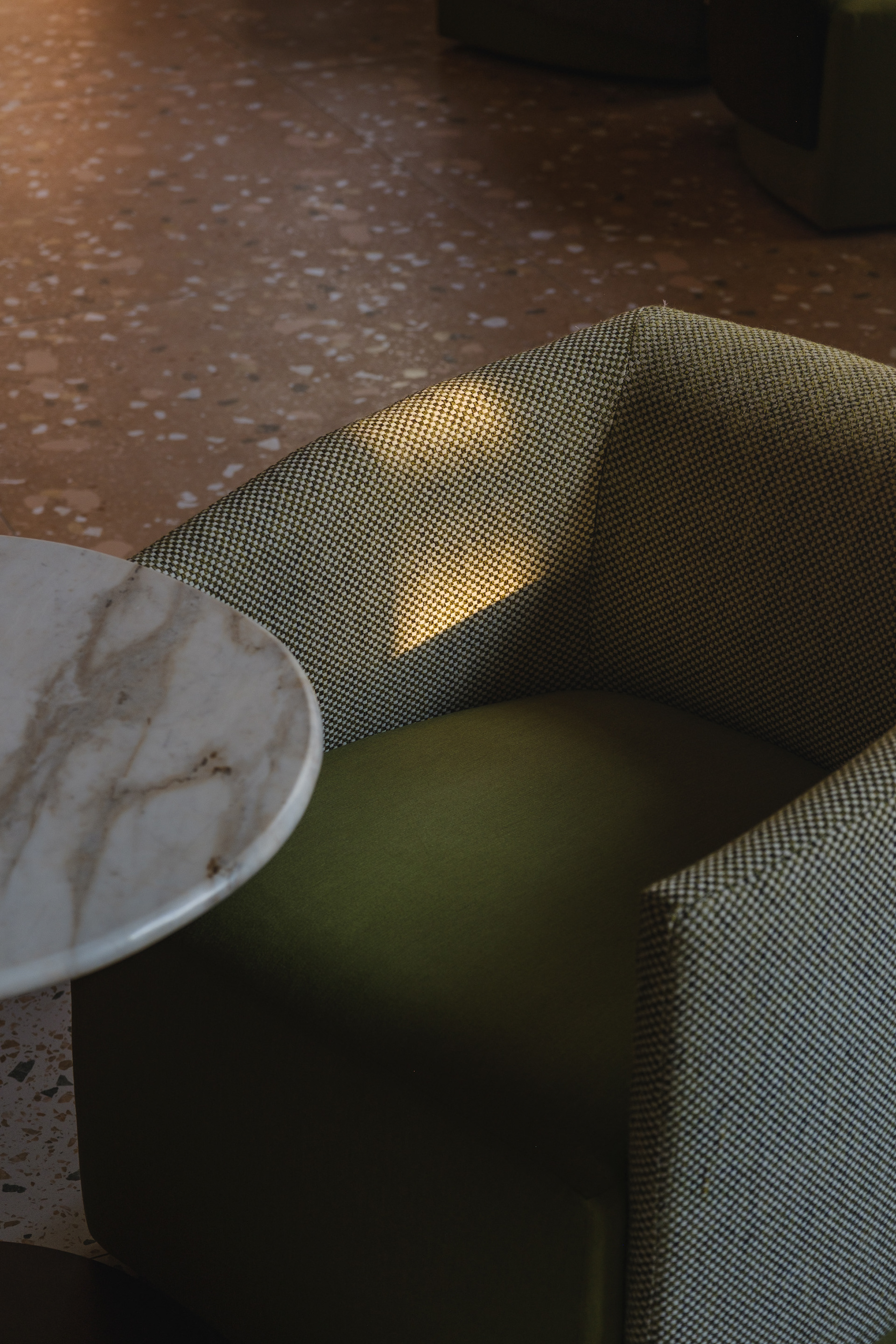 Different seating types were included: two-seater sofas, continuous sofas, armchairs in various sizes and heights, stools at high tables, and modular tables designed specifically for the space, which can be rearranged to accommodate groups of different sizes.
