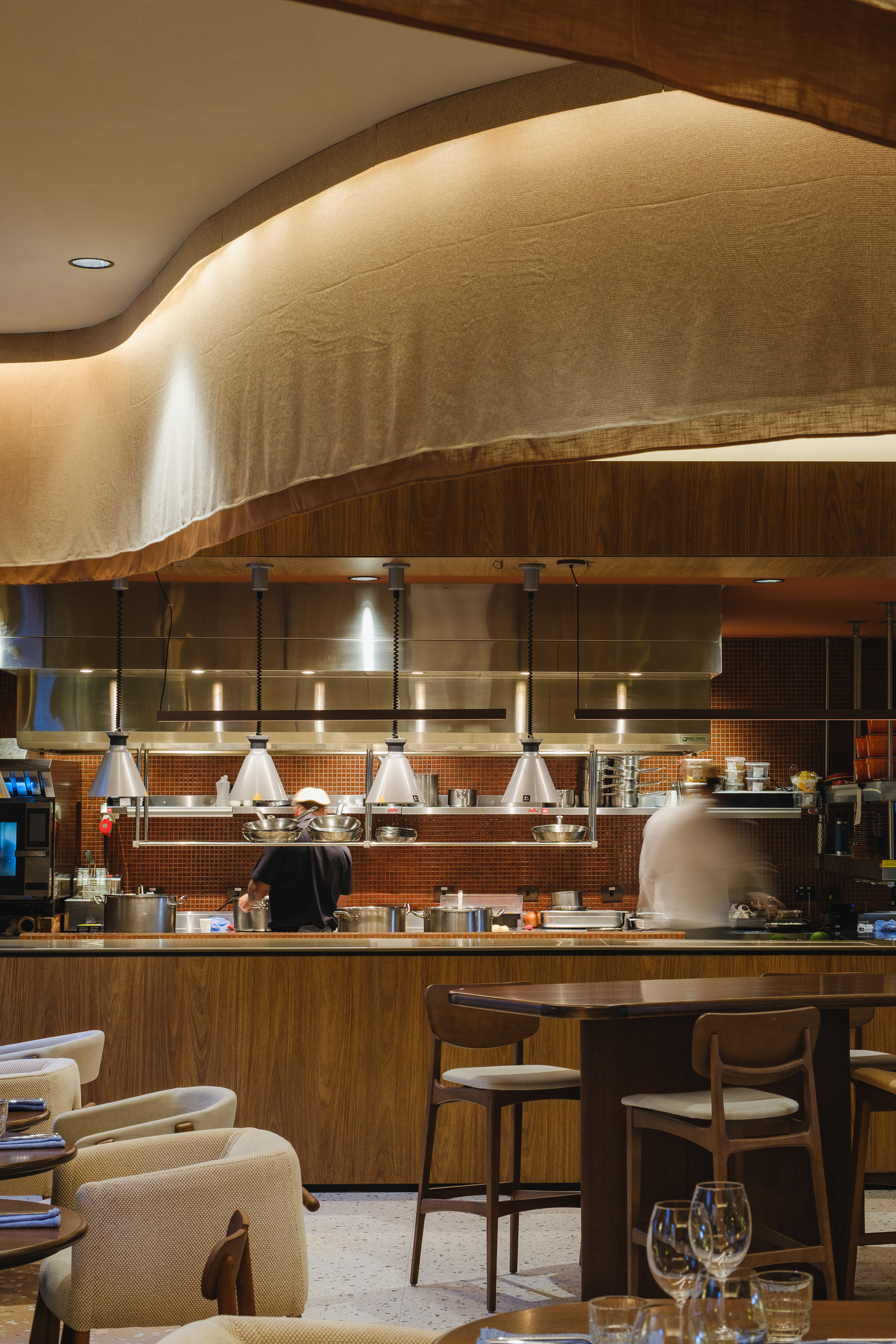 One of the key elements introduced was the show kitchen, allowing guests to watch food preparation at different times of the day. The morning buffet area transforms into an open kitchen during the rest of the day.