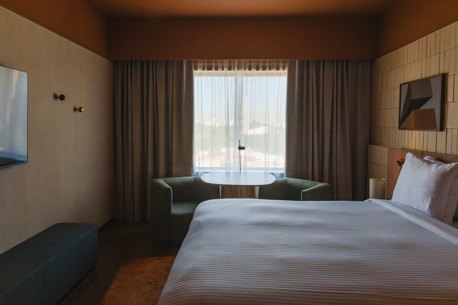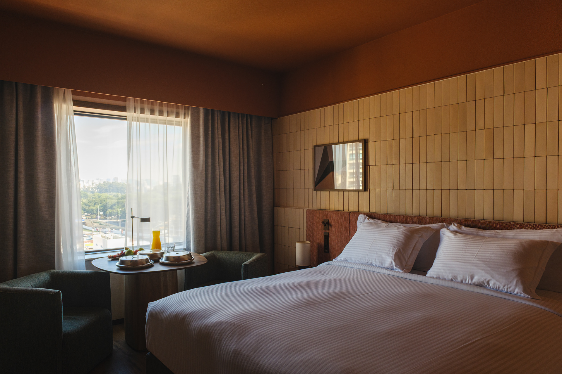 The renovation project for the Pullman Ibirapuera focused on redesigning the hotel’s rooms, corridors, and restaurant. The proposal followed the new global guidelines of the Pullman brand, which promote a more natural, organic, and welcoming aesthetic, in contrast to the brand’s previous, more vibrant concepts.