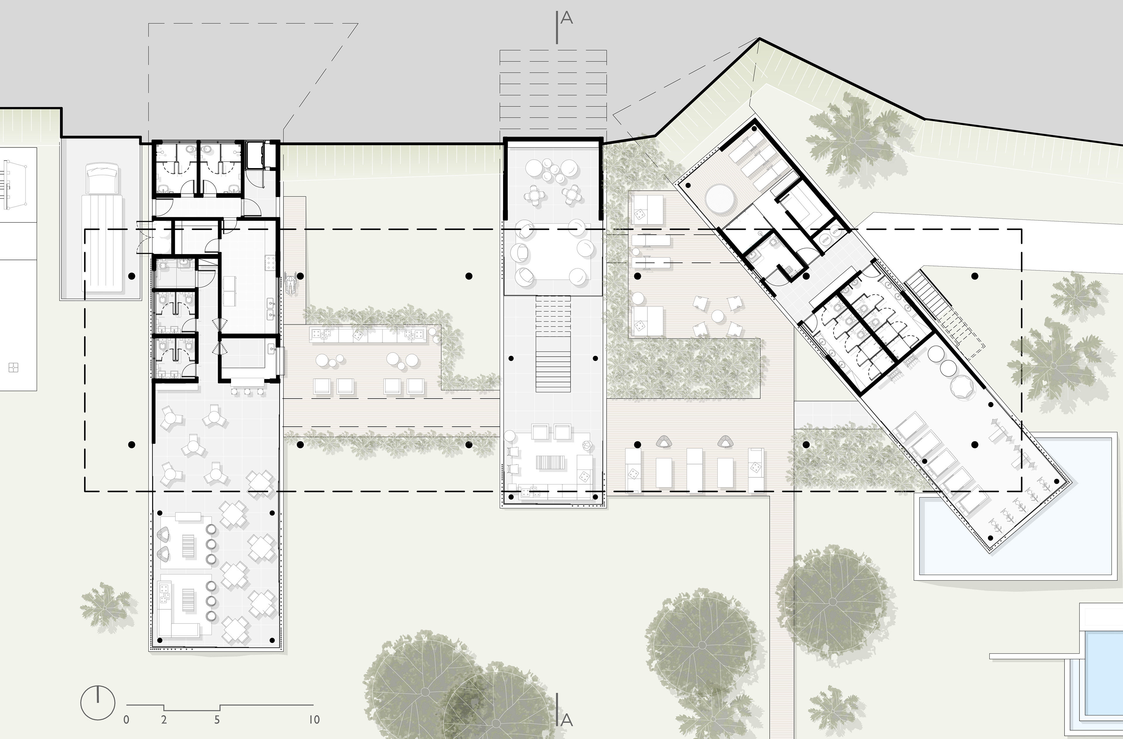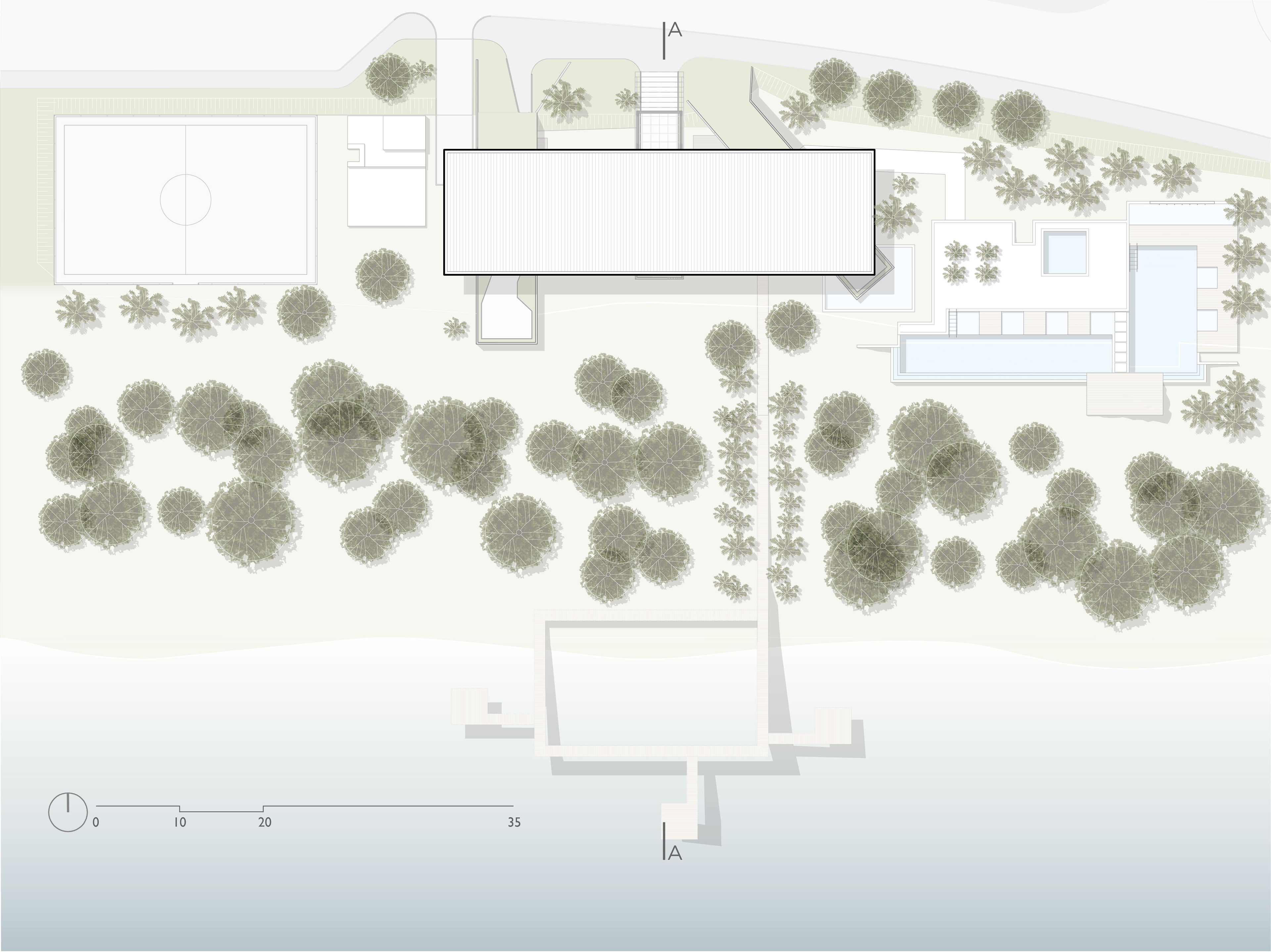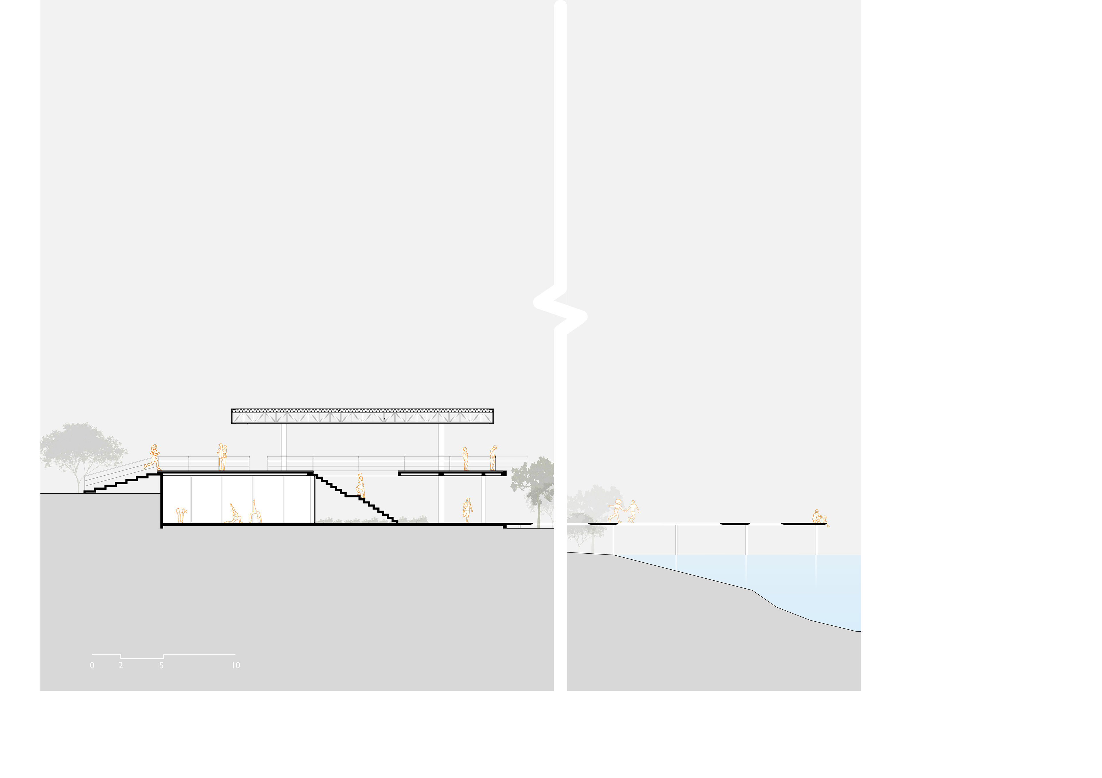 The game room is located on the top of these volumes, as well as the walkway that links the street to the building, from where one can glimpse the beautiful lake. All other rooms are below the street level, giving greater privacy to the users and contact with the land and the lake.