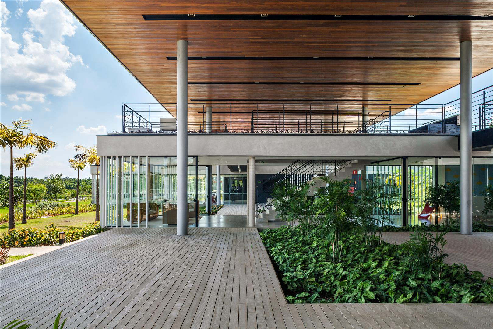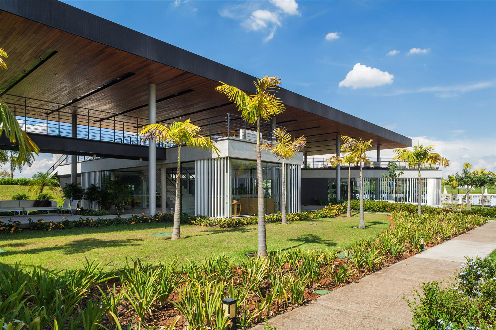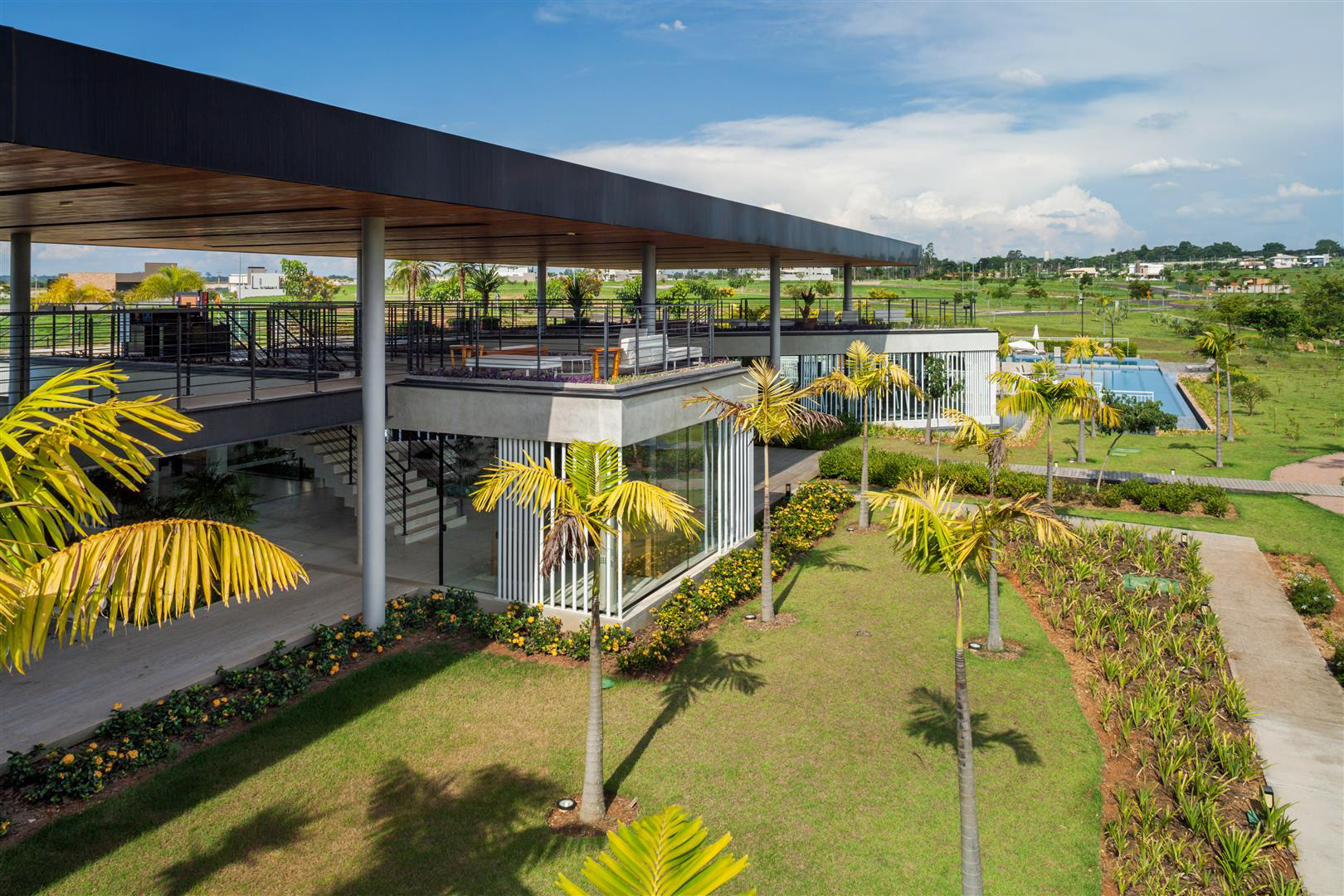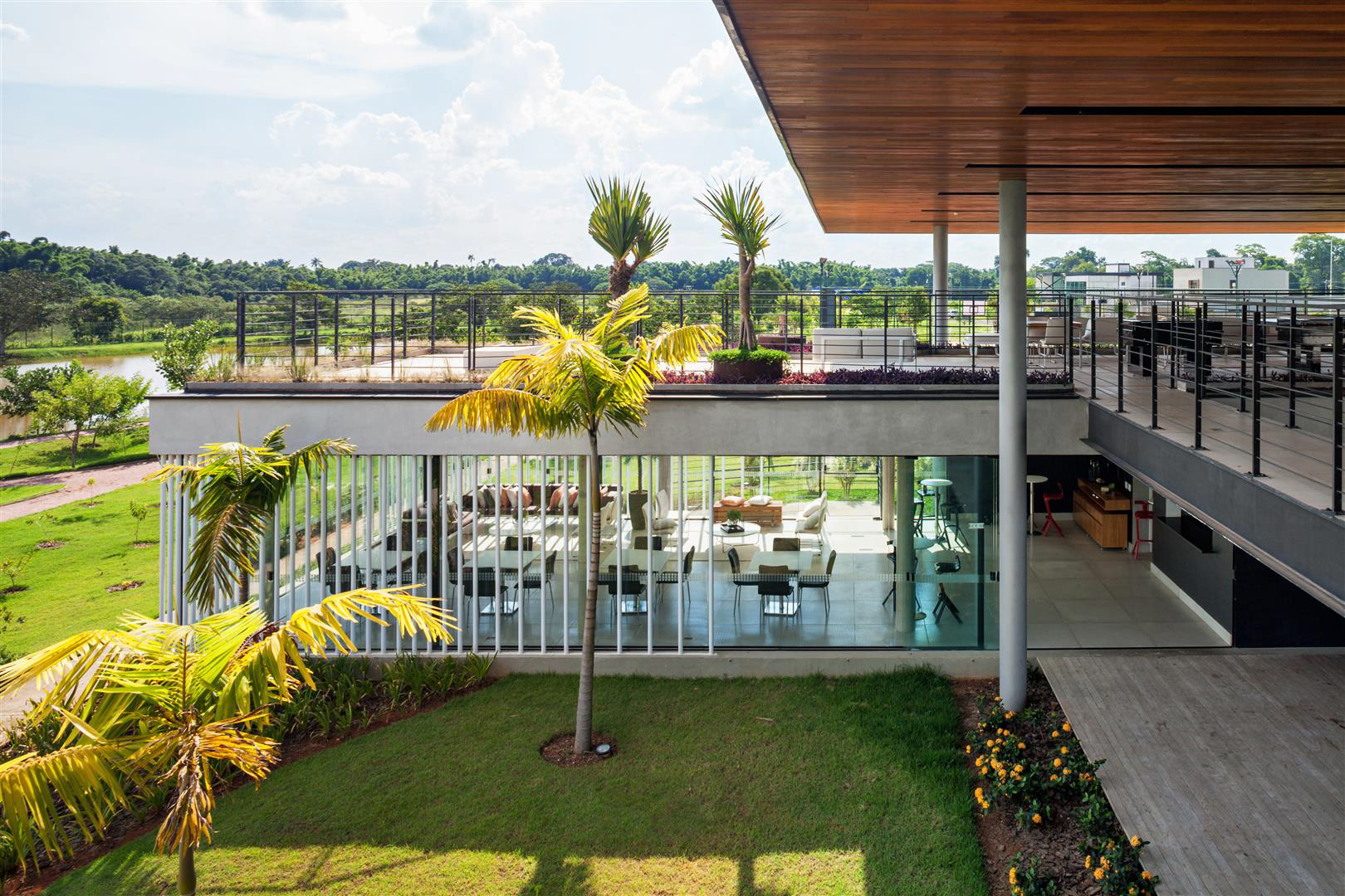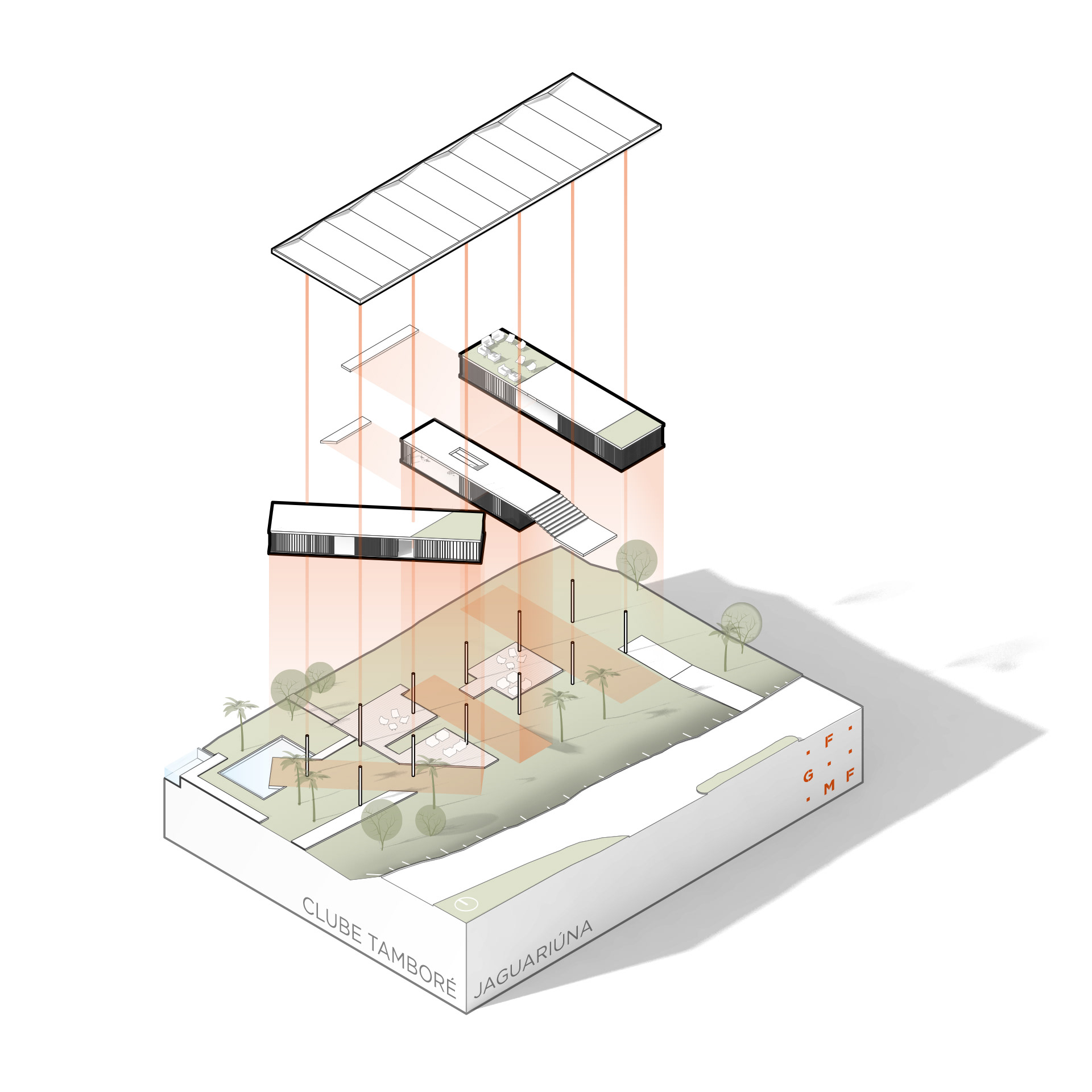 Three linear, non-parallel, blocks implanted in the middle height, with concrete structure and closure mostly in glass and metallic brises organize the main program of the club: party room, kids room, access hall, gymnastics room, changing rooms and spa, as well as living spaces.