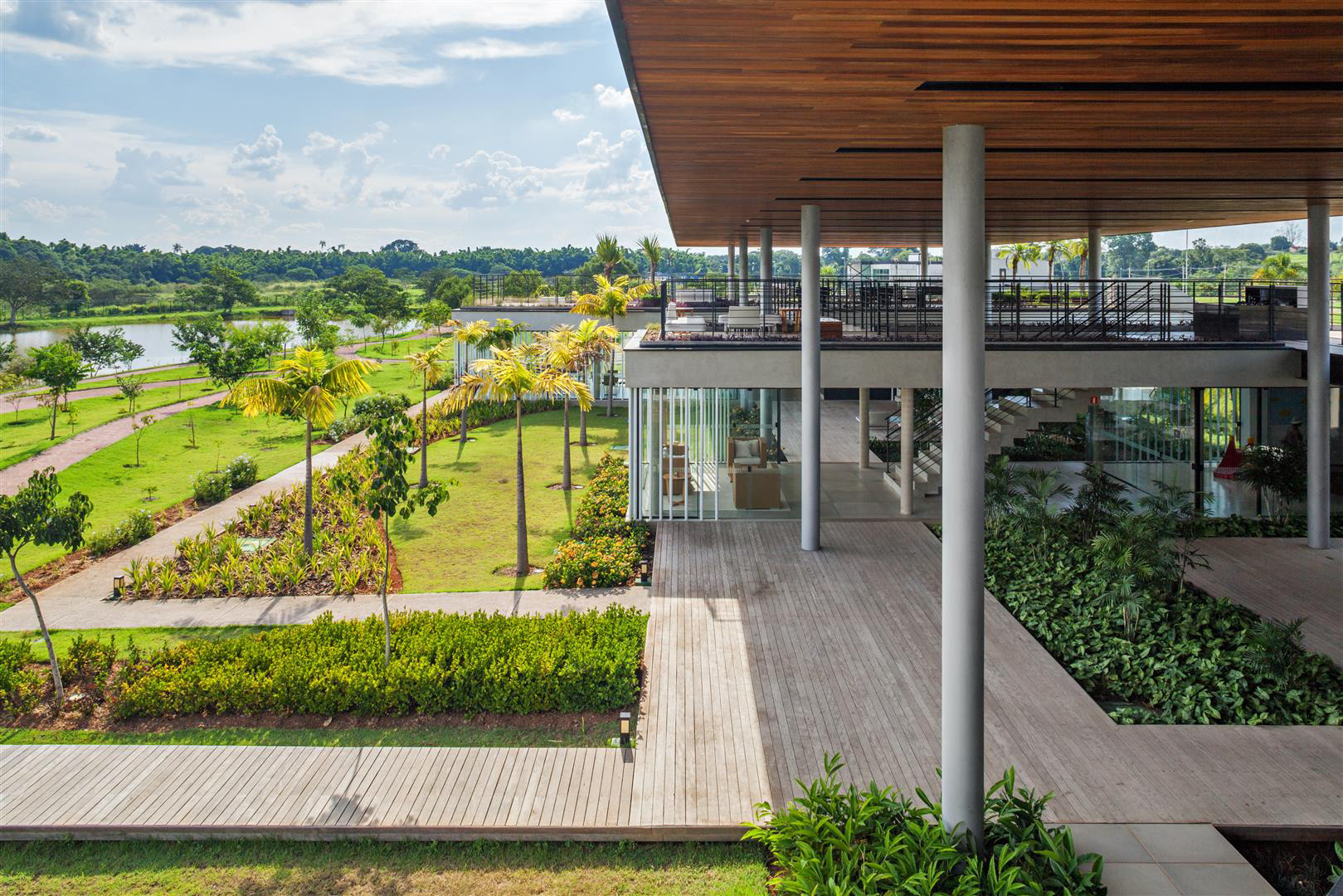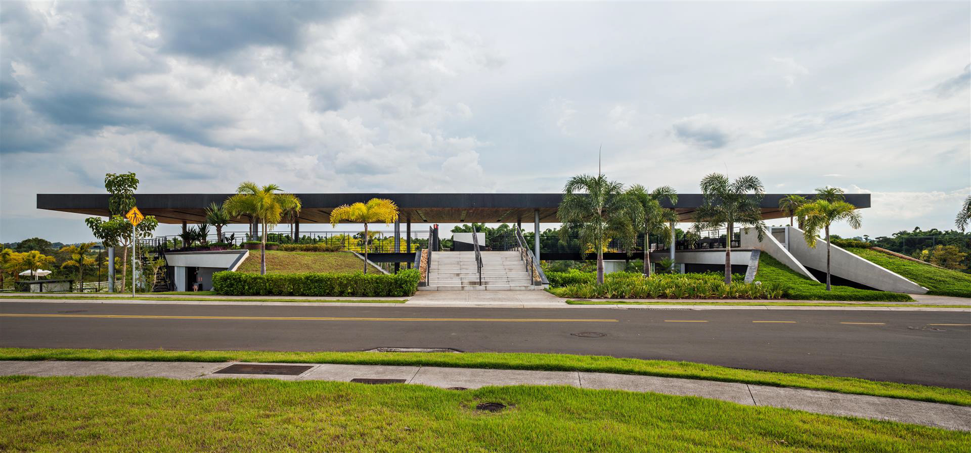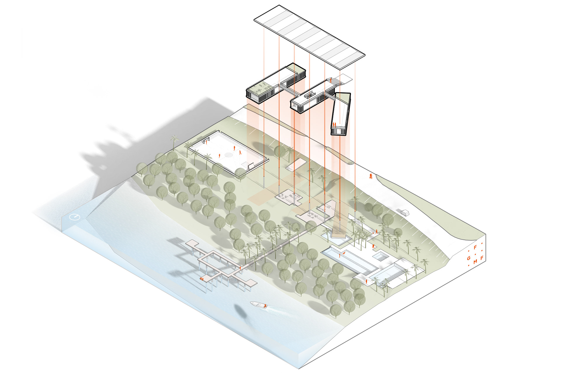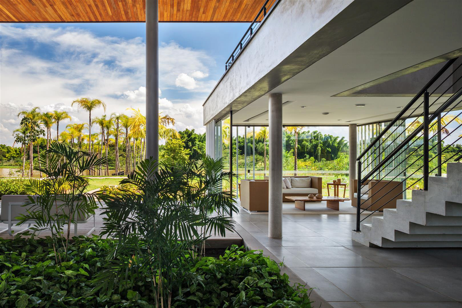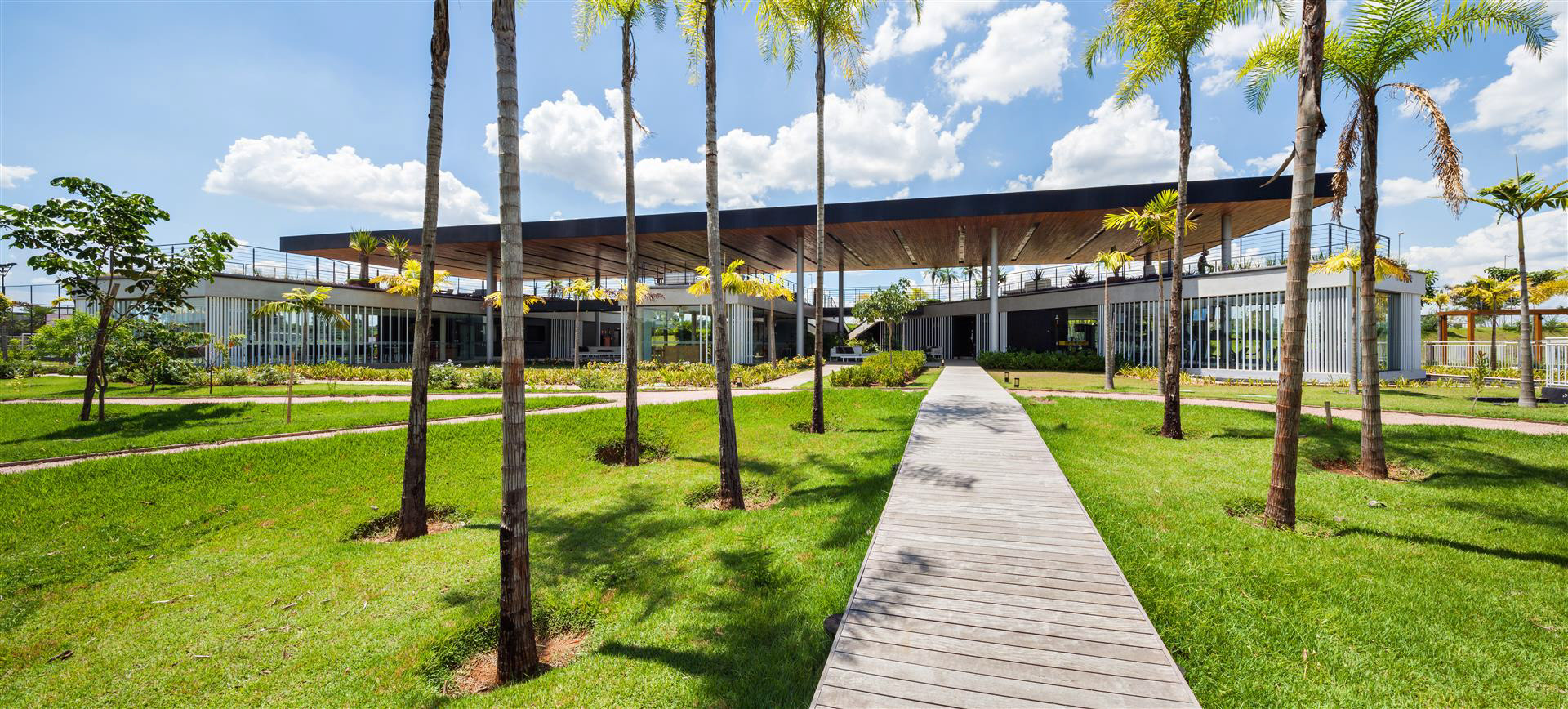 Three linear, non-parallel, blocks implanted in the middle height, with concrete structure and closure mostly in glass and metallic brises organize the main program of the club: party room, kids room, access hall, gymnastics room, changing rooms and spa, as well as living spaces.