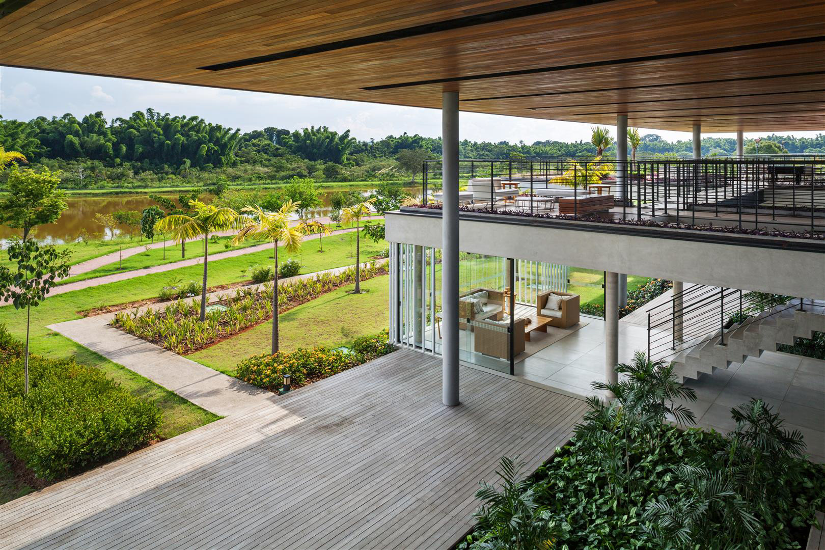 A large metal structure with wood lining covers the upper floor and makes the whole complex look substantial. Sports courts and the pool complex are on the sides of the club.