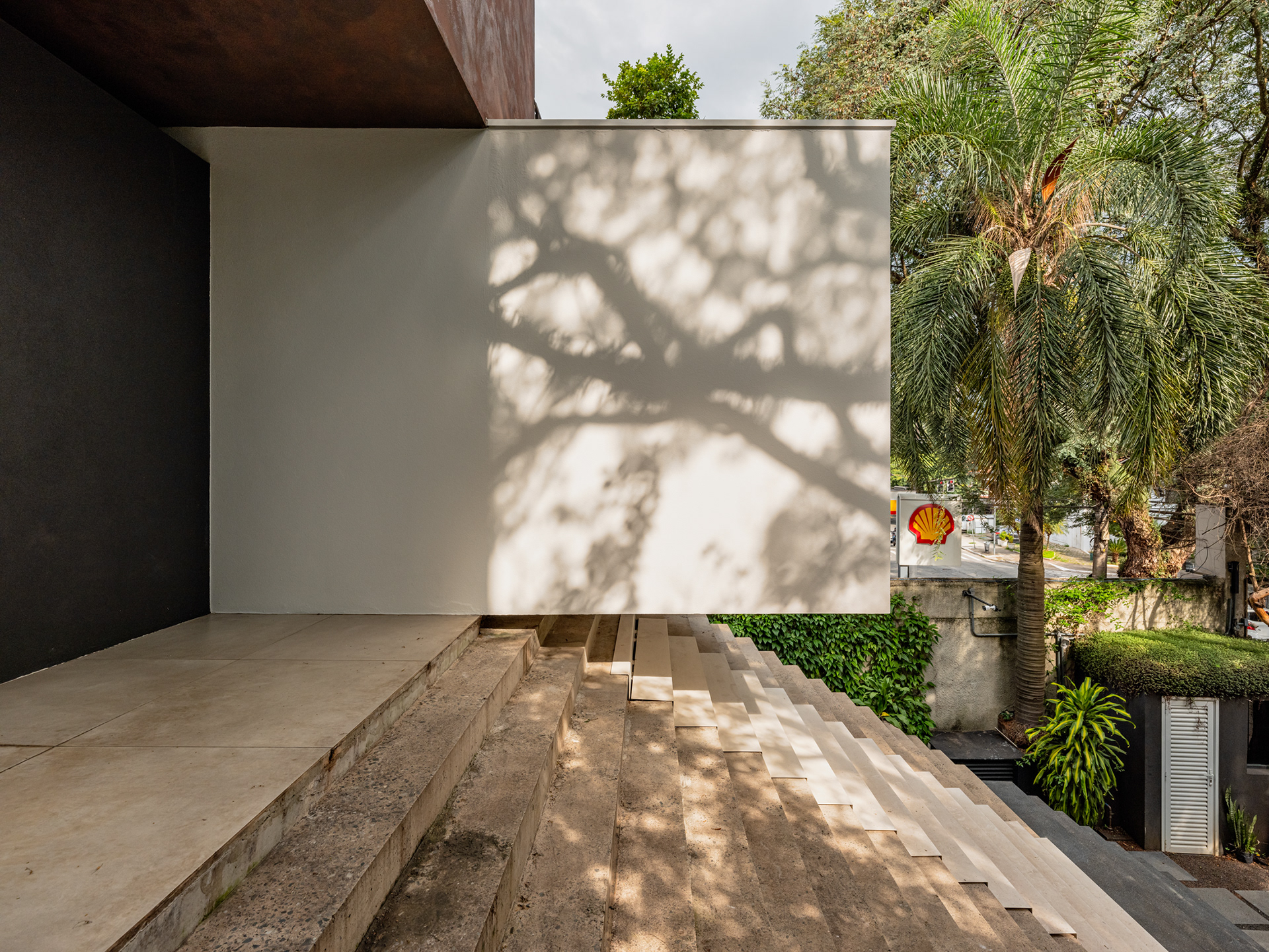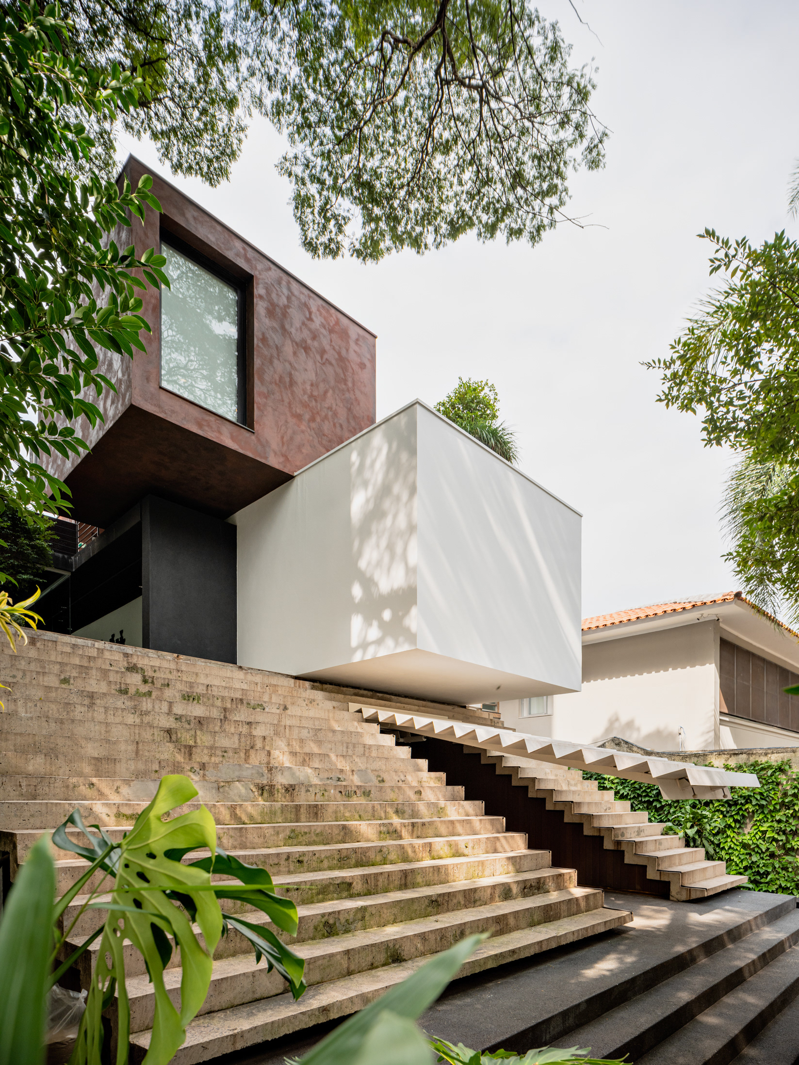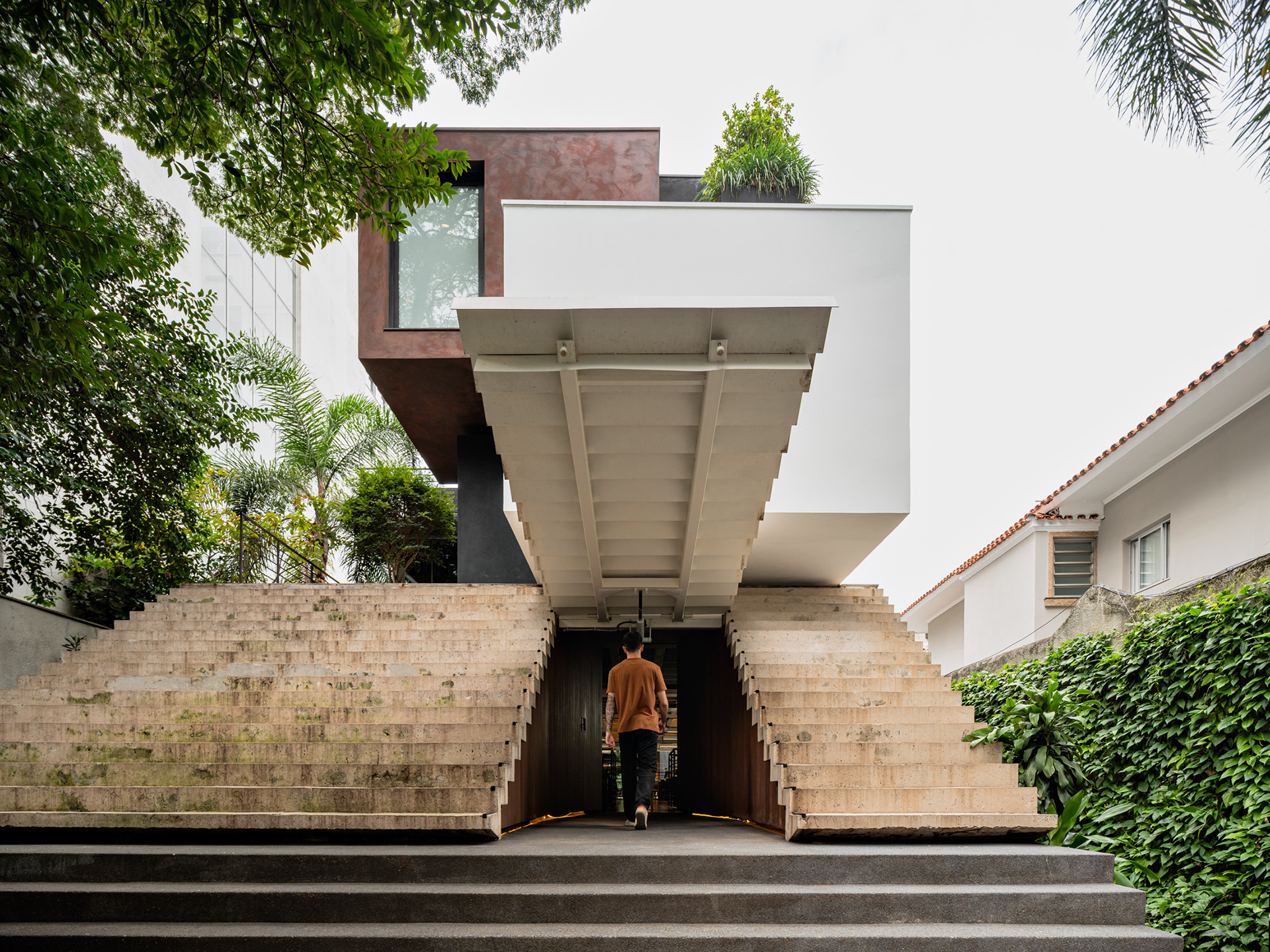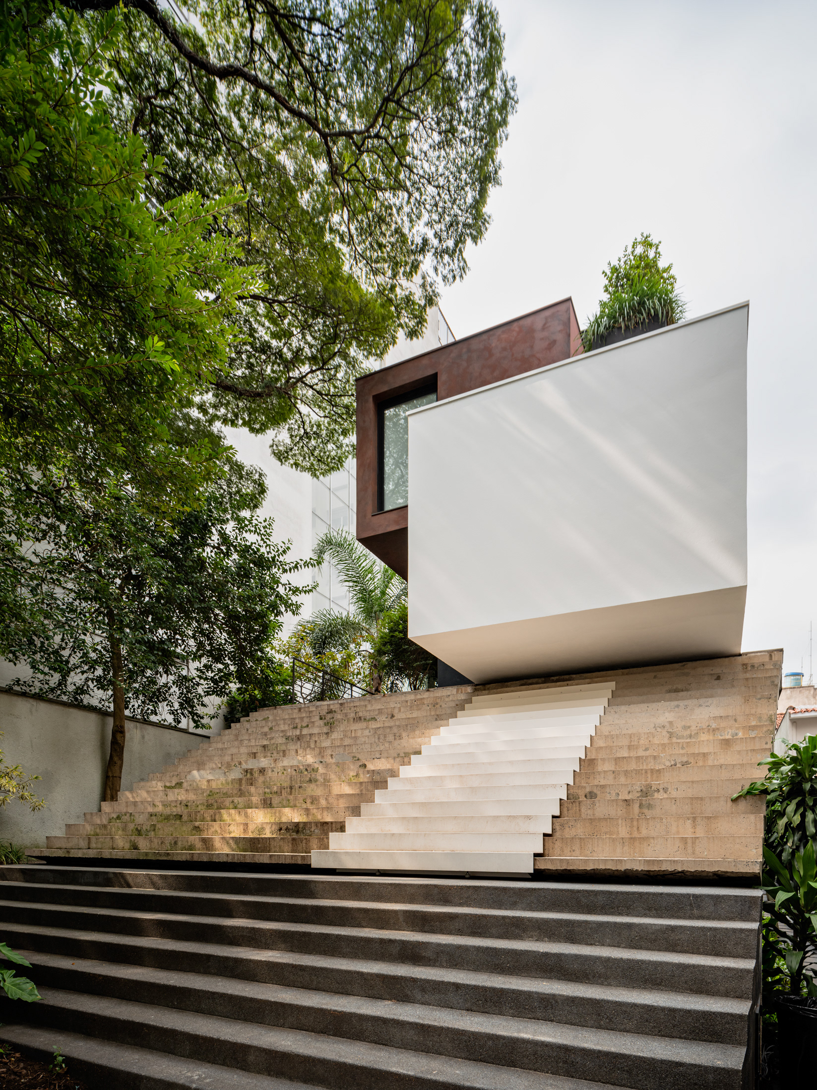 The upper volumes, placed atop the slab that covers the work areas, were treated with distinct textures and finishes as independent elements resting on the large concrete platform and staircase — lending lightness and formal diversity to the composition.