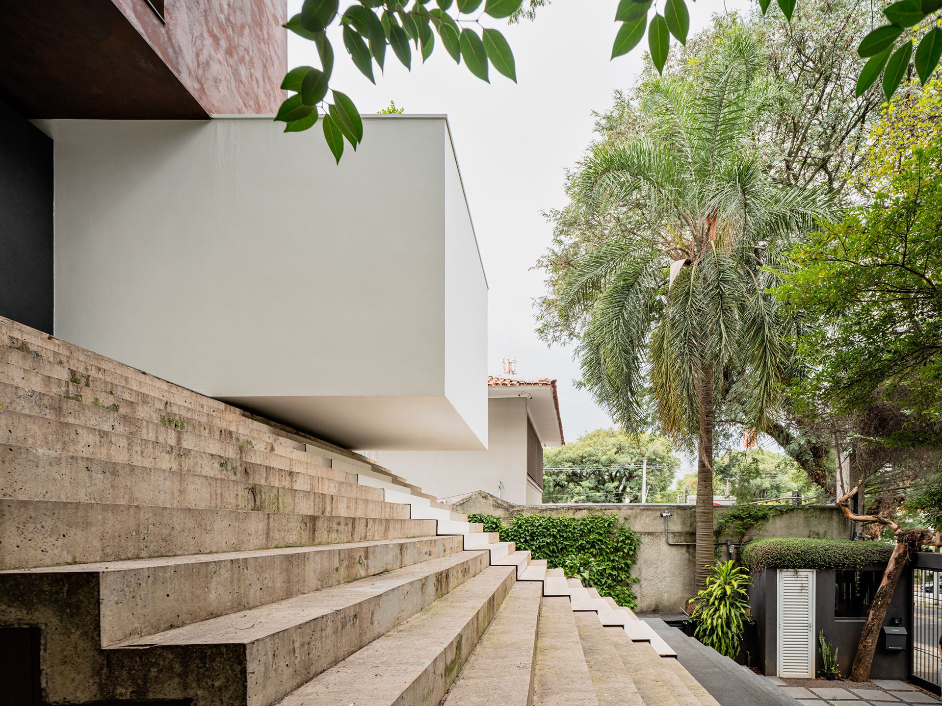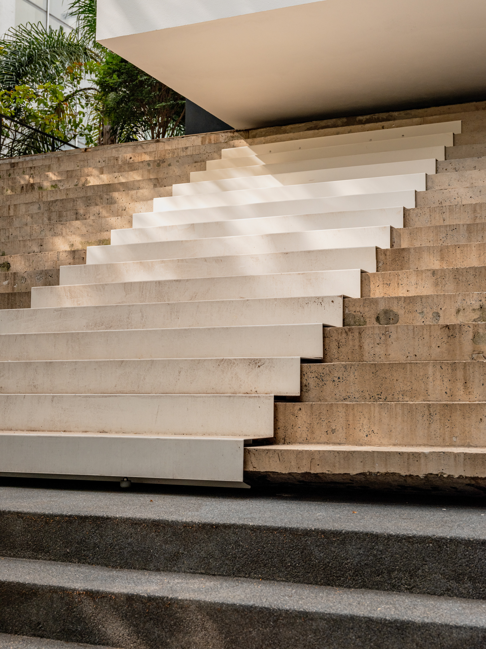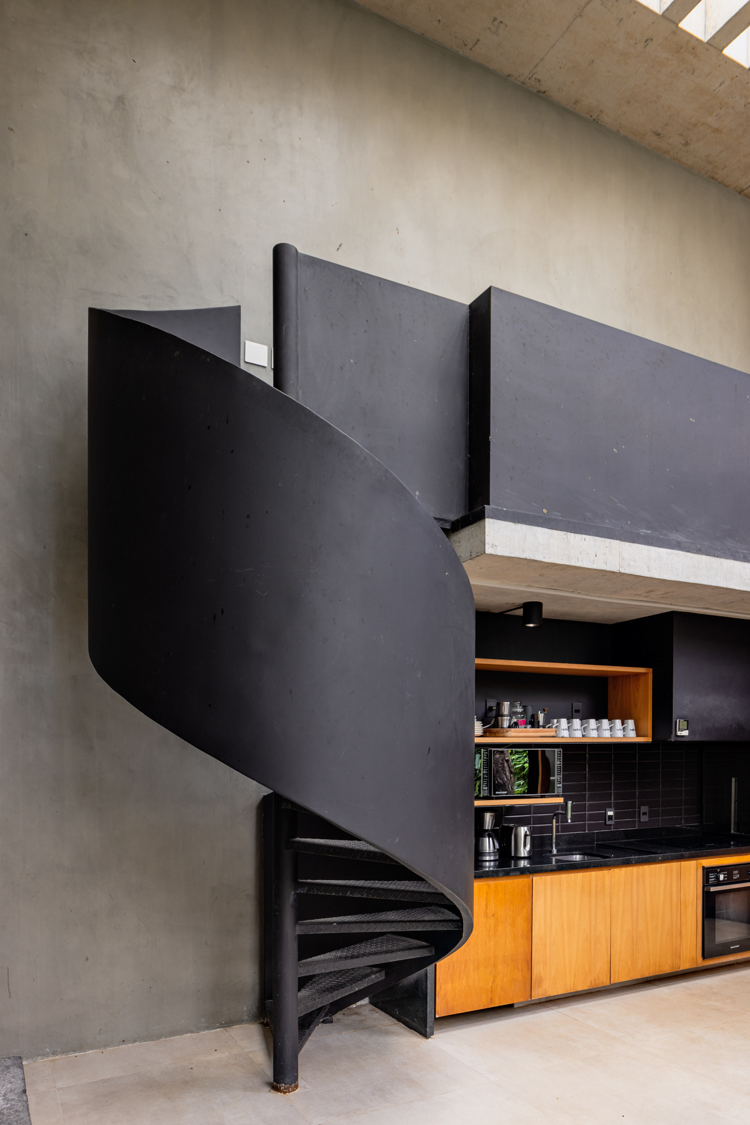The upper volumes, placed atop the slab that covers the work areas, were treated with distinct textures and finishes as independent elements resting on the large concrete platform and staircase — lending lightness and formal diversity to the composition.