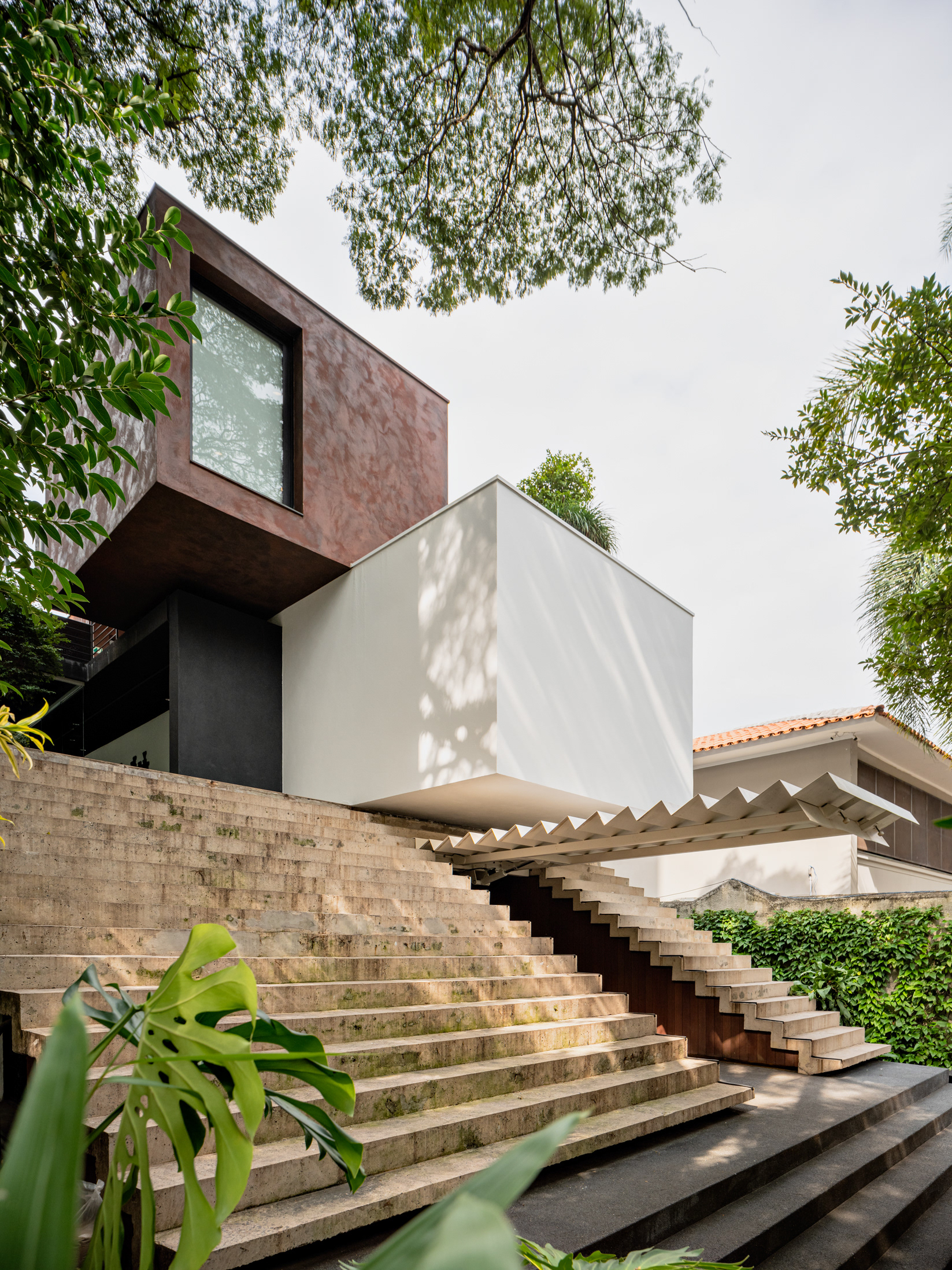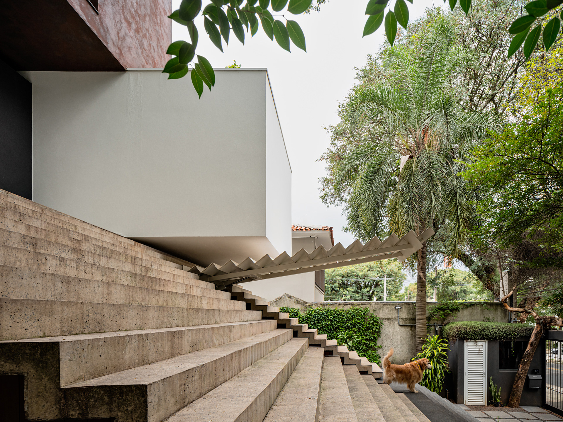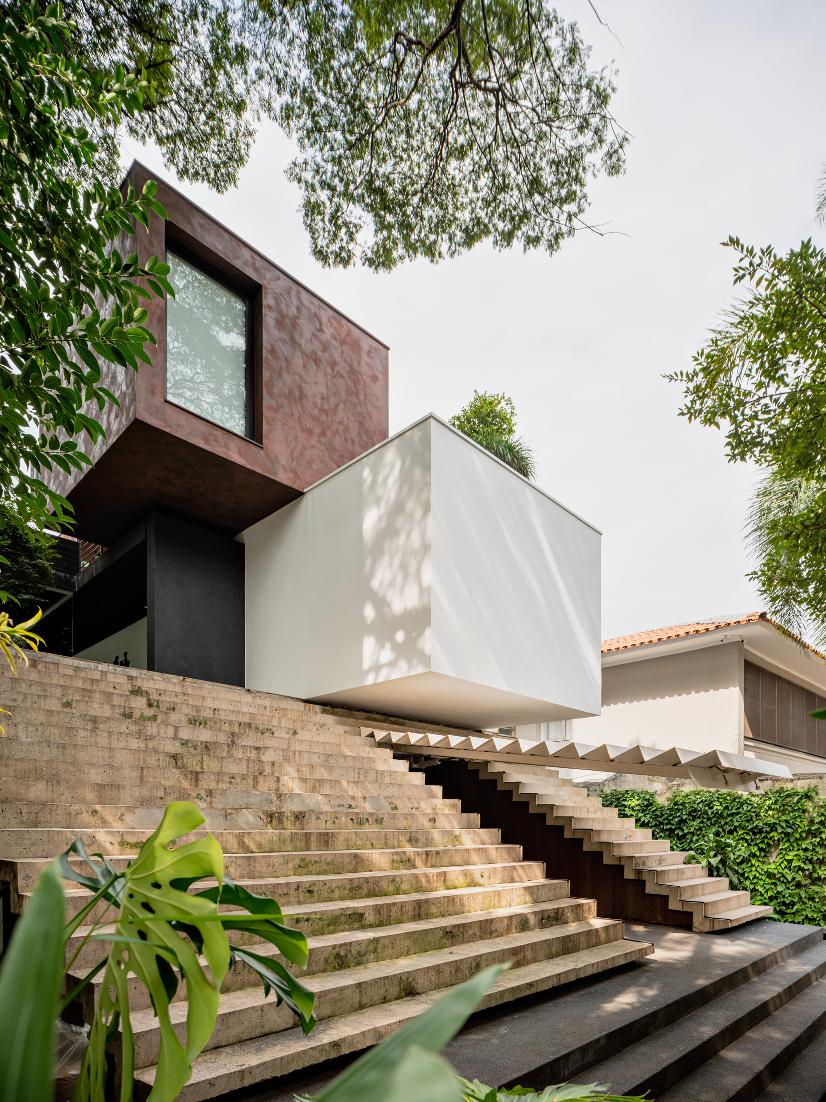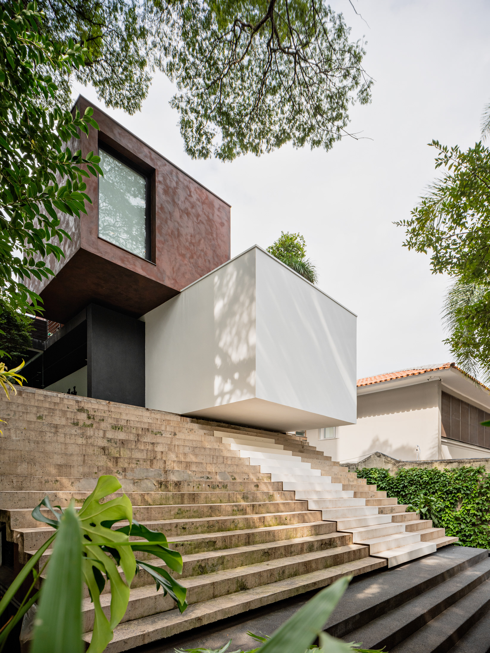 The upper volumes, placed atop the slab that covers the work areas, were treated with distinct textures and finishes as independent elements resting on the large concrete platform and staircase — lending lightness and formal diversity to the composition.