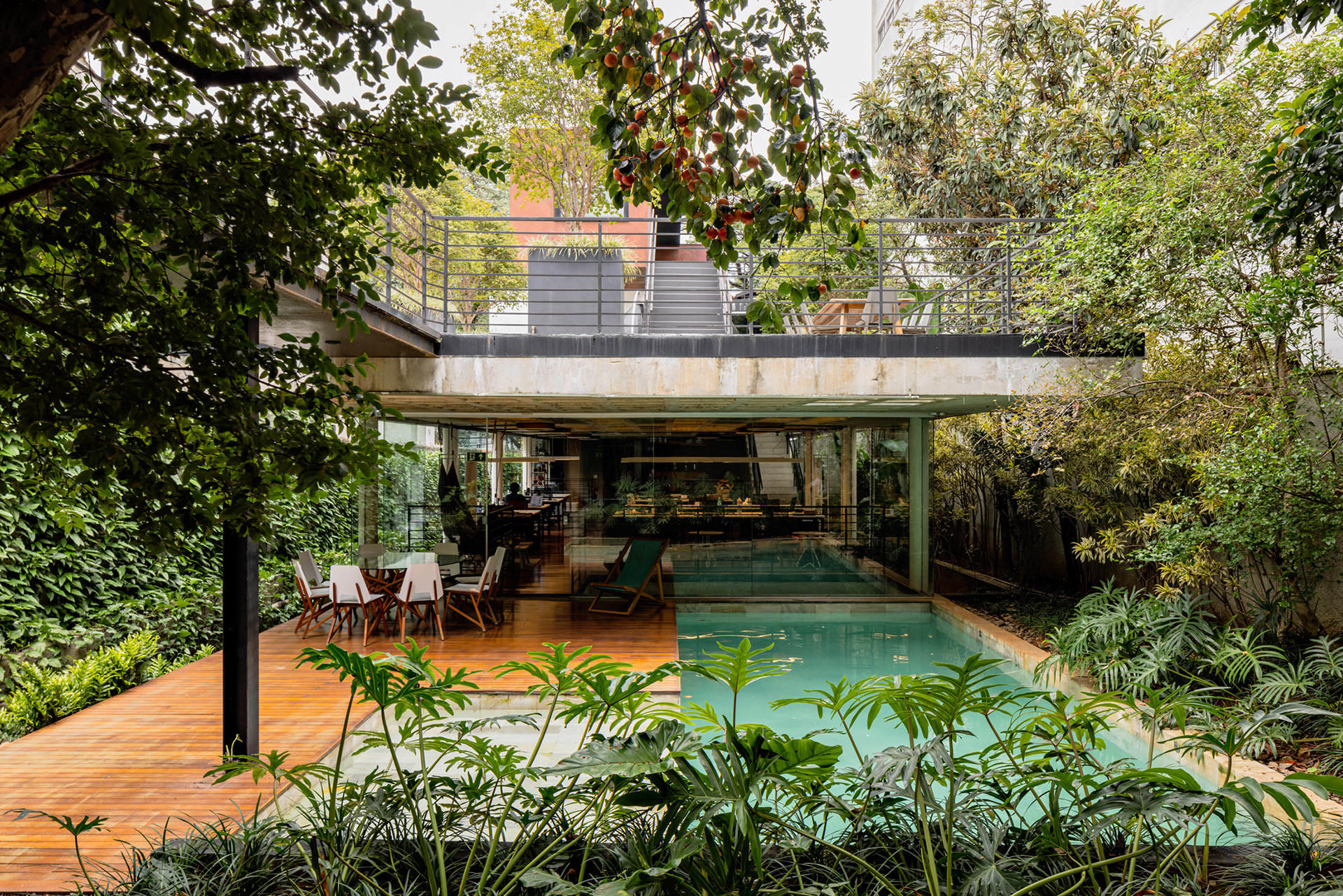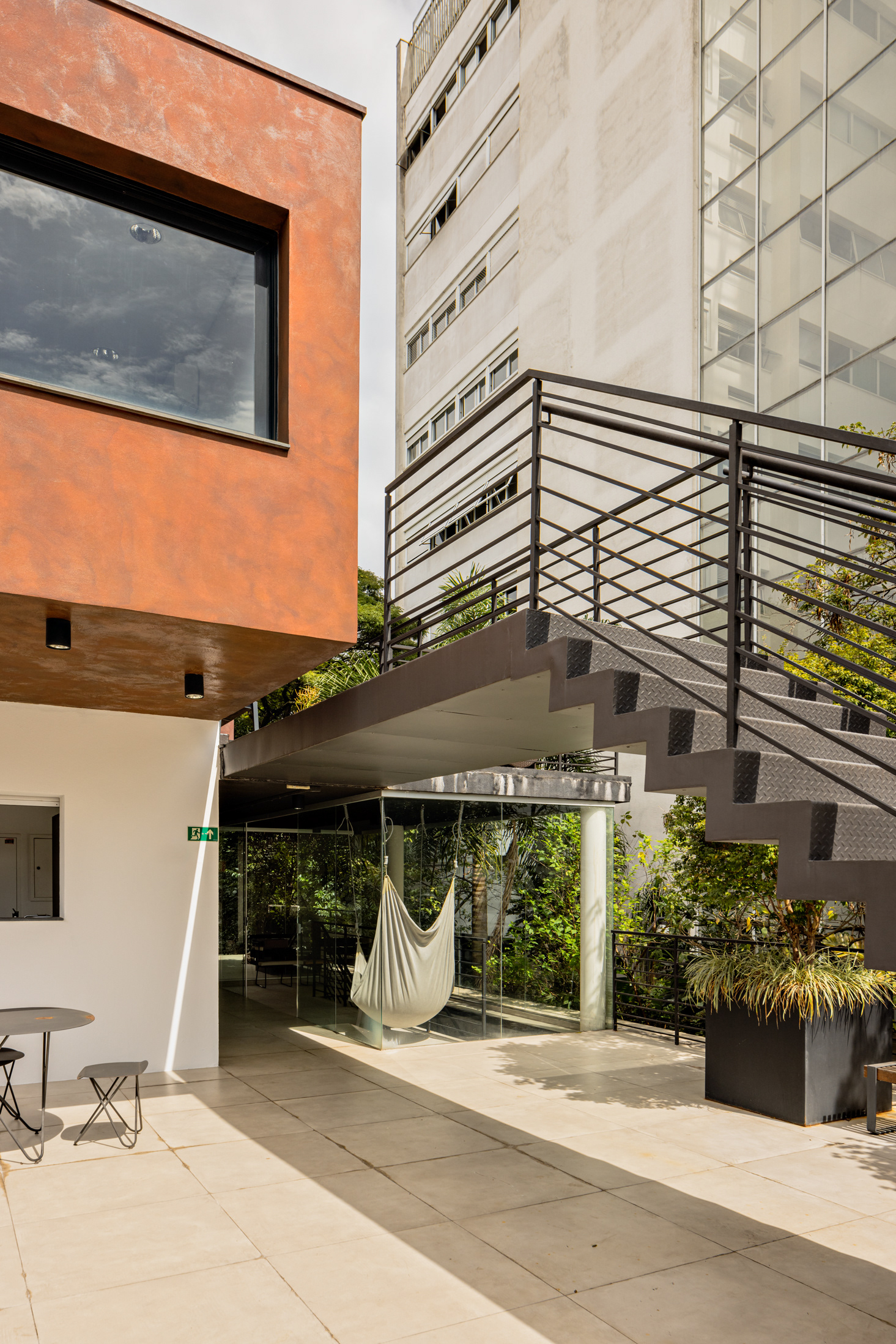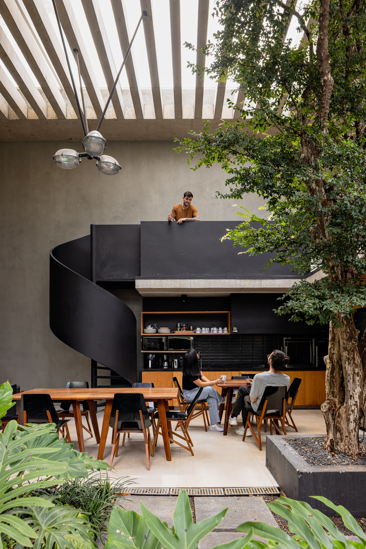 The program extends beyond traditional workspaces. A deck beside the pool serves as an informal meeting room and leisure area for employees, who are encouraged to use the space even on weekends. At the back, a walkway connects the rooftop to a double-height volume housing a gourmet space and social area. This space, also used for events and parties, functions daily as the employees’ dining area, reinforcing the principles of well-being and integration that guide the project.