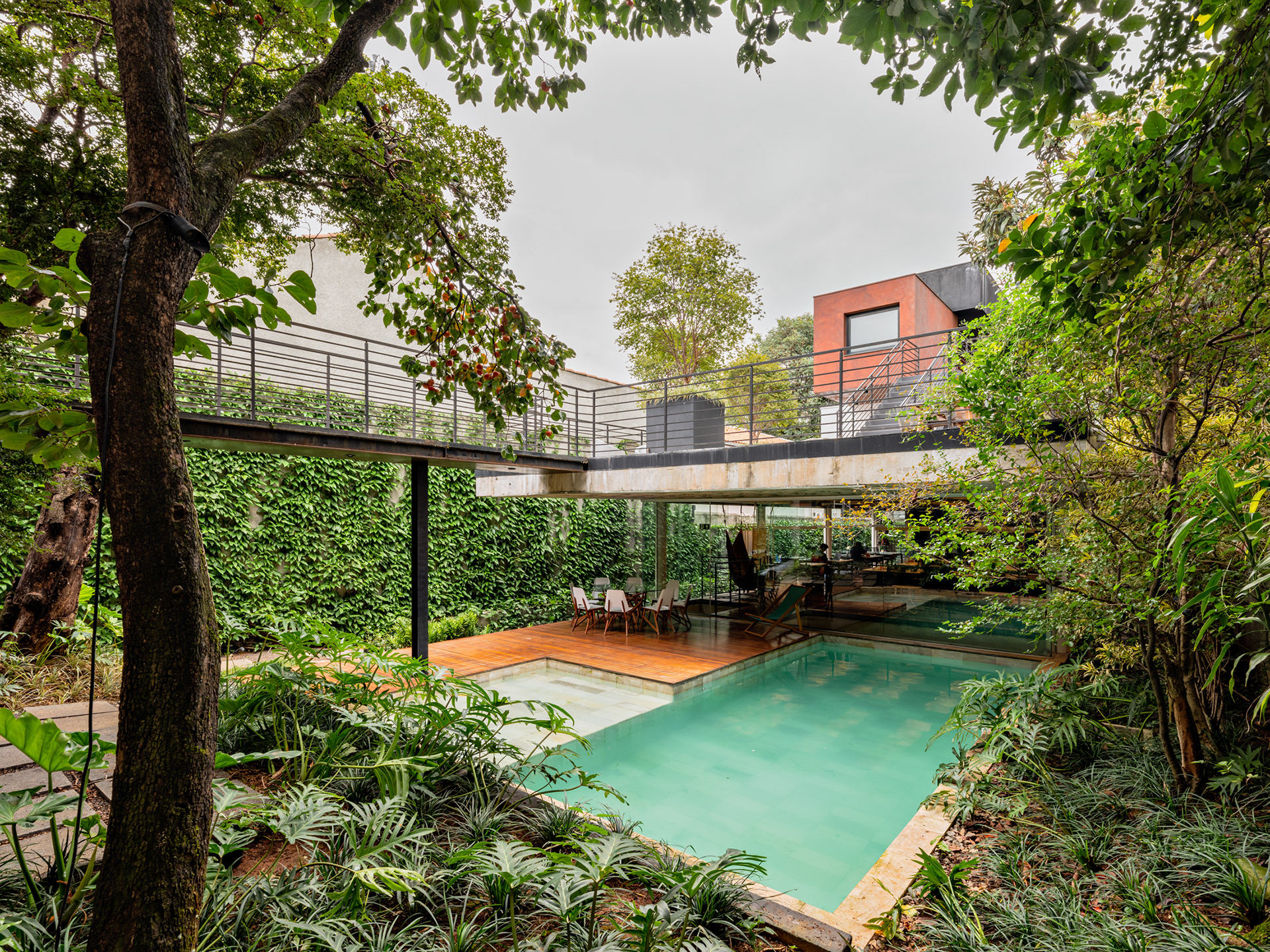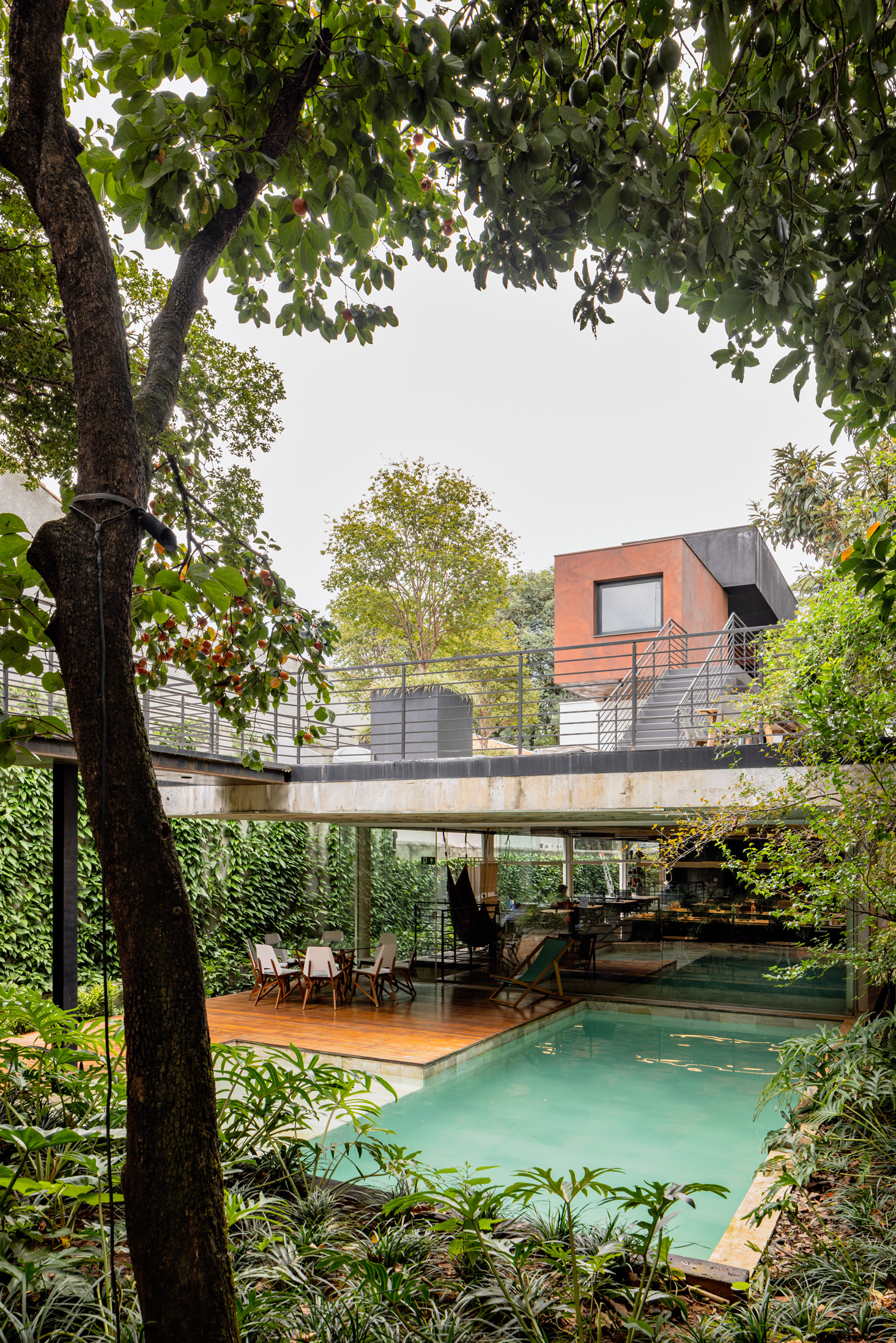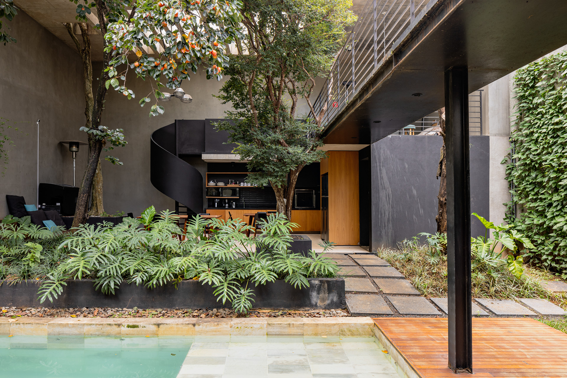 The program extends beyond traditional workspaces. A deck beside the pool serves as an informal meeting room and leisure area for employees, who are encouraged to use the space even on weekends. At the back, a walkway connects the rooftop to a double-height volume housing a gourmet space and social area. This space, also used for events and parties, functions daily as the employees’ dining area, reinforcing the principles of well-being and integration that guide the project.