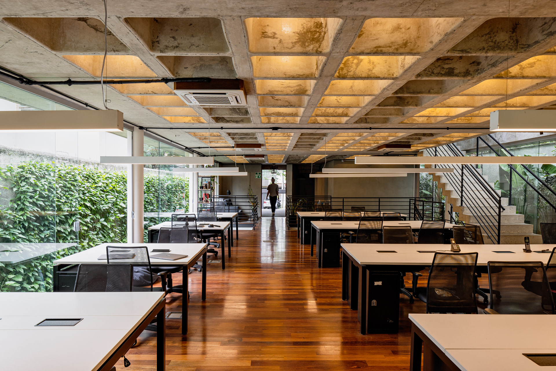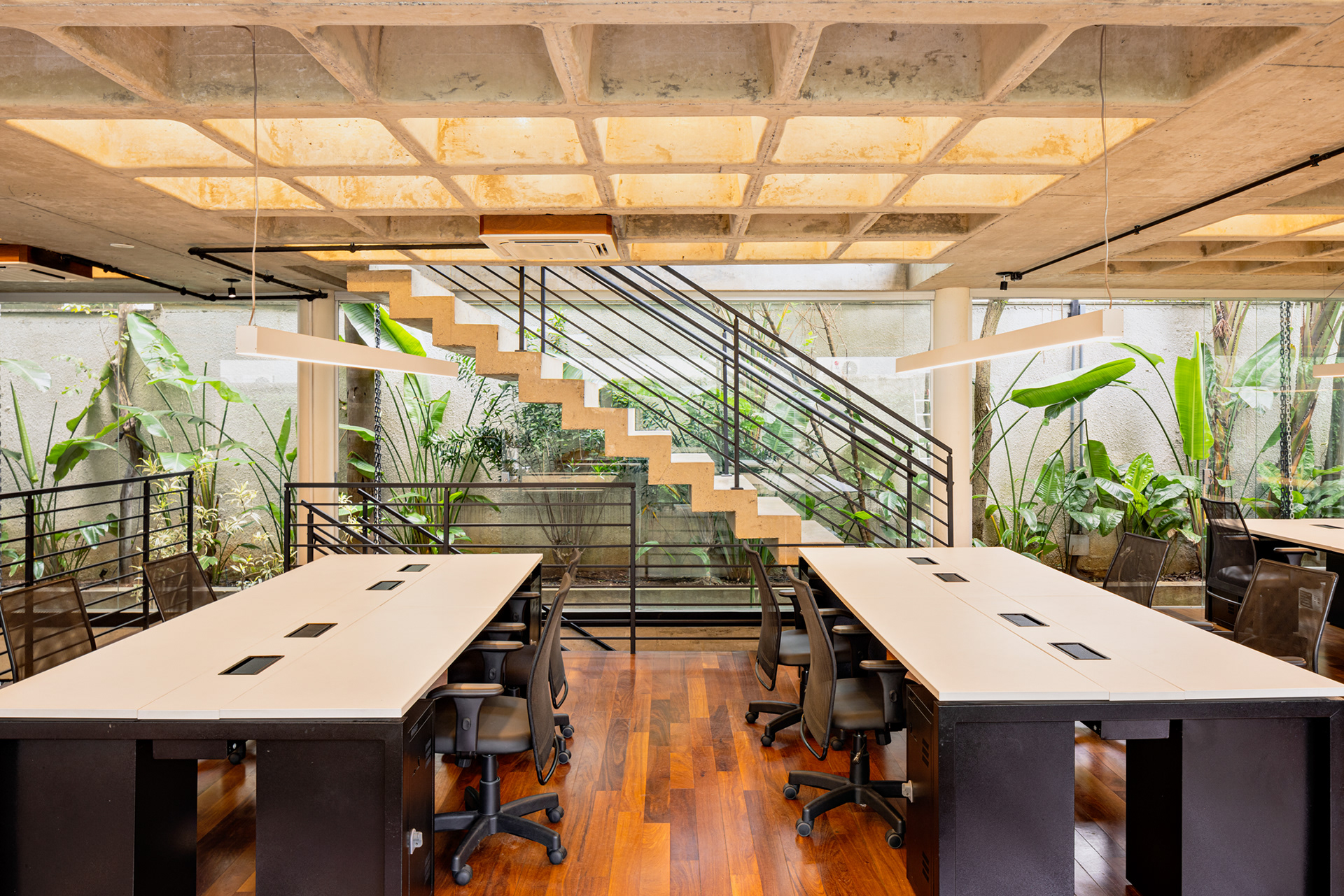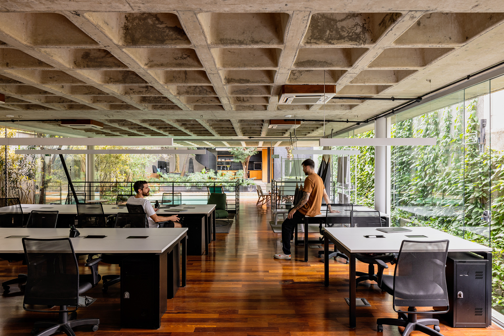 The work environment is characterized by raw yet refined materials, such as exposed concrete and large glass panels that open onto side gardens on both floors. The structural system of waffle slabs integrates indirect lighting fixtures designed by Marcos Castilha, providing soft and pleasant illumination. The layout was conceived to be fully flexible, adaptable to the agile (Scrum) work methodology adopted by the company — with custom-designed furniture, standing workstations, and meeting areas that can be reorganized as needed.