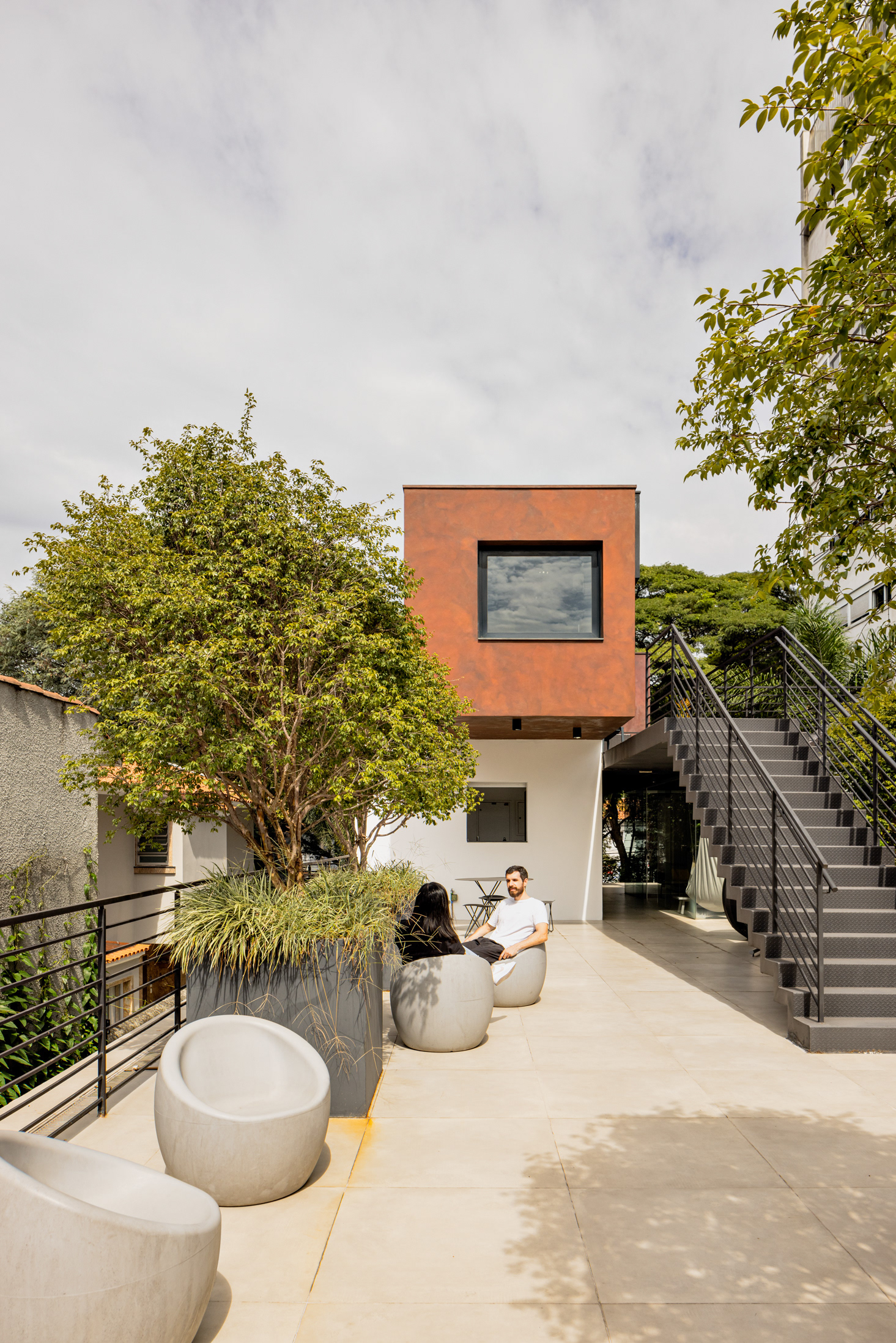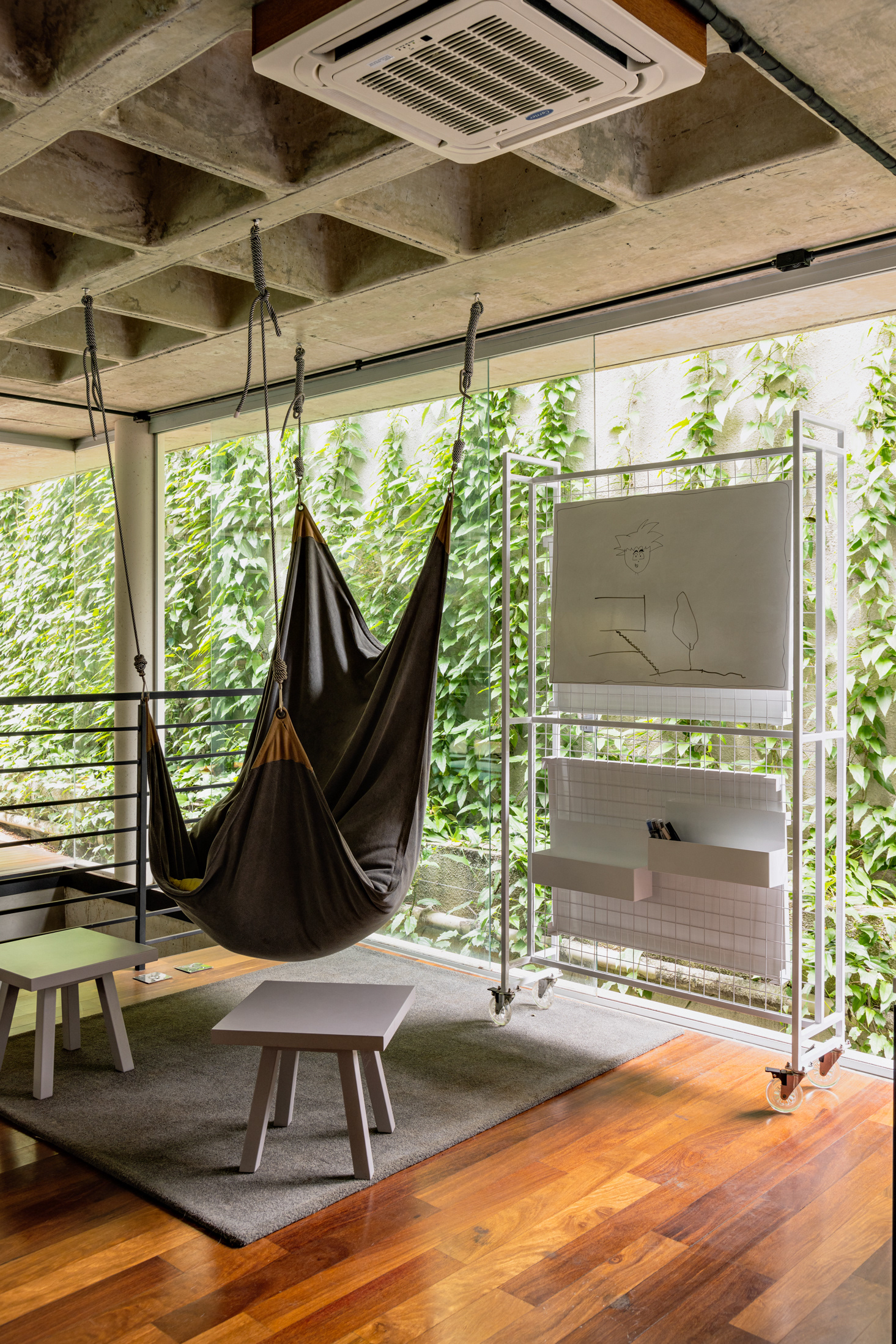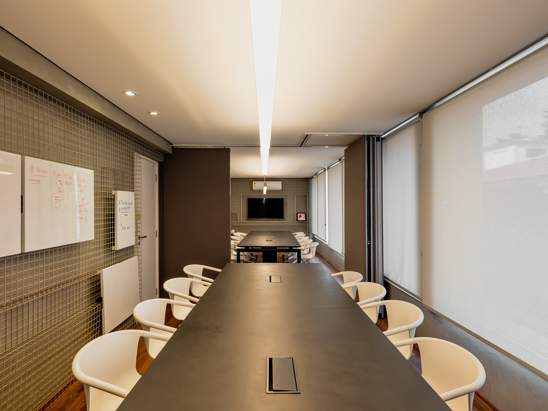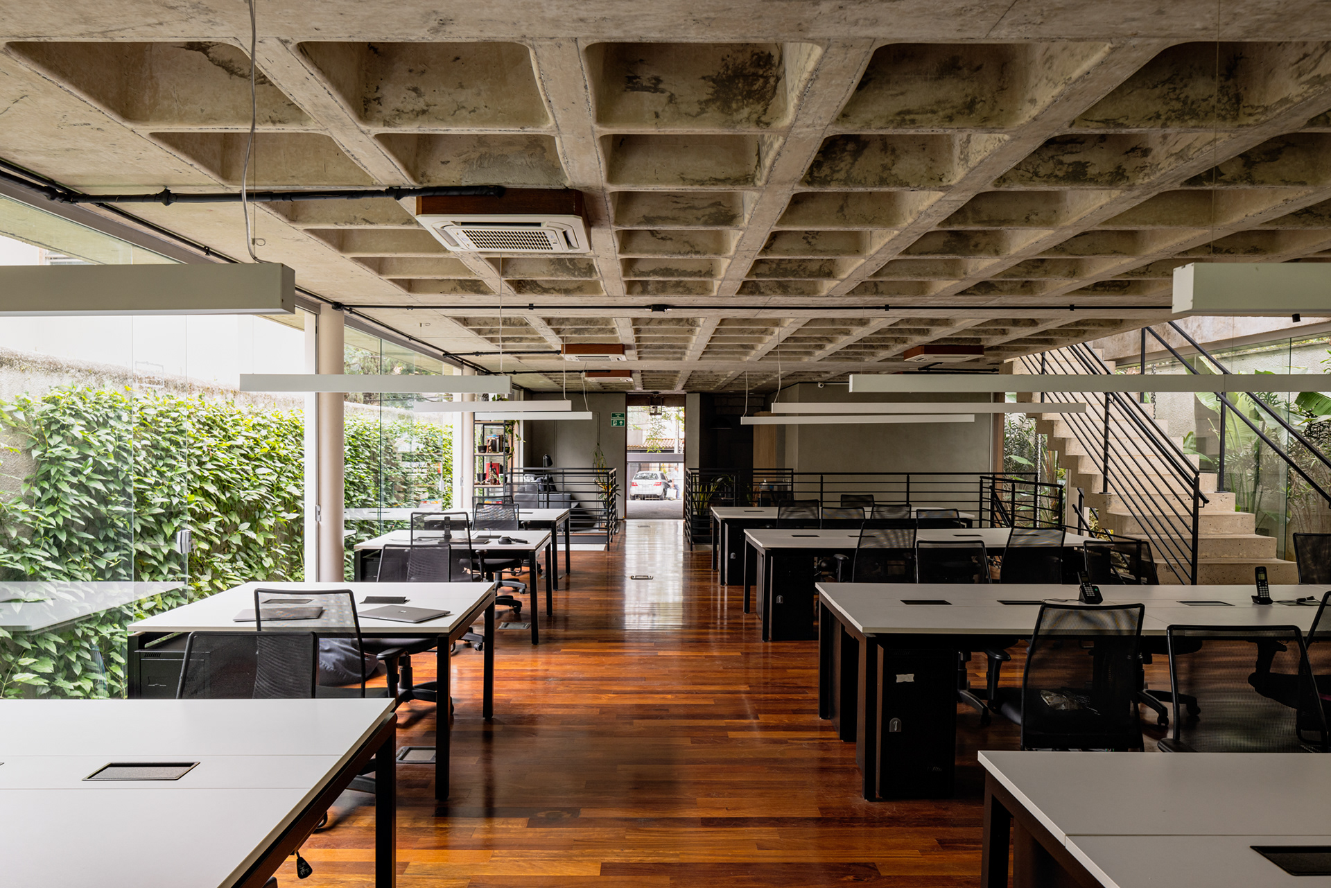 The work environment is characterized by raw yet refined materials, such as exposed concrete and large glass panels that open onto side gardens on both floors. The structural system of waffle slabs integrates indirect lighting fixtures designed by Marcos Castilha, providing soft and pleasant illumination. The layout was conceived to be fully flexible, adaptable to the agile (Scrum) work methodology adopted by the company — with custom-designed furniture, standing workstations, and meeting areas that can be reorganized as needed.