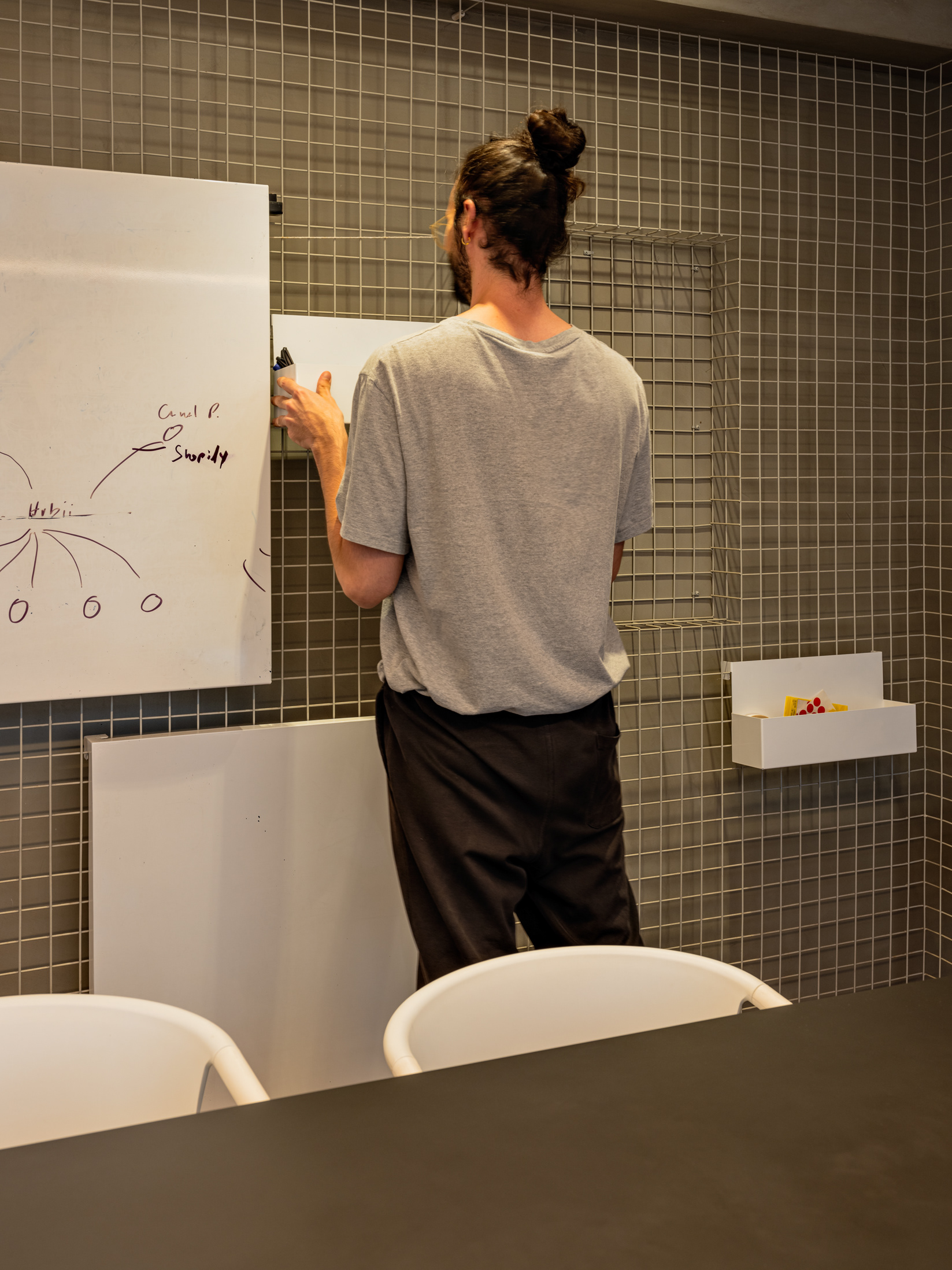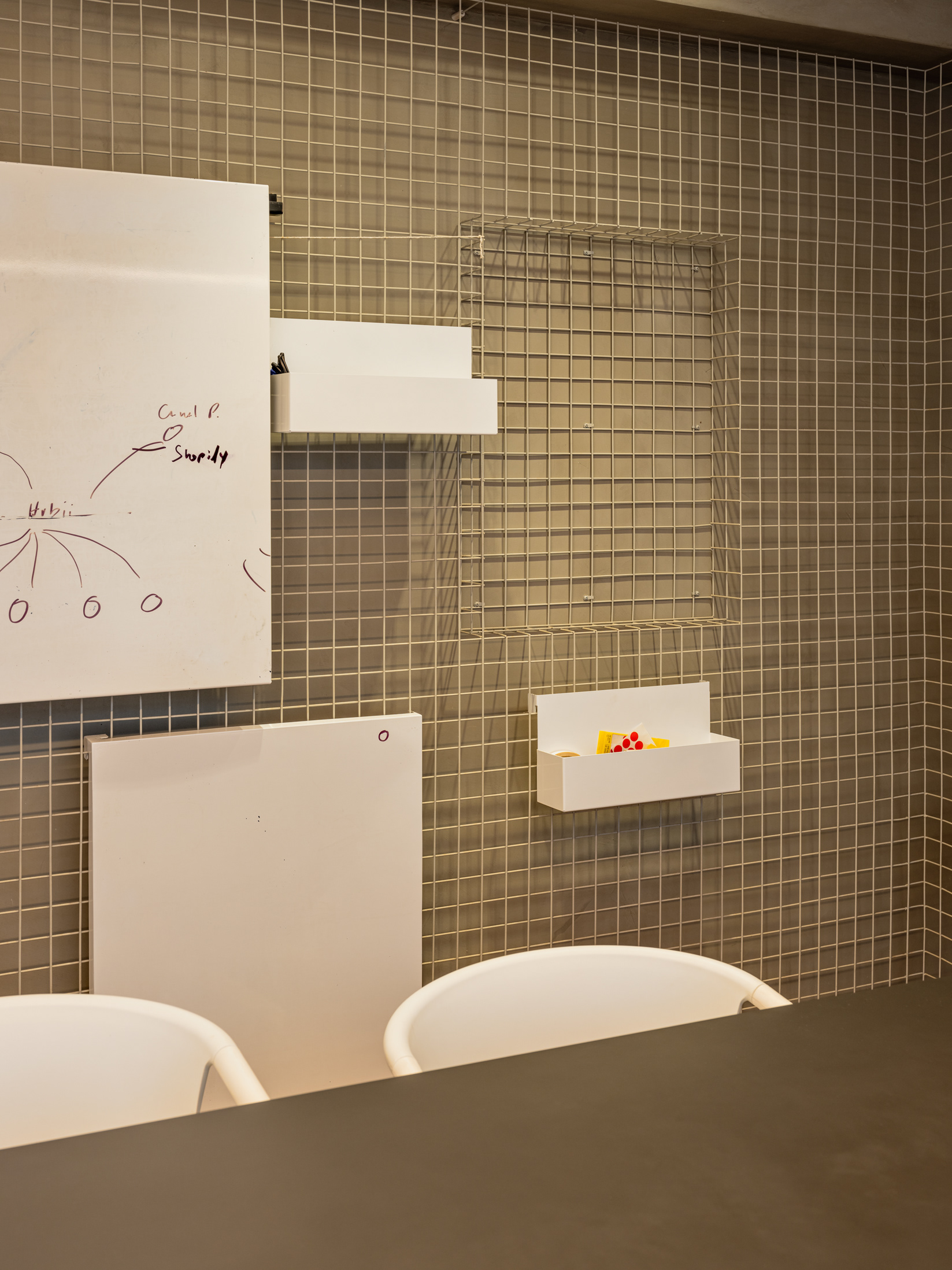 On the façade, a large front staircase — which also functions as seating for events — invites the public into the space. A fully retractable gate reinforces the integration with the street, operating like a gallery that opens onto the city. This main staircase leads visitors directly to the upper floor, where the meeting rooms are located, and further on to the rooftop at the back, which includes two additional rooms designed for more informal meetings or workshops.